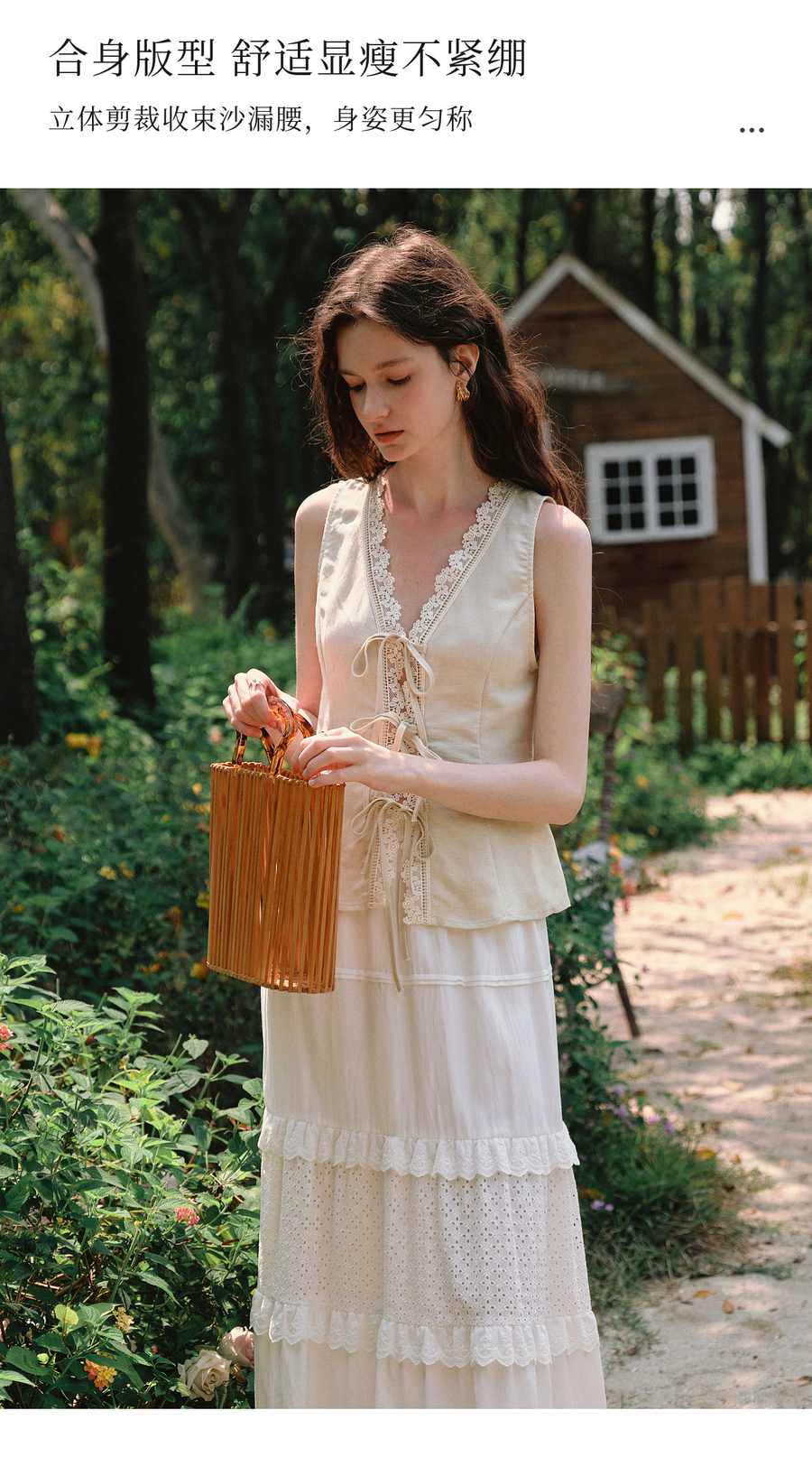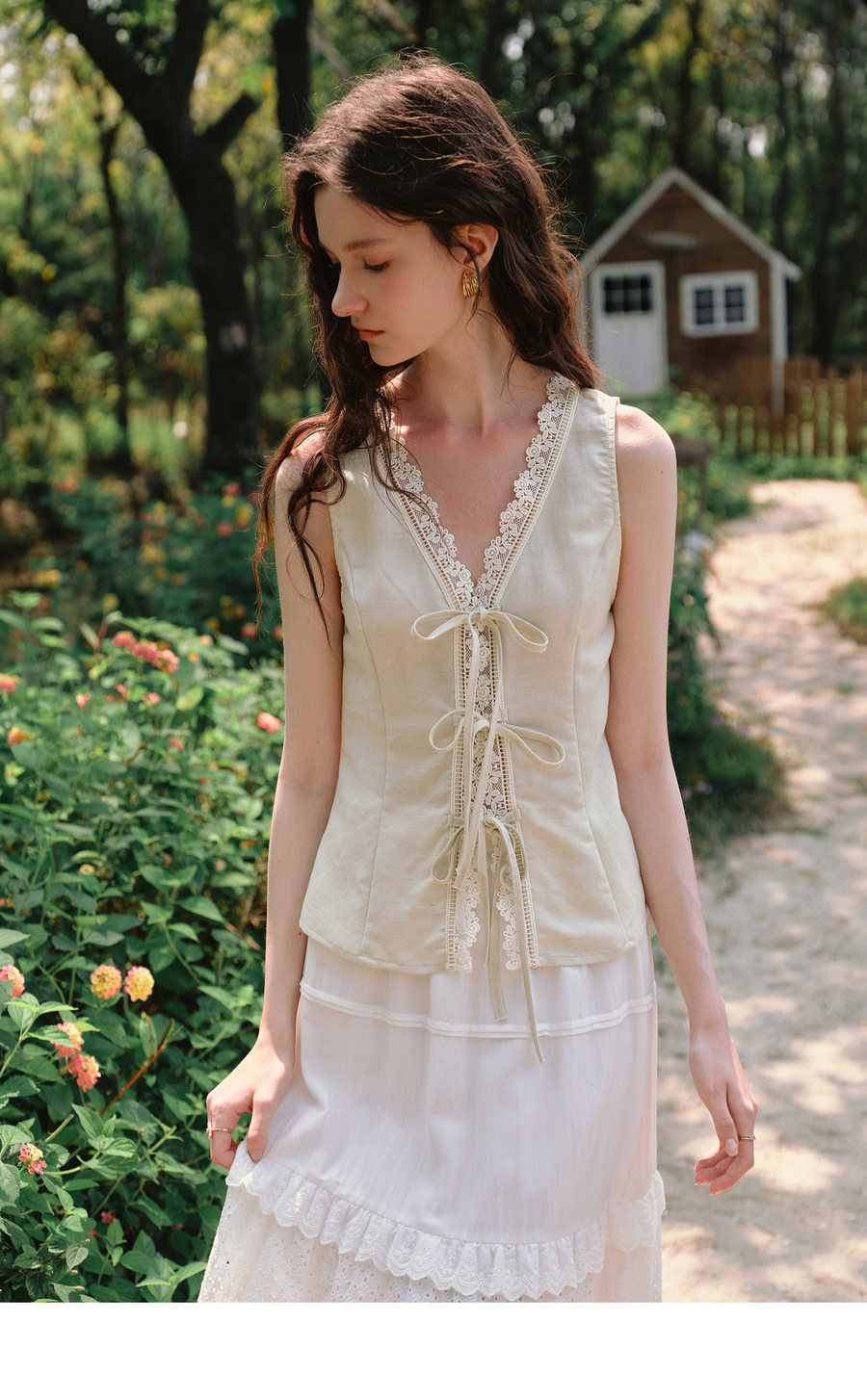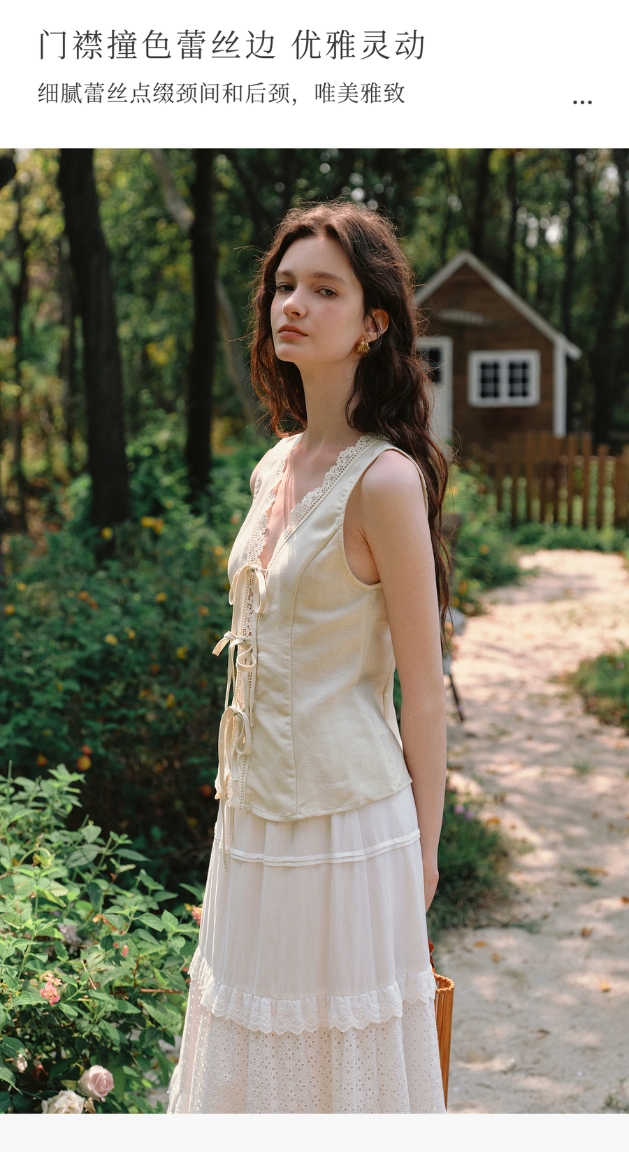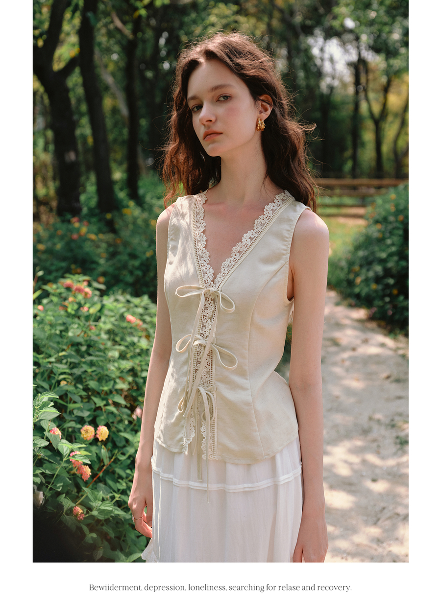 OLrain欧芮儿法式V领小衫夏季2025新款甜美纯欲蕾丝拼接系带背心