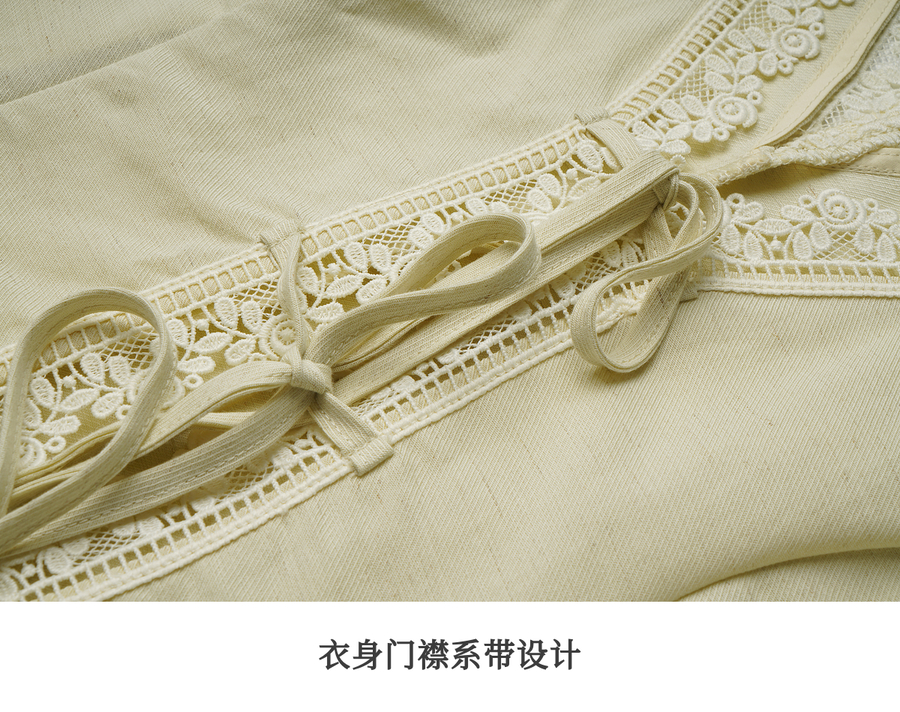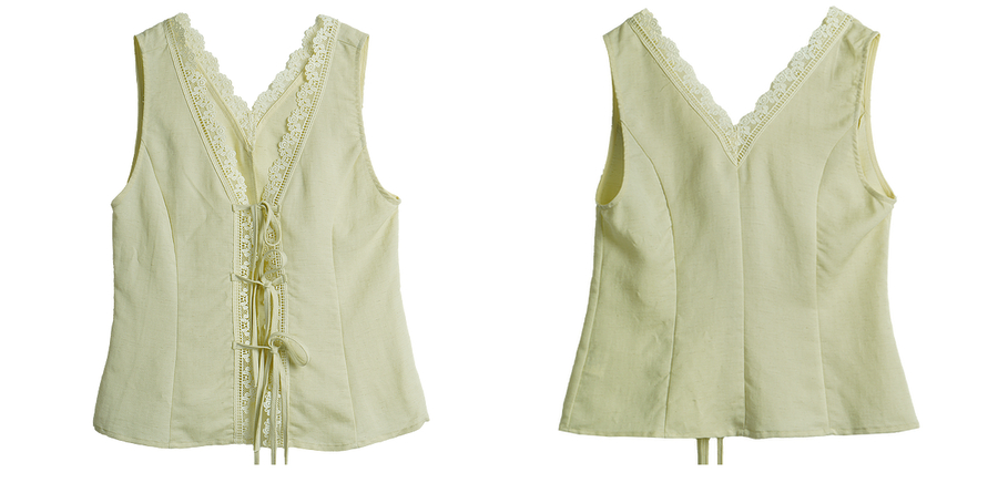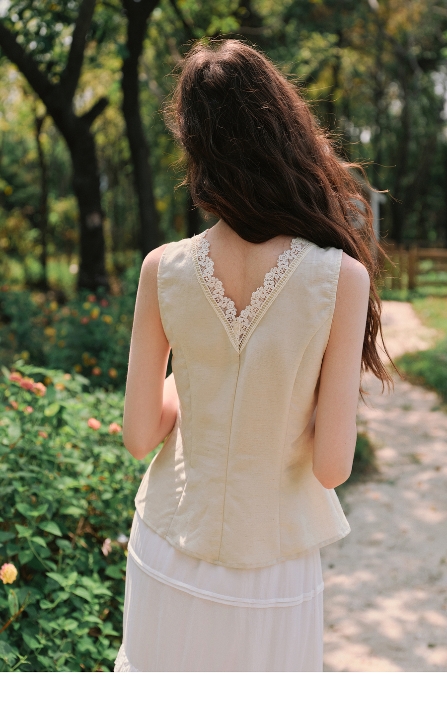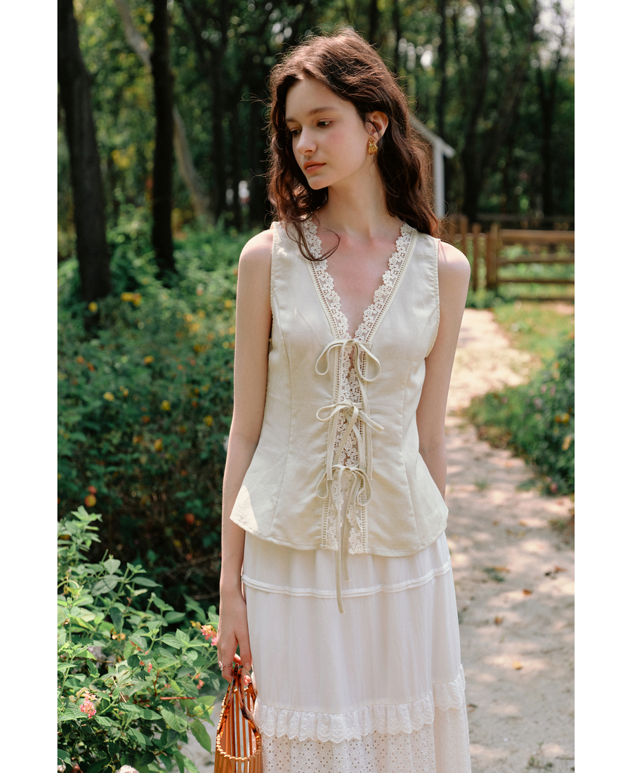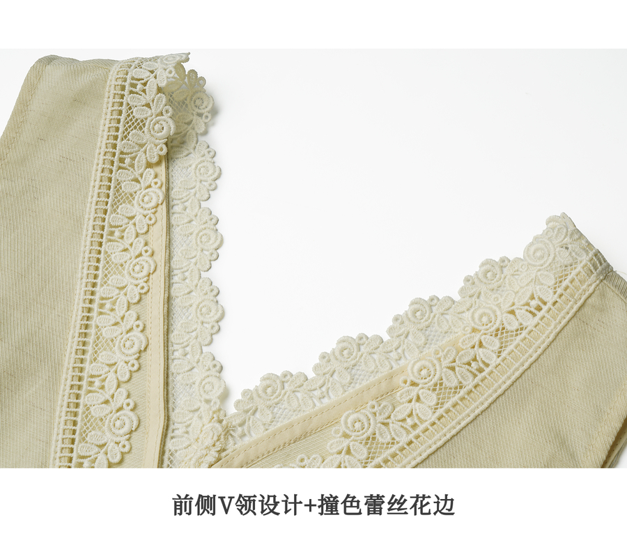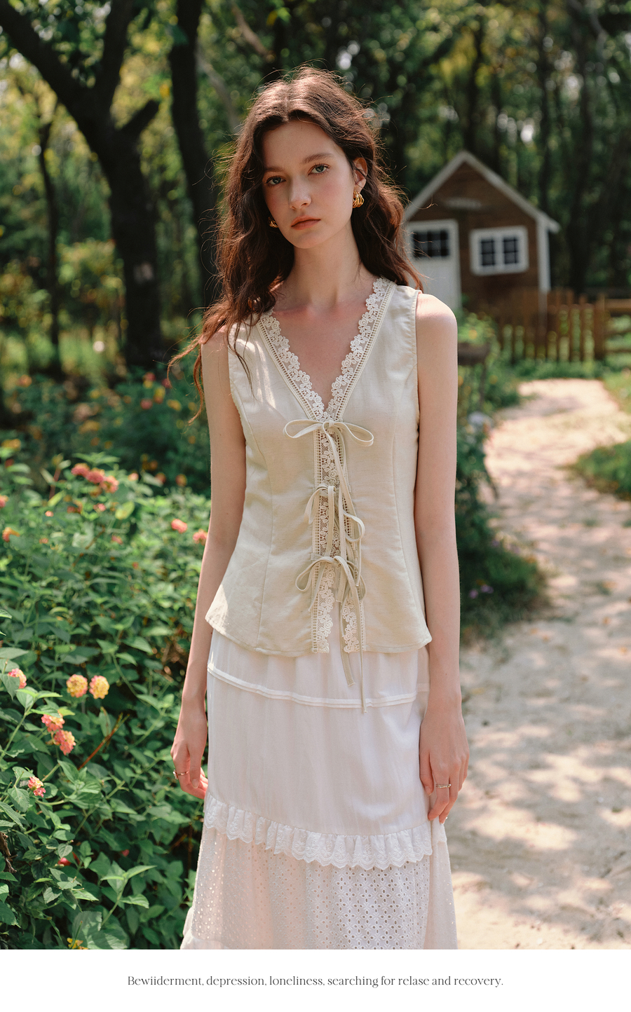 OLrain欧芮儿法式V领小衫夏季2025新款甜美纯欲蕾丝拼接系带背心