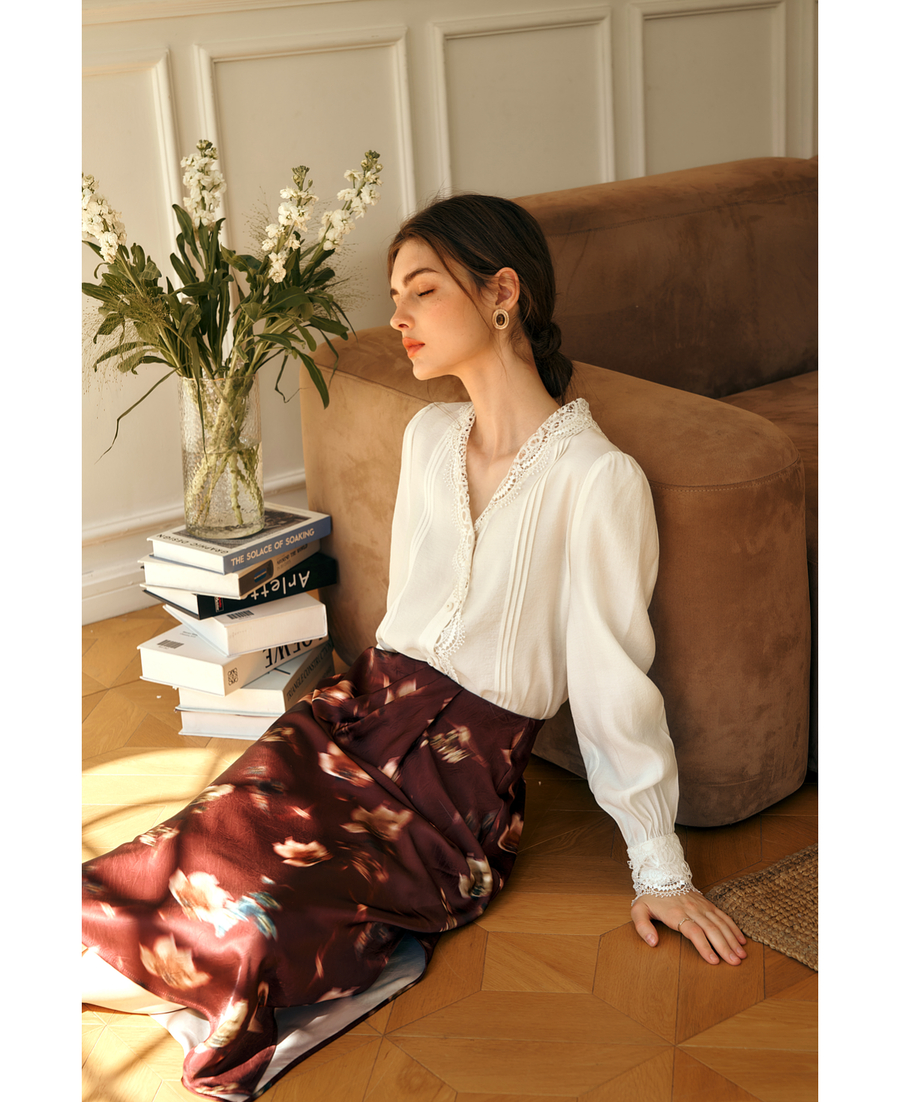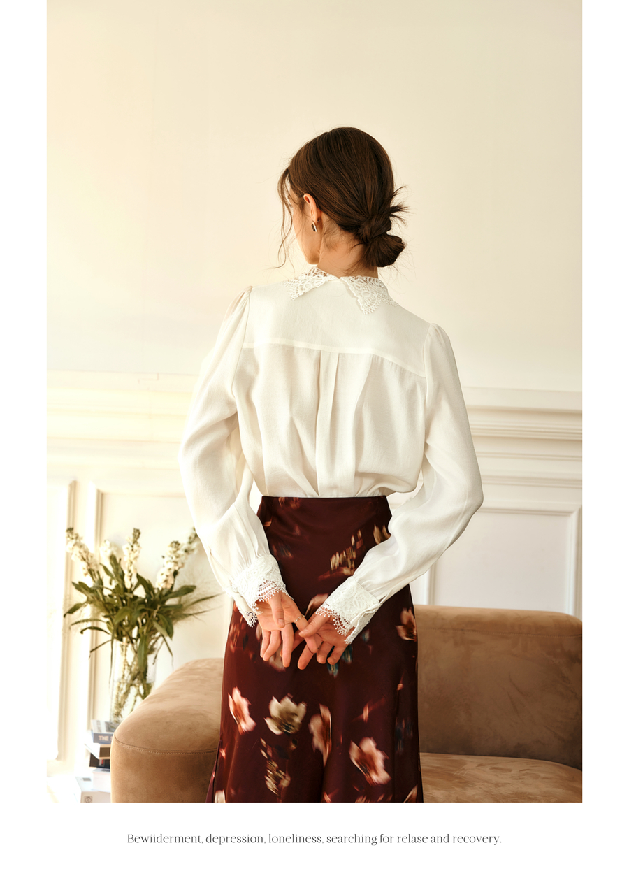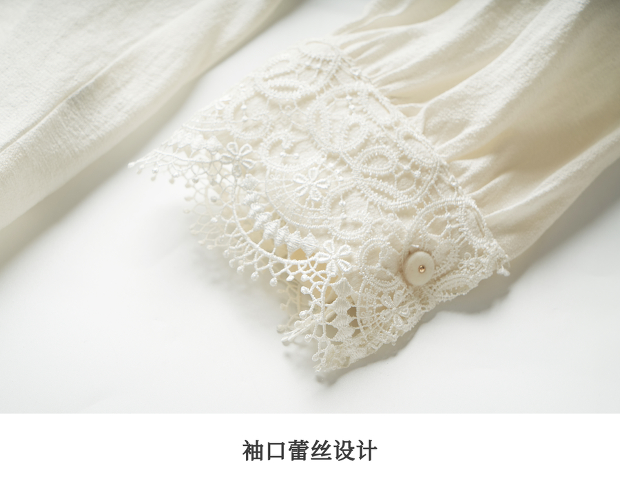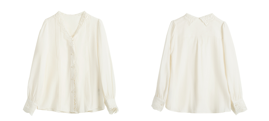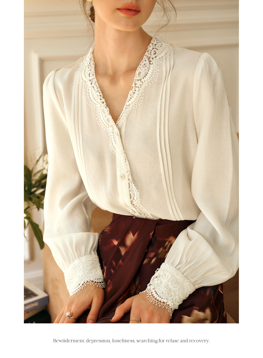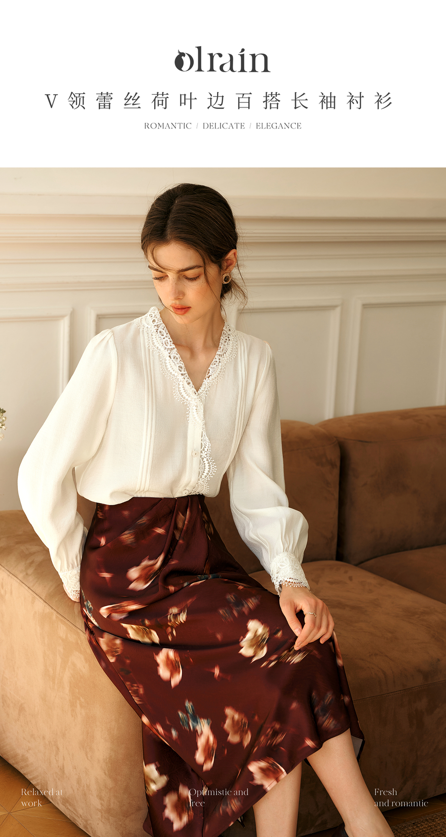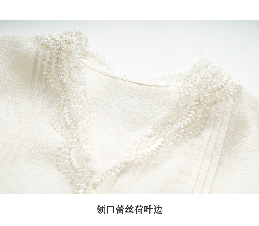 OLrain欧芮儿法式v领衬衫女春季2025年新款气质荷叶边蕾丝边上衣