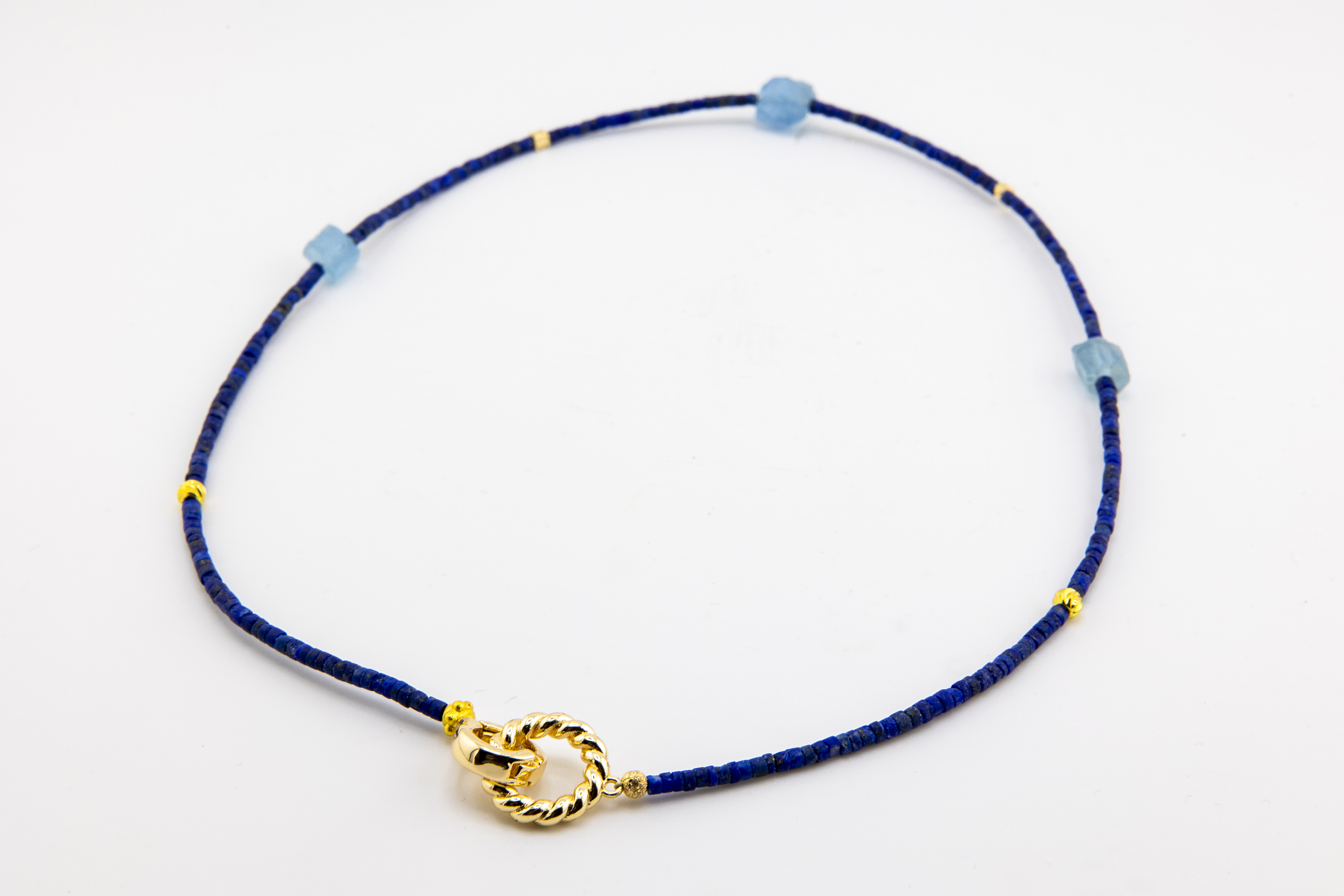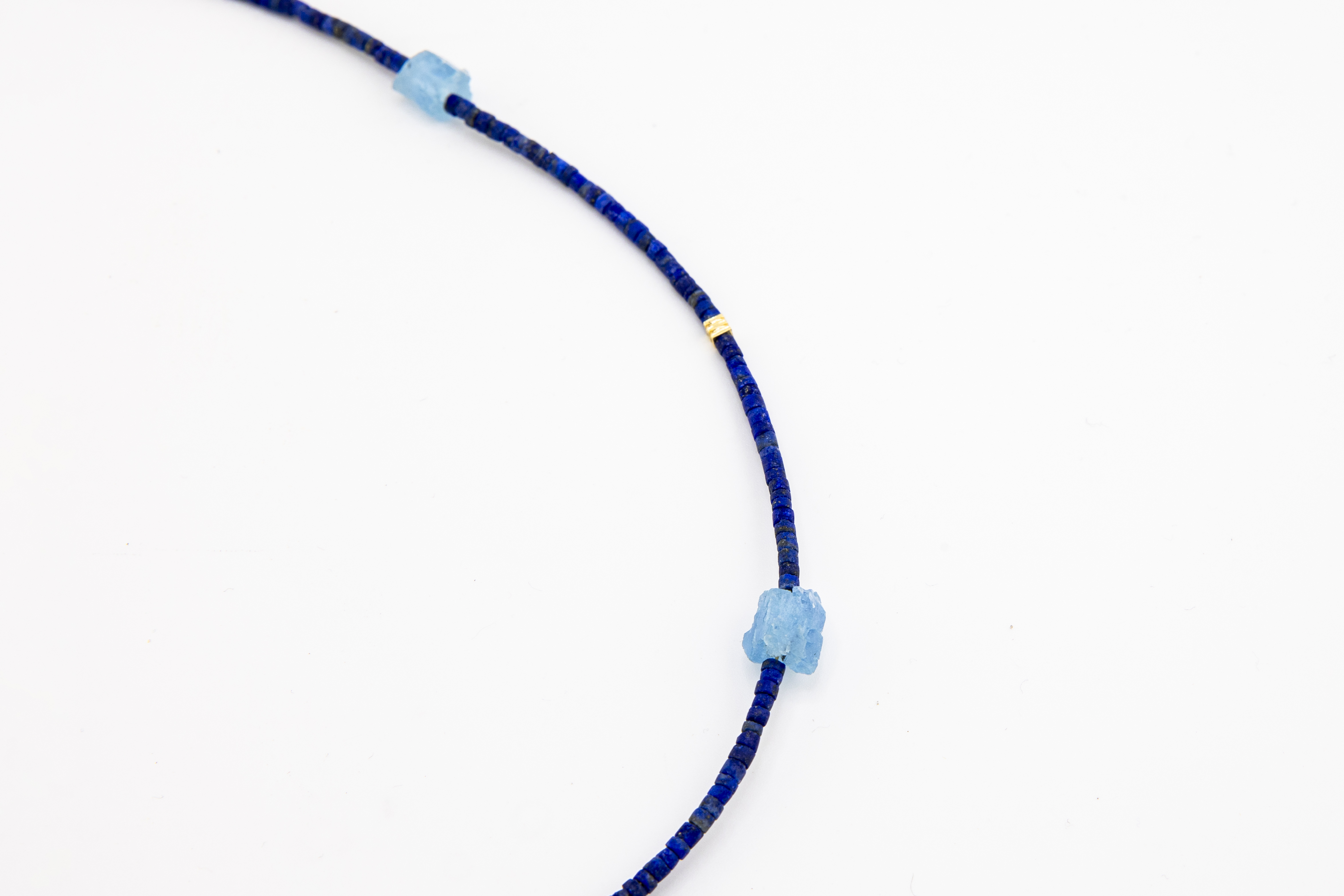 【设计说明】1.天然无加色青金石,9月生辰玉,带金带白,纯天然原石颜色略微分布不均。2.海蓝宝原石,3月生辰石,象征沟通和勇气,天然原石,形状不一,介意慎拍。3.扣头为合金配件遇水不褪色,不建议佩戴洗澡,如遇化学产品腐蚀存在掉色风险。