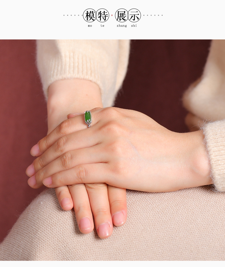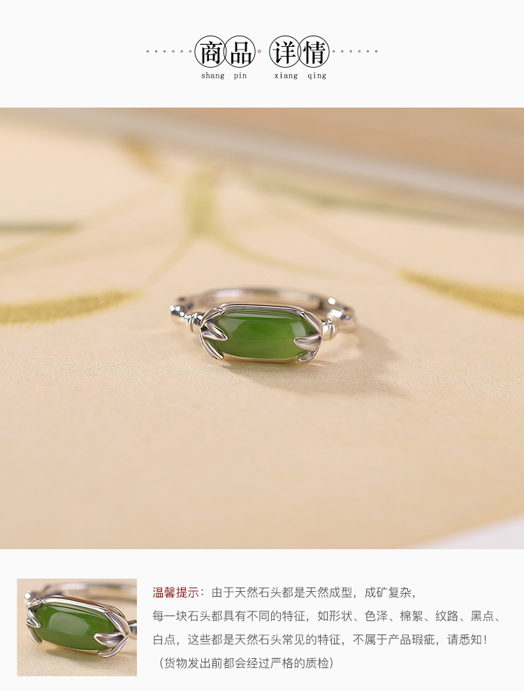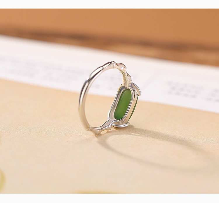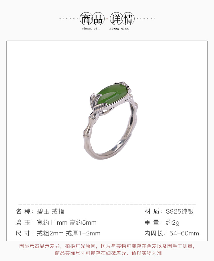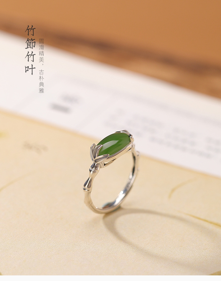 【乐宁】S925纯银和田玉碧玉复古竹节竹叶开口戒指【CW-JZ07525】