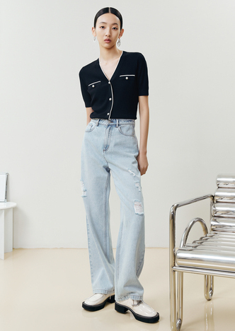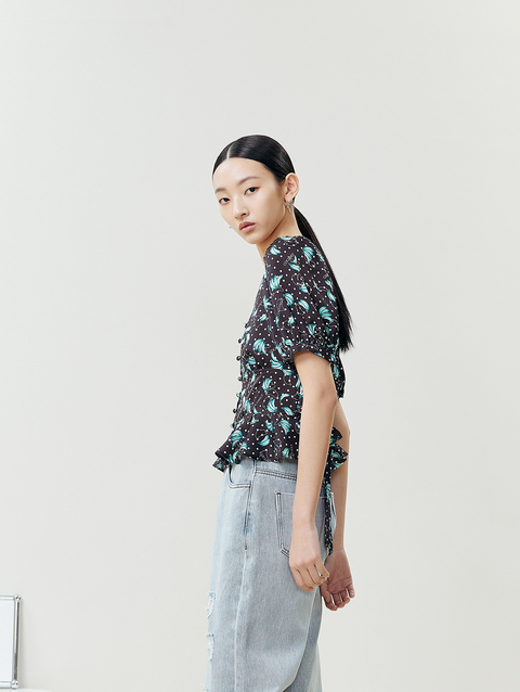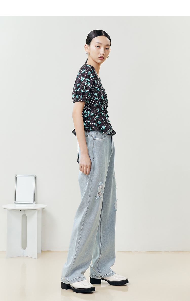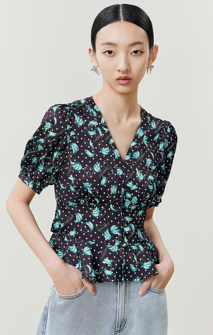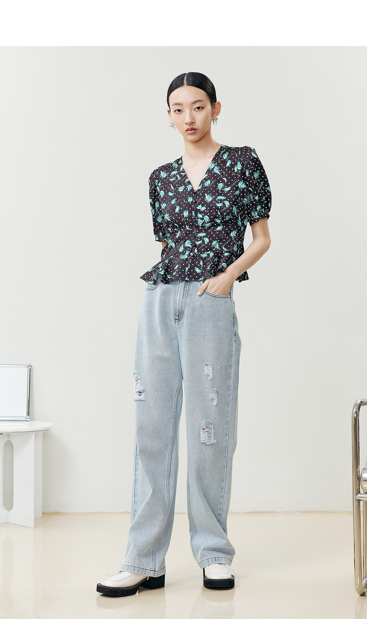 NEELLY纳俪商场同款法式浪漫气质V领泡泡袖衬衫女夏季短款上衣N22041R01013