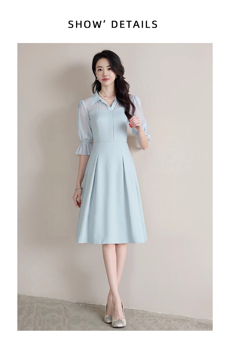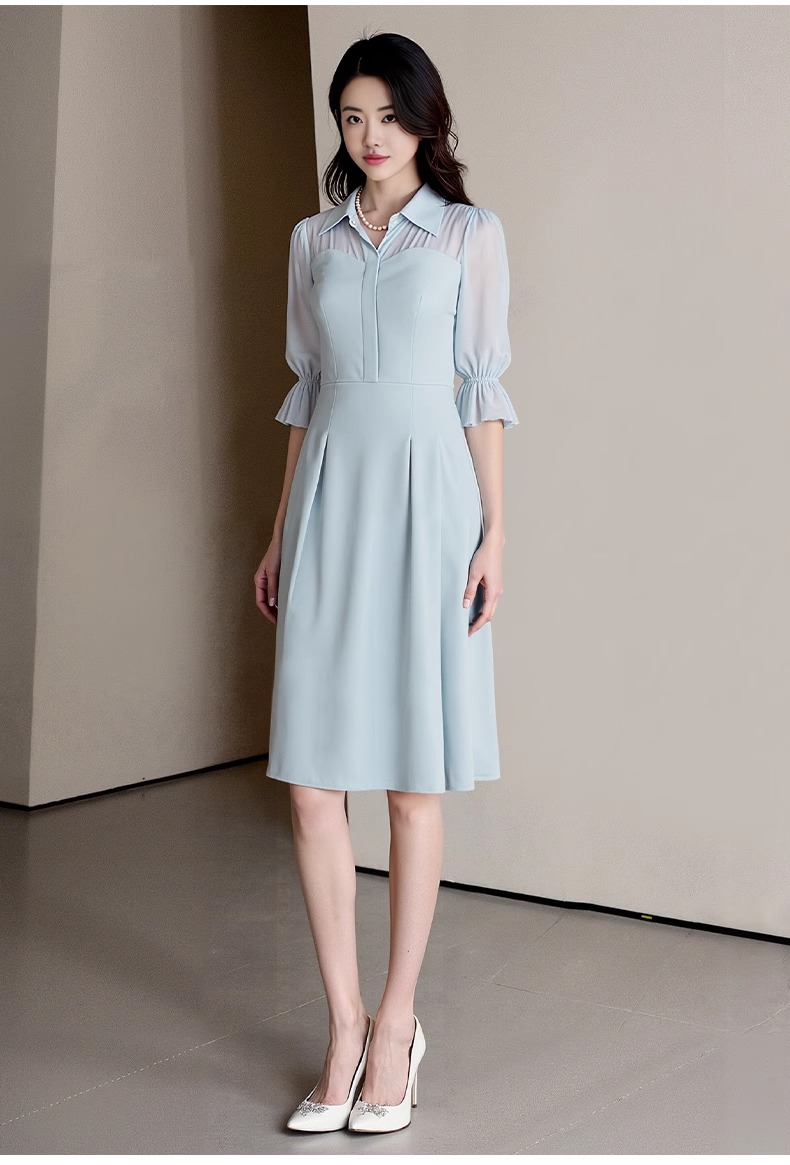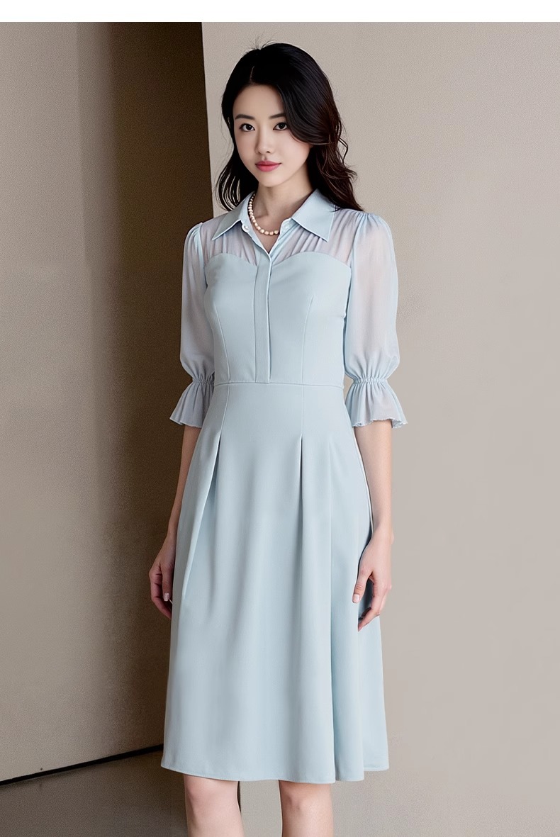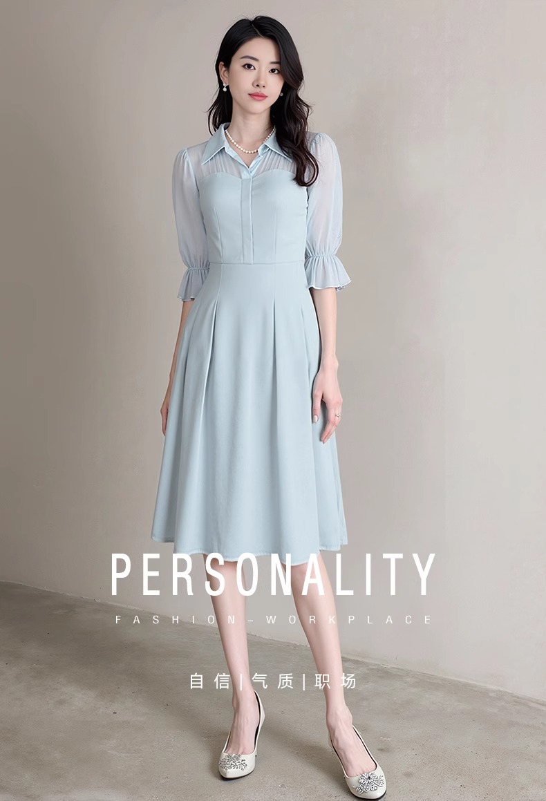 IWY/网纱拼接蓝色衬衫连衣裙轻职业装高端精致工作服女夏季Q1366