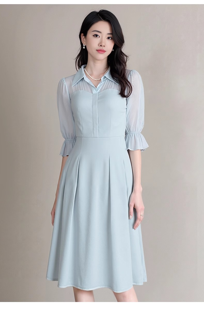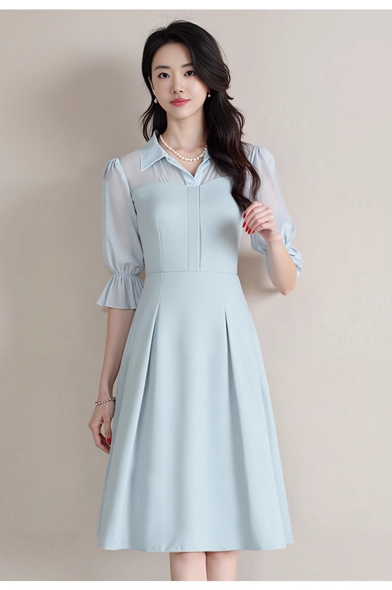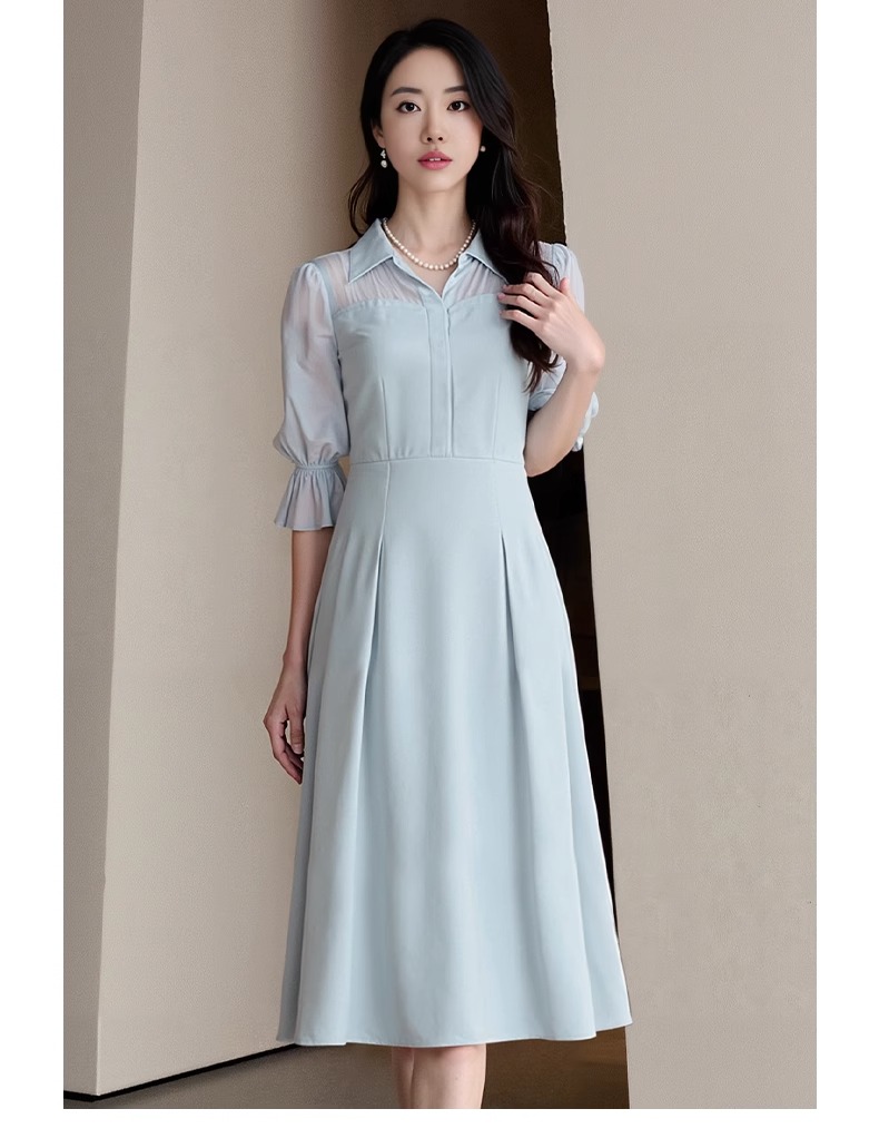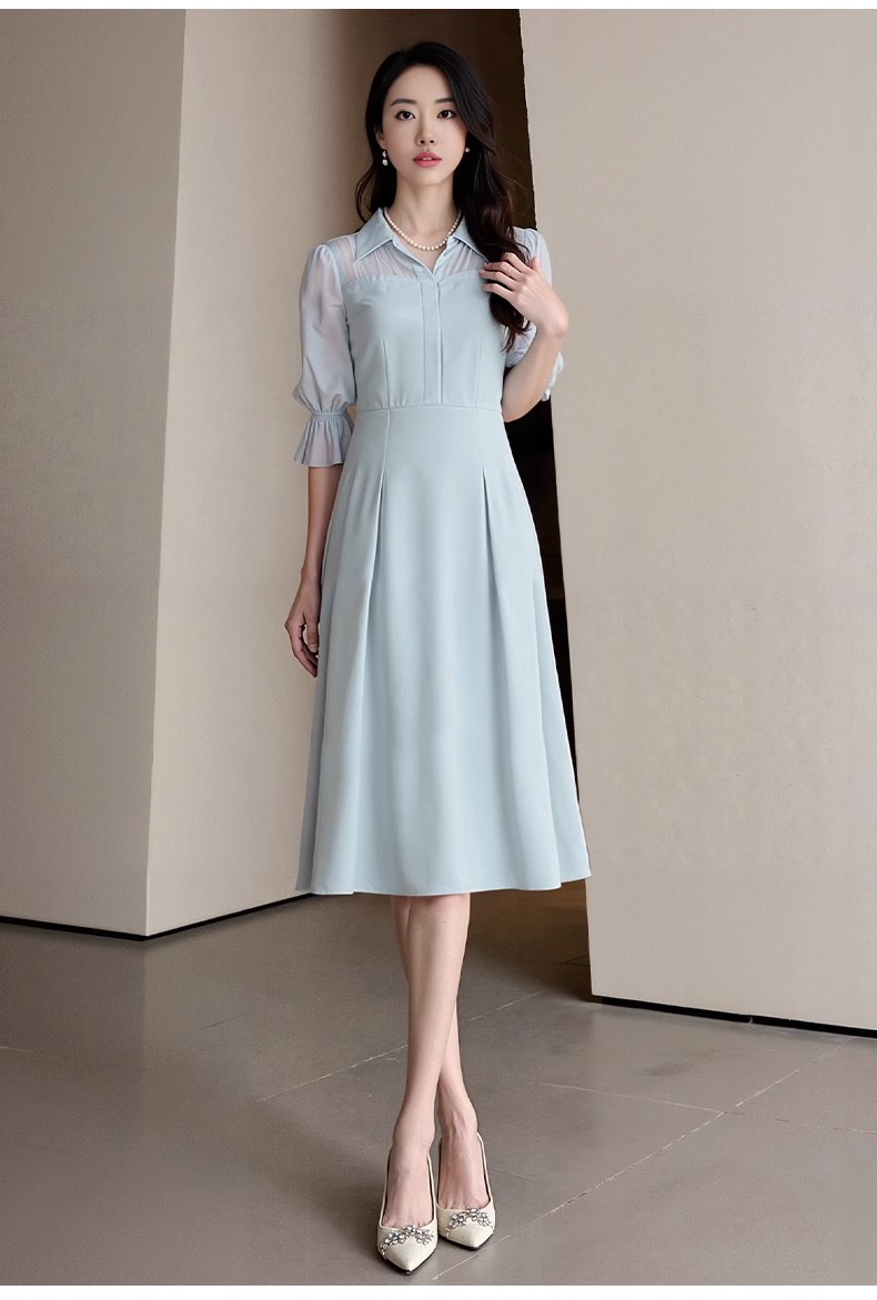 IWY/网纱拼接蓝色衬衫连衣裙轻职业装高端精致工作服女夏季Q1366