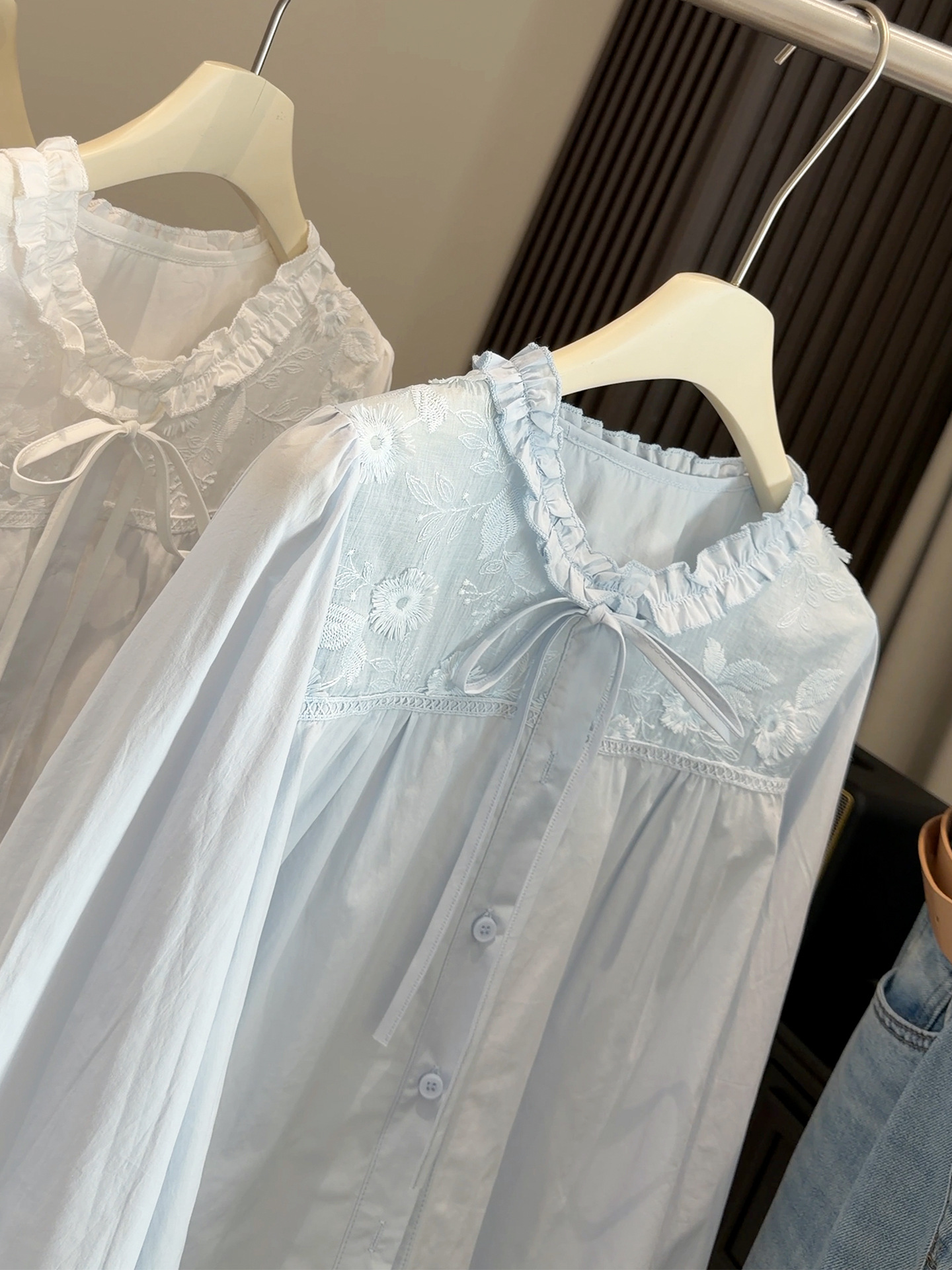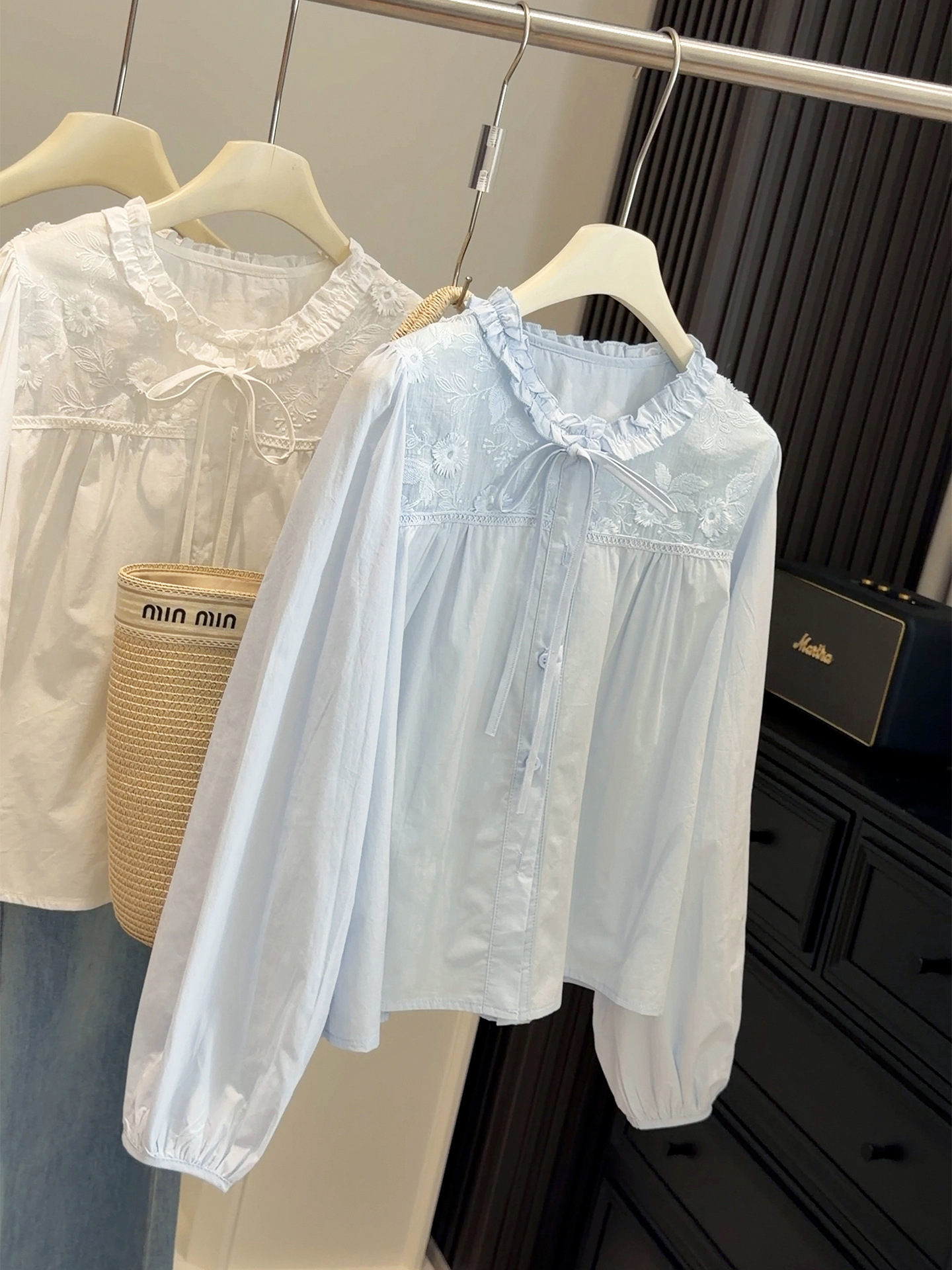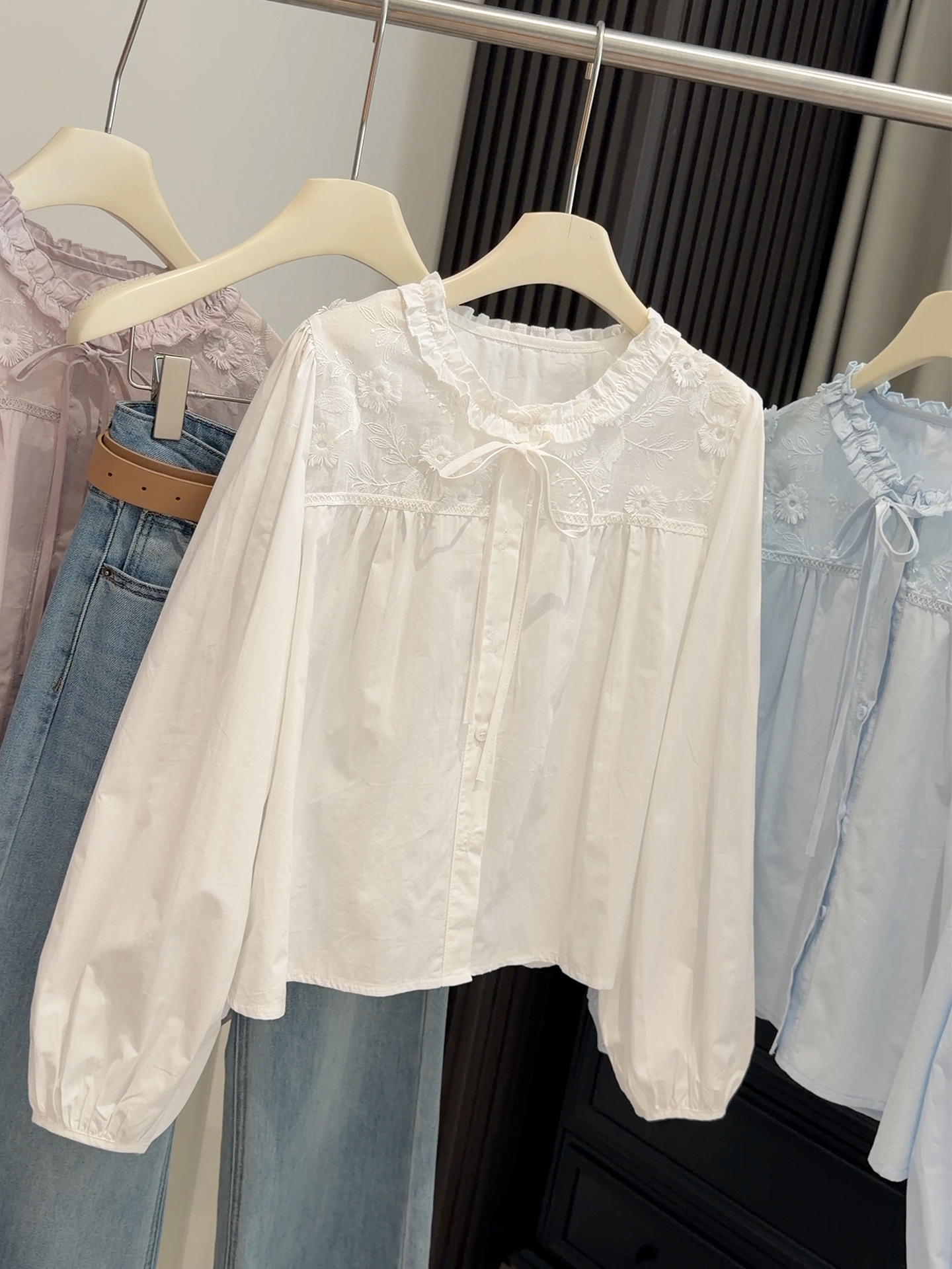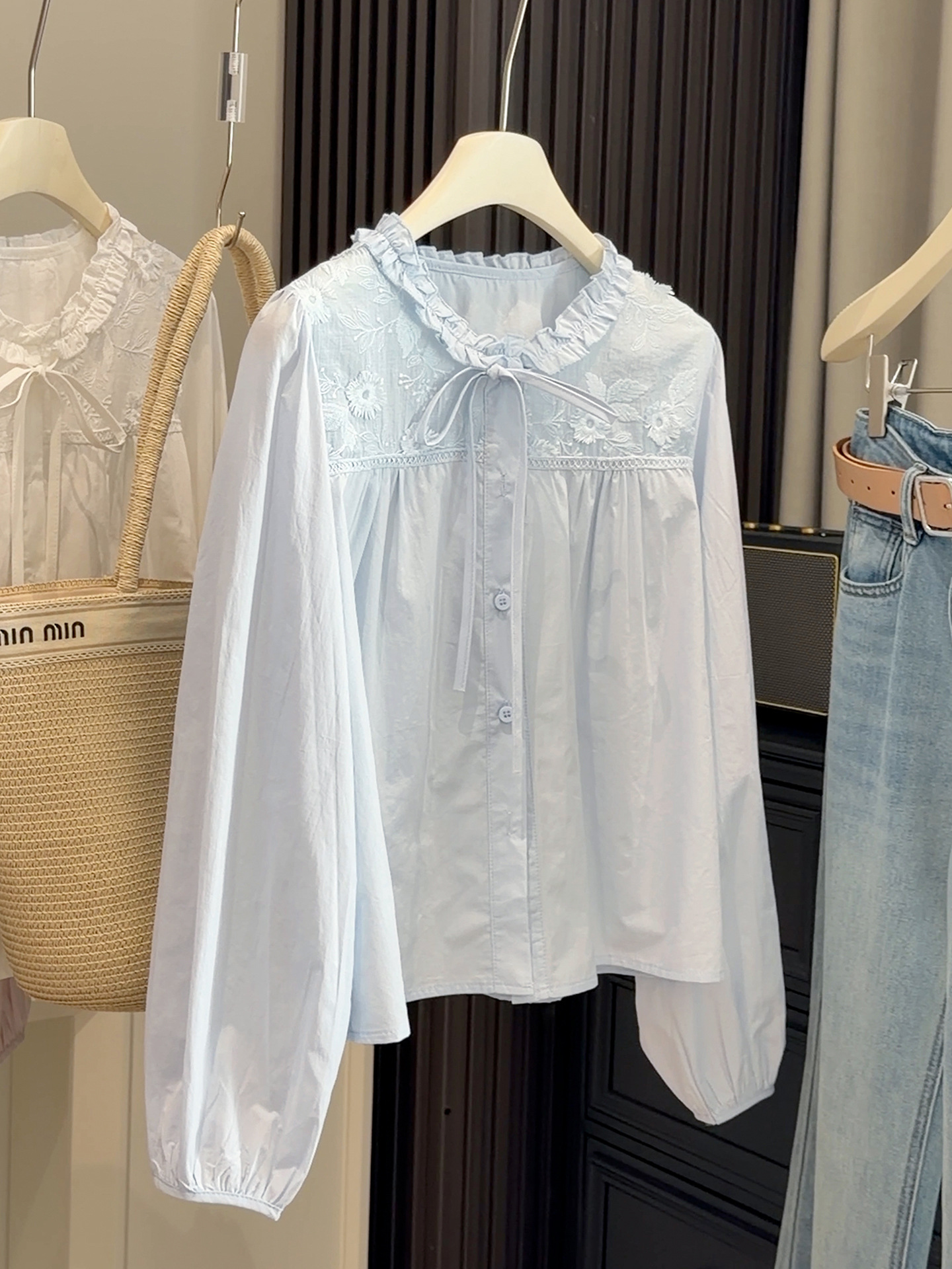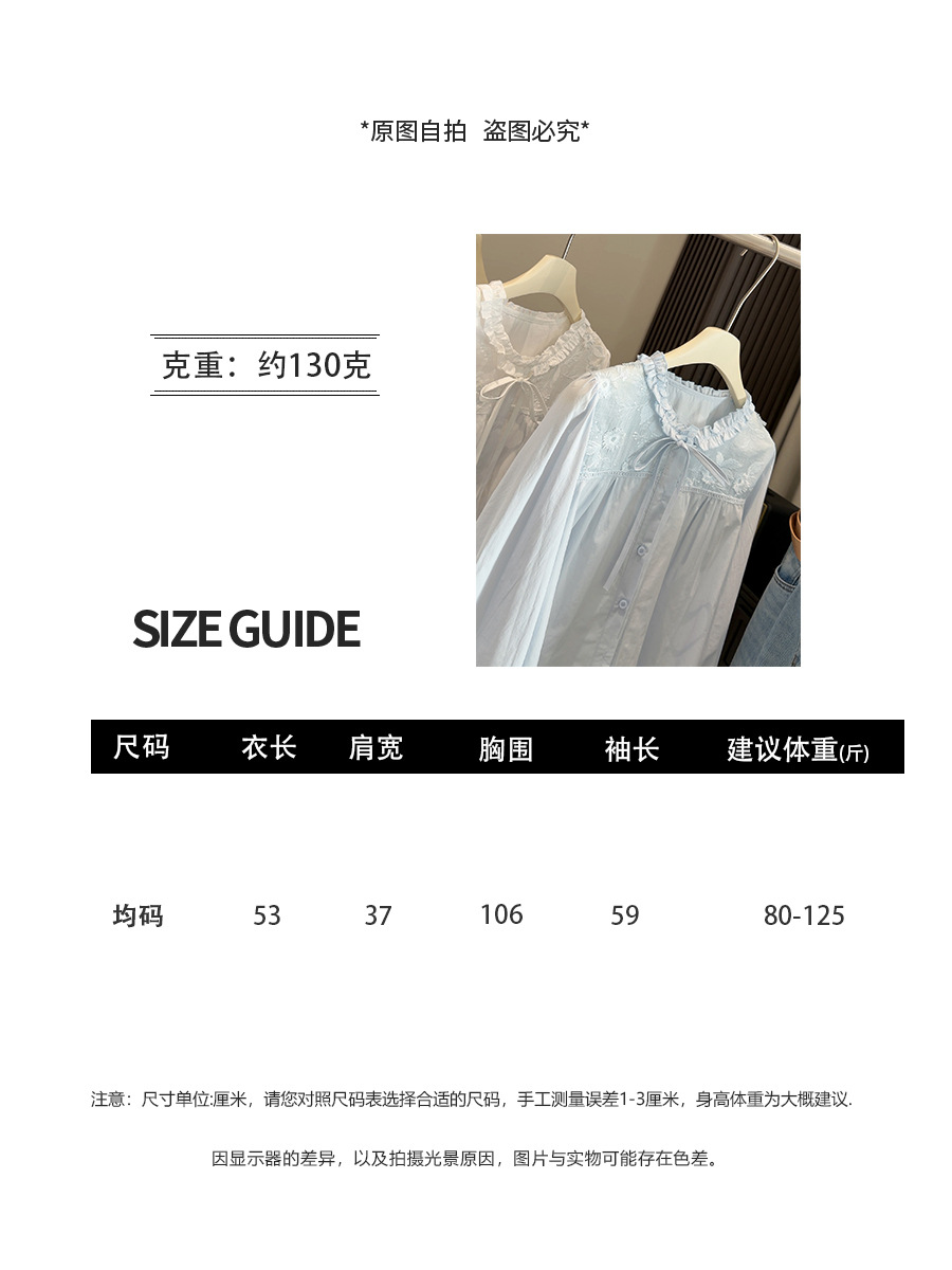 【木耳圆领刺绣衬衫】春季新款 韩系甜美减龄温柔风 蓝色长袖开衫上衣