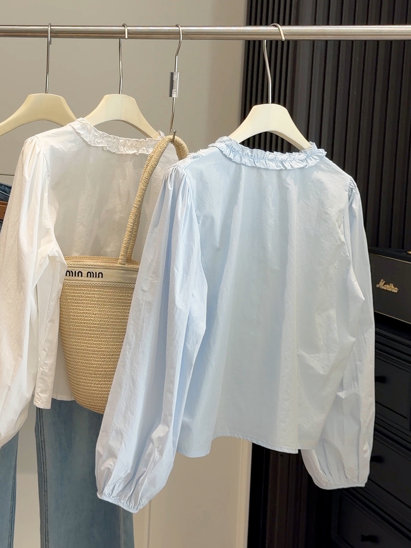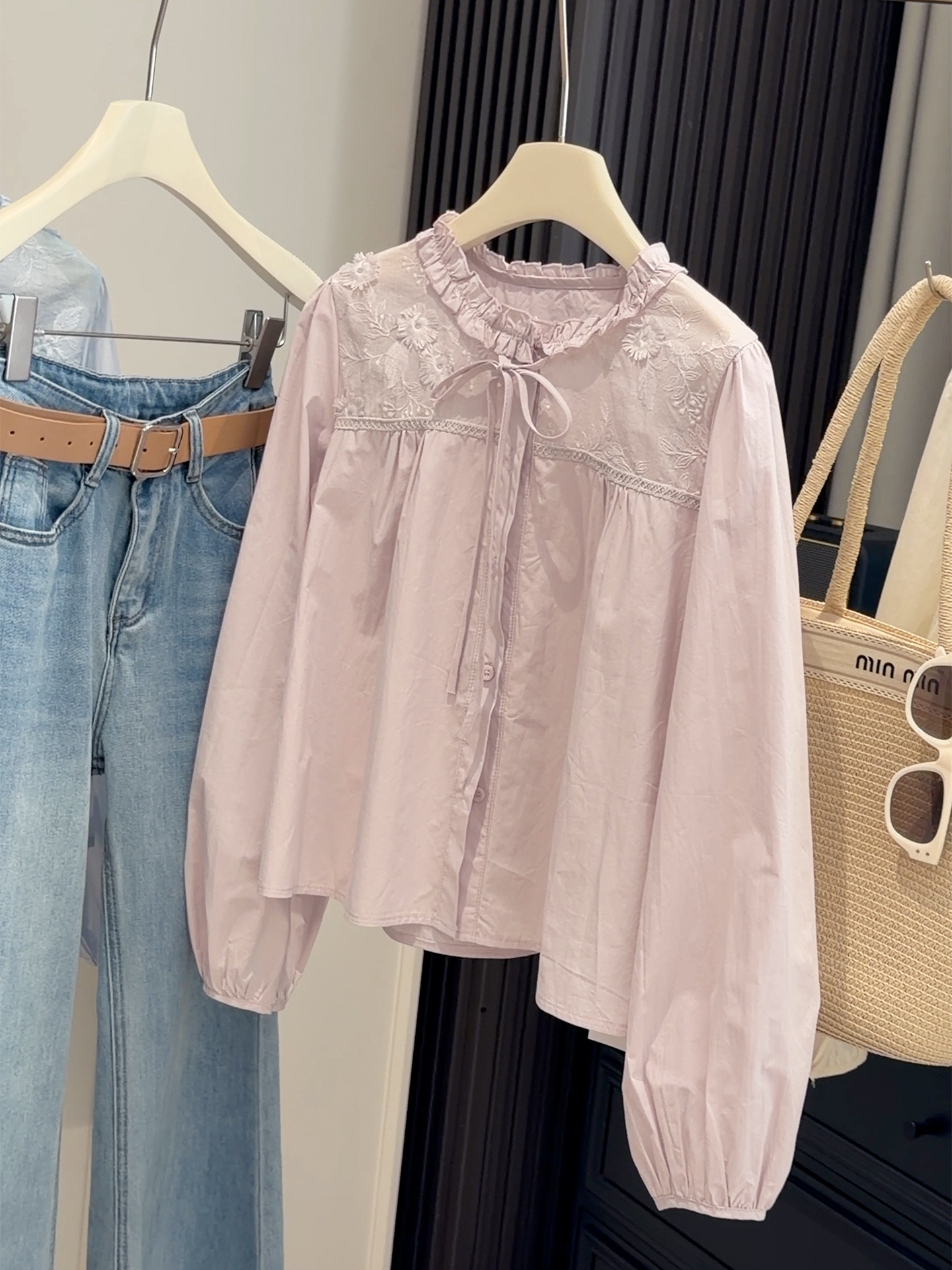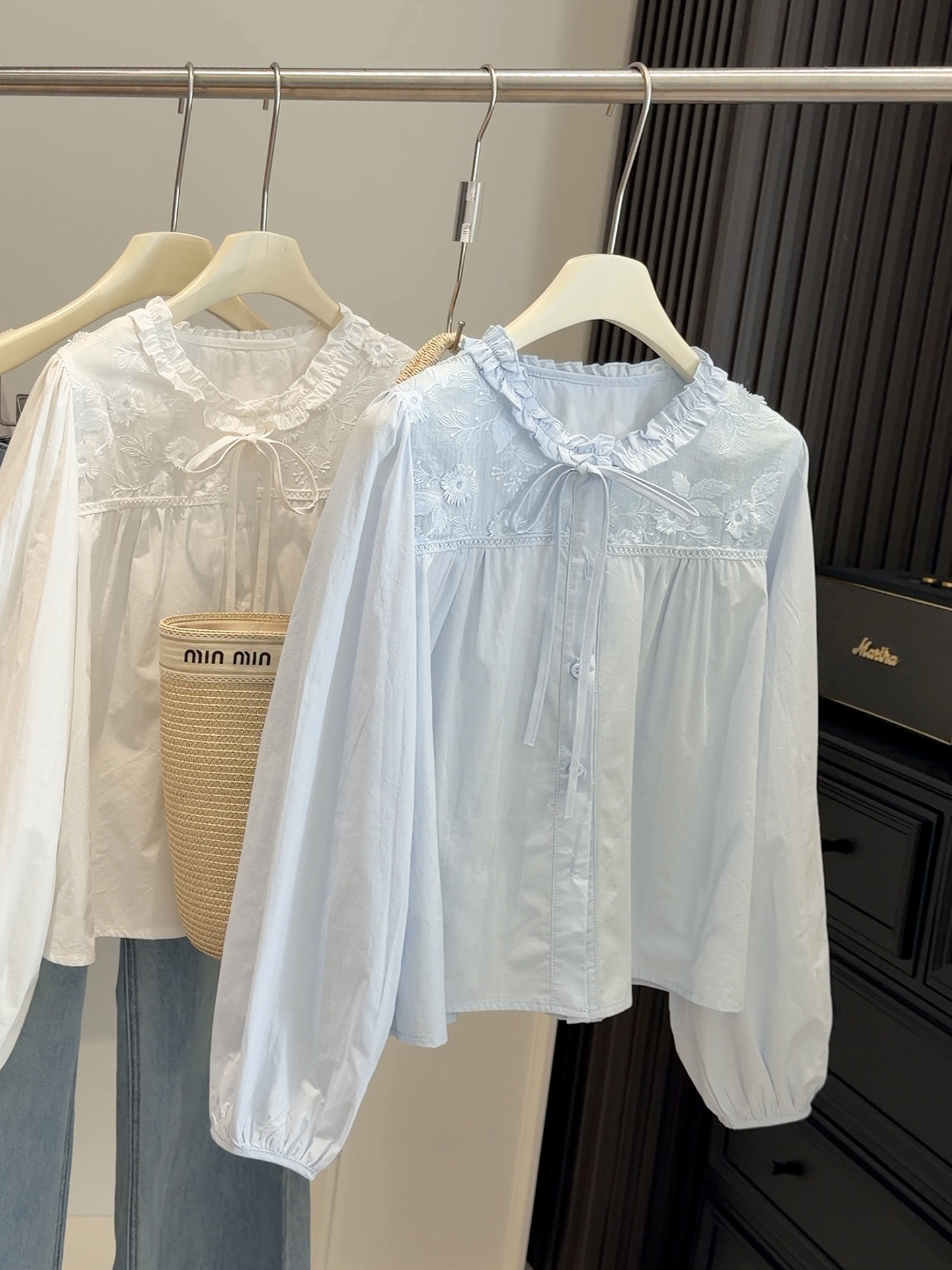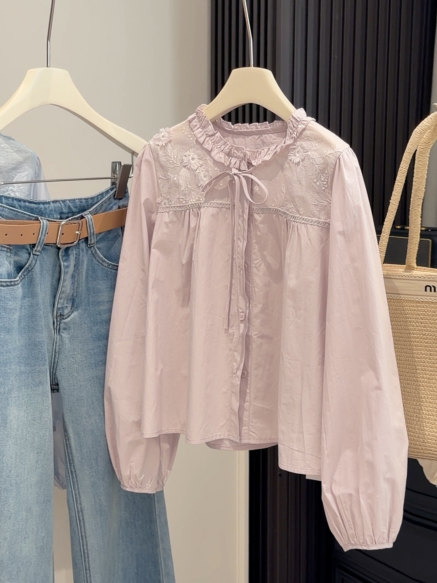 【木耳圆领刺绣衬衫】春季新款 韩系甜美减龄温柔风 蓝色长袖开衫上衣