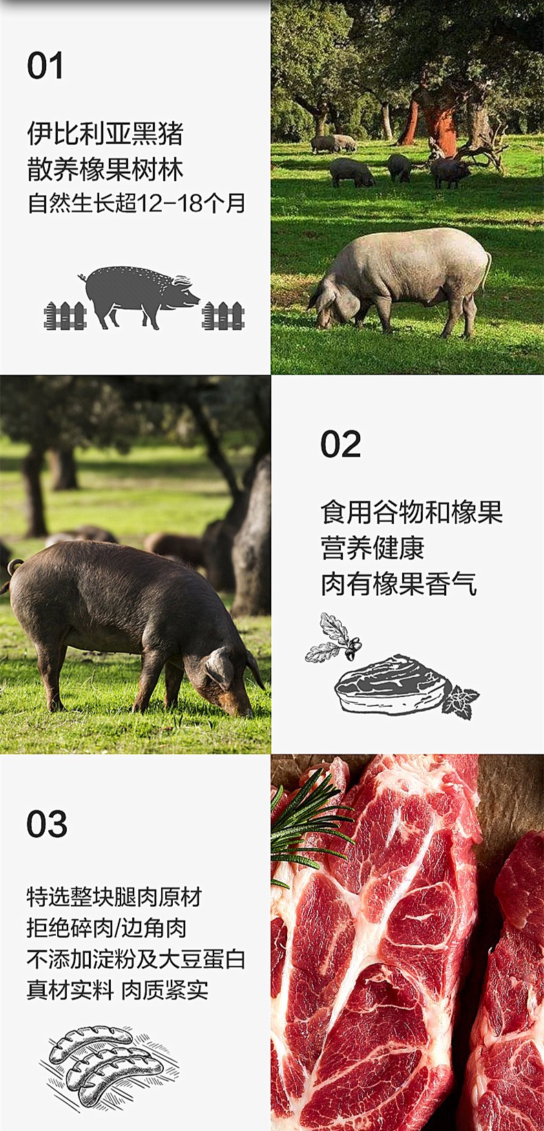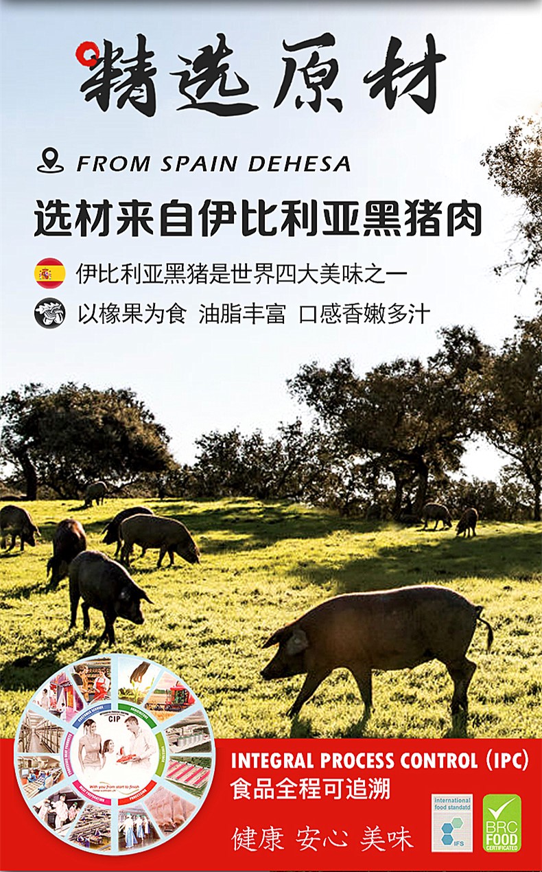 伊比利亚黑猪具有高贵的血统,土生土长在伊比利亚海拔600米的地区,距离海边50公里,地中海气候,只有那一点点产地才能生长出黑猪,它们一天需要行走14公里觅食,体重是其他同龄猪的1倍,散养在橡果树林,自然生长超12-18个月。所以伊比利亚黑猪也被称为世界四大美味之一。和咱们这的注水猪不是一个level,差了孙悟空一个筋斗云那么远哈。