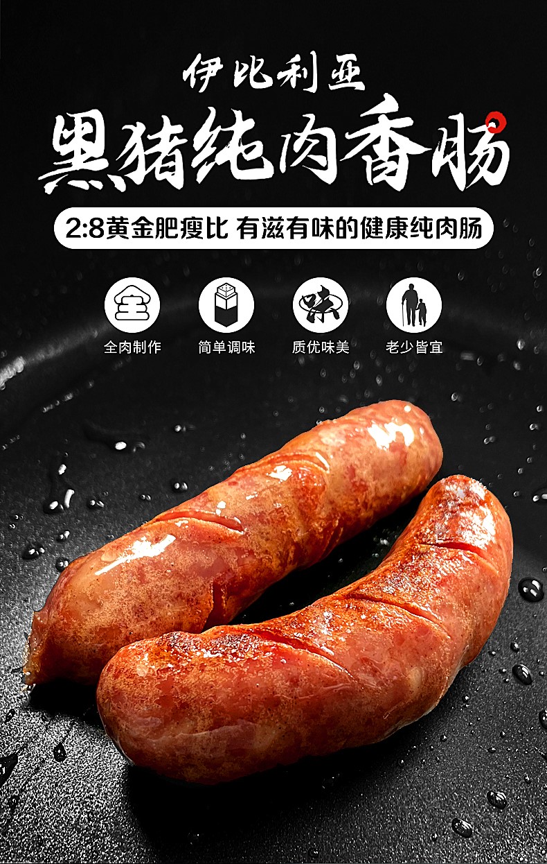 香肠届的天花板,纯黑猪肉香肠,没有之一!和著名的西班牙黑猪火腿出自于同一头猪!!高贵血统完胜其他种猪,完全不含淀粉,不添加鸡肉的纯黑猪制作!