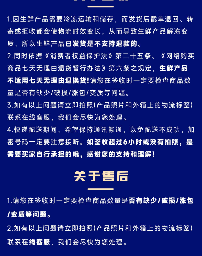 1、食品订单发货之后,非质量问题不接受退换,不支持7天无理由退款;