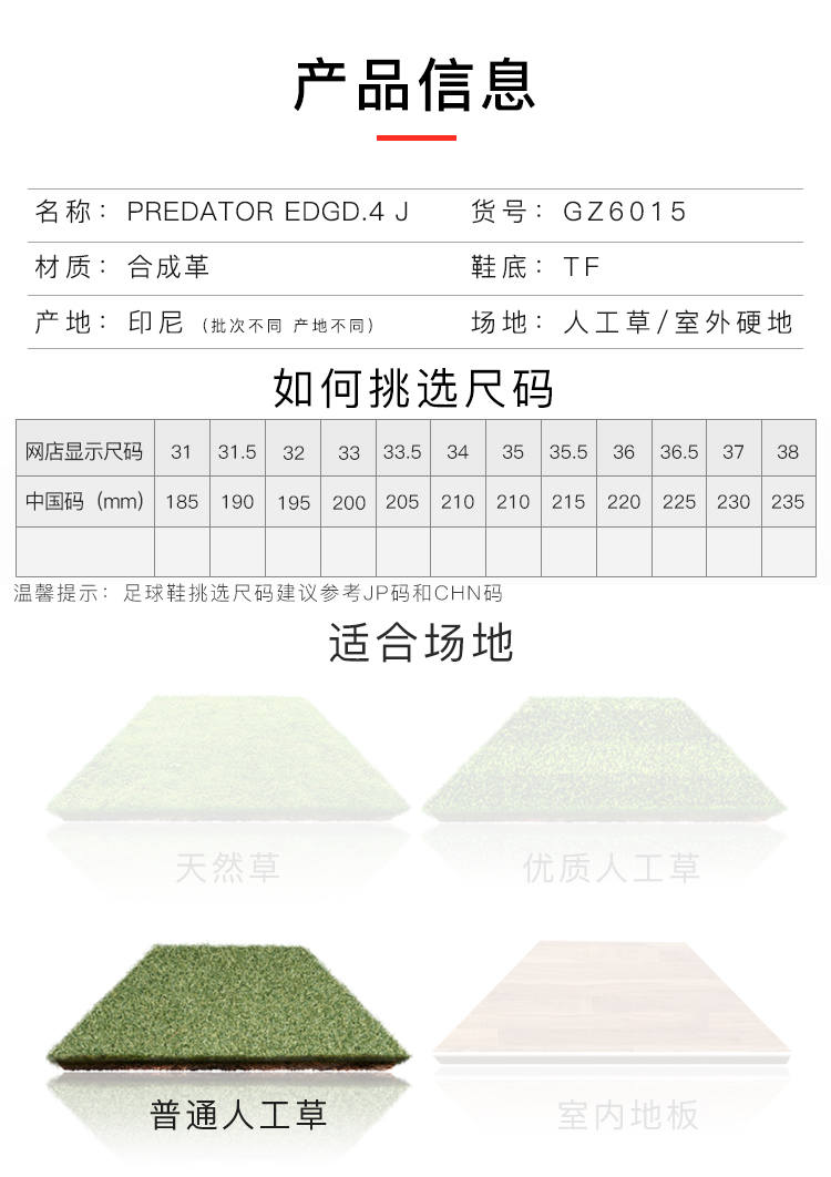 ADIDAS/阿迪达斯 PREDATOR EDGE.4 H&L TF J猎鹰青少年入门级魔术贴碎钉足球鞋GZ6015