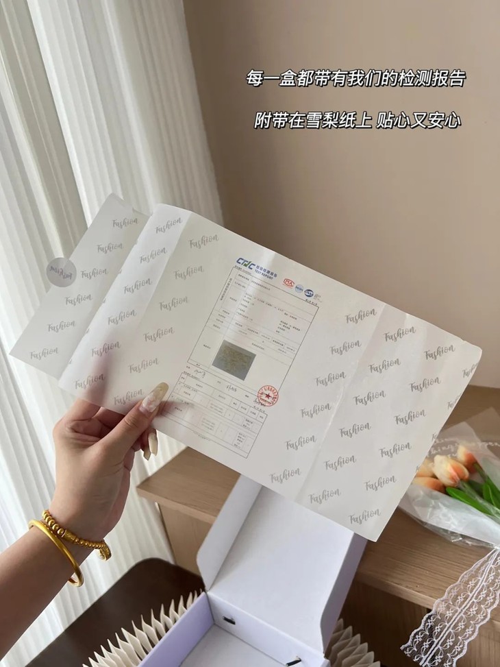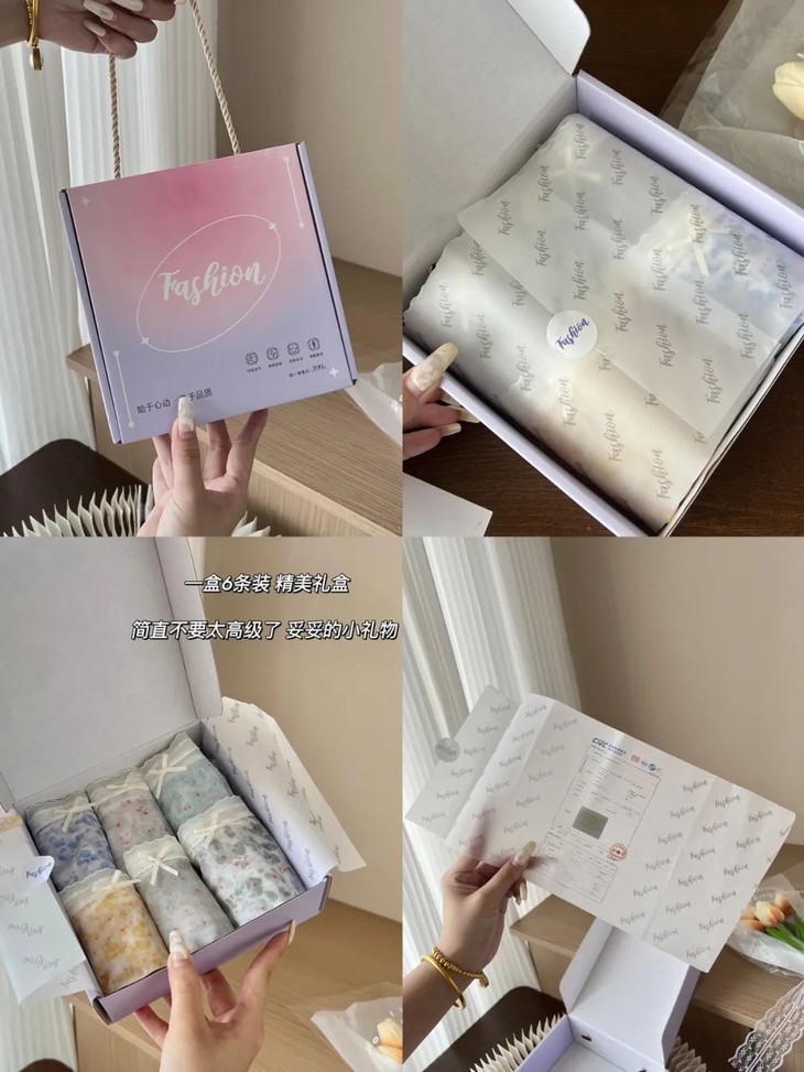 包装上很用心,是一个手提渐变开盖式的礼盒,里面有防尘和雪梨纸。 并且每一张雪梨纸上面都带有检测报告,每一盒都是6条装,精致又很有档次,送闺蜜送女友都不错哦! (注明:水洗唛桑蚕丝含量为1.1%,与雪梨纸检测报告有所差异,因为生产时候会出现个别内裤桑蚕丝含量较多,第三方检测机构按照实际面料检测,但均不会低于1.1%)