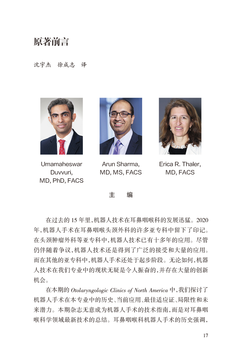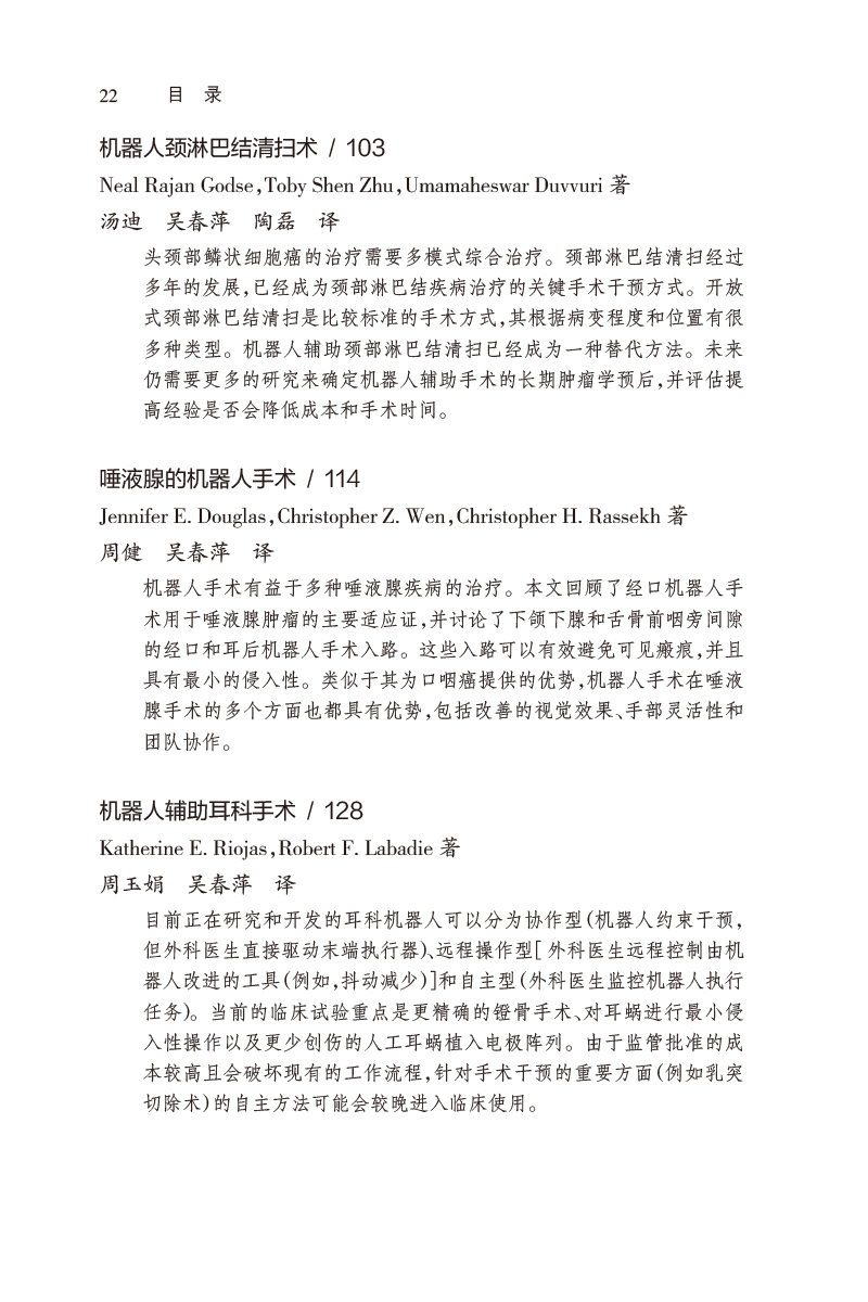 本书全面系统总结了手术机器人在耳鼻咽喉科的应用各方面,包括耳鼻咽喉科机器人手术的发展史,经口机器人手术(TORS)的发展史、应用指征、与开放手术对比的不同之处、并发症;机器人辅助甲状腺手术入路选择、适应症、优缺点。本书每一章节不同作者以综述形式对不同类型机器人手术进行讨论、归纳、总结。相信本书对开展耳鼻咽喉科机器人手术具有非常重要的指导意义。