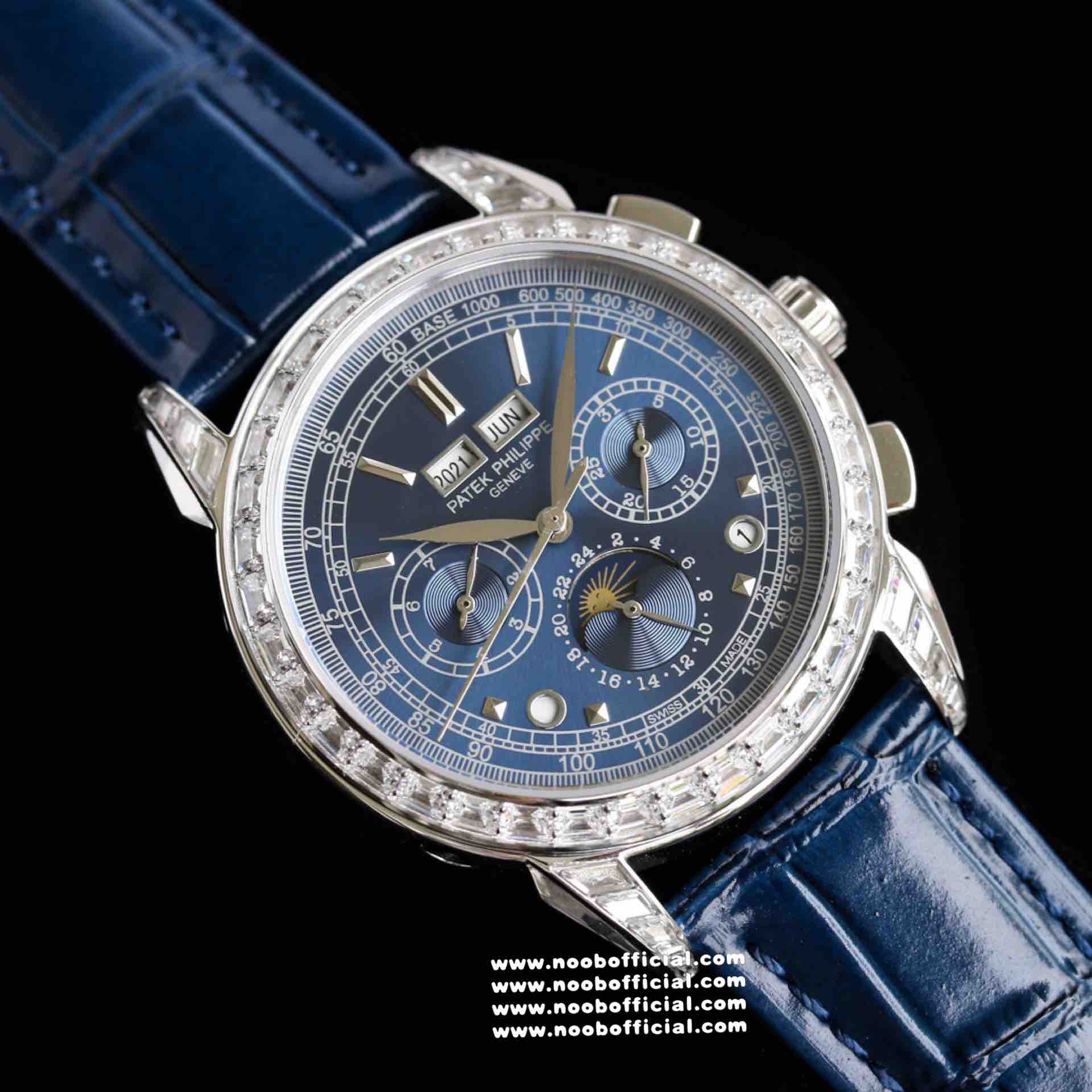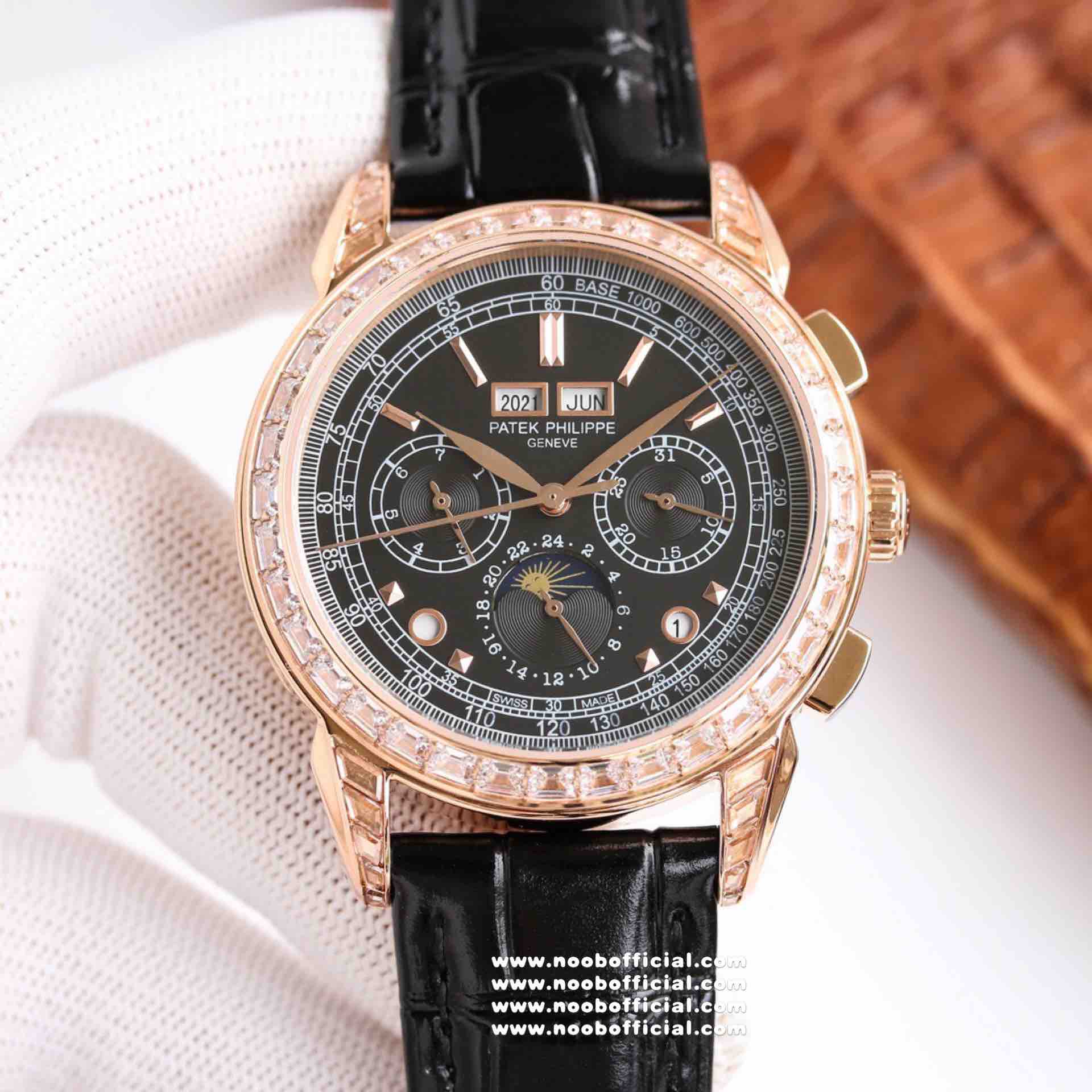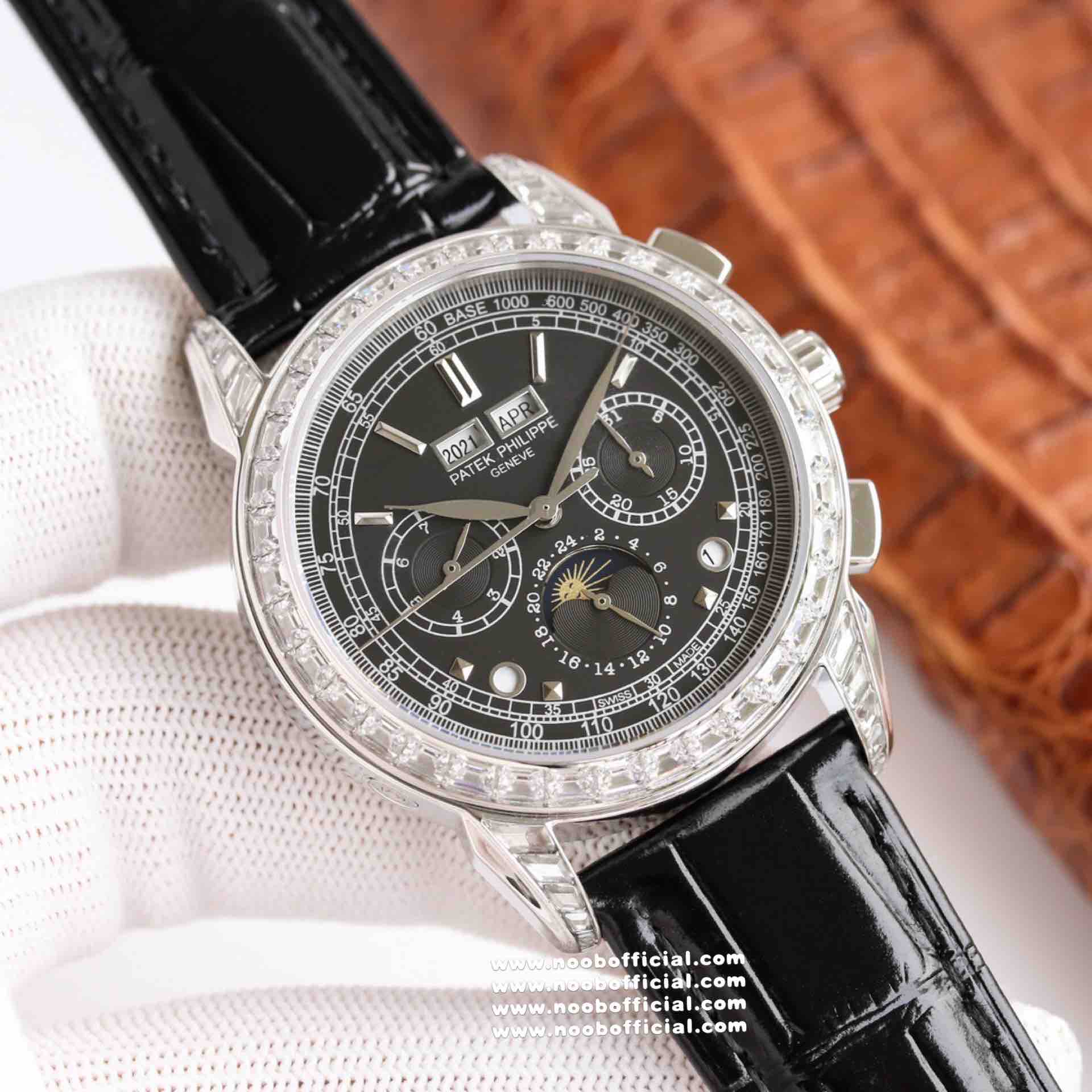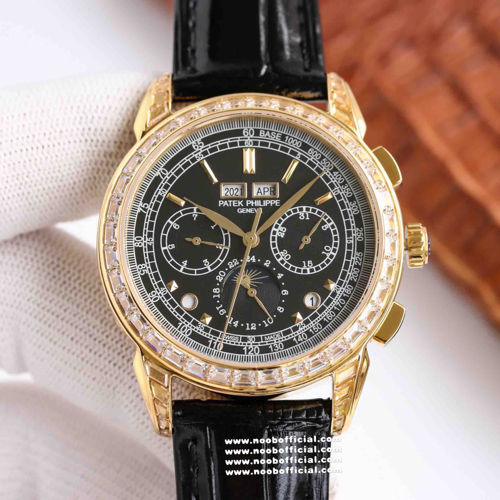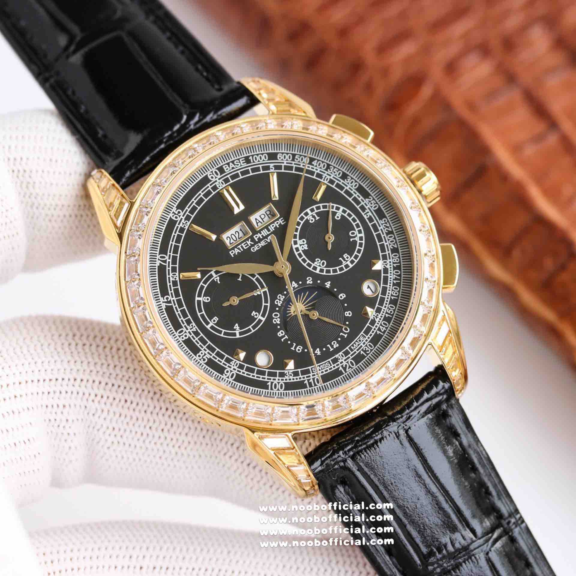 Noob Maker,N厂市场独家,耗时2年,18k包金版本和定制版手工镶钻工艺来啦,由20种不同钻组成,色泽艳丽,扣子也点缀21颗钻,搭配正品一致的美洲鳄鱼皮表带百达.翡丽超级复杂功能计时系列