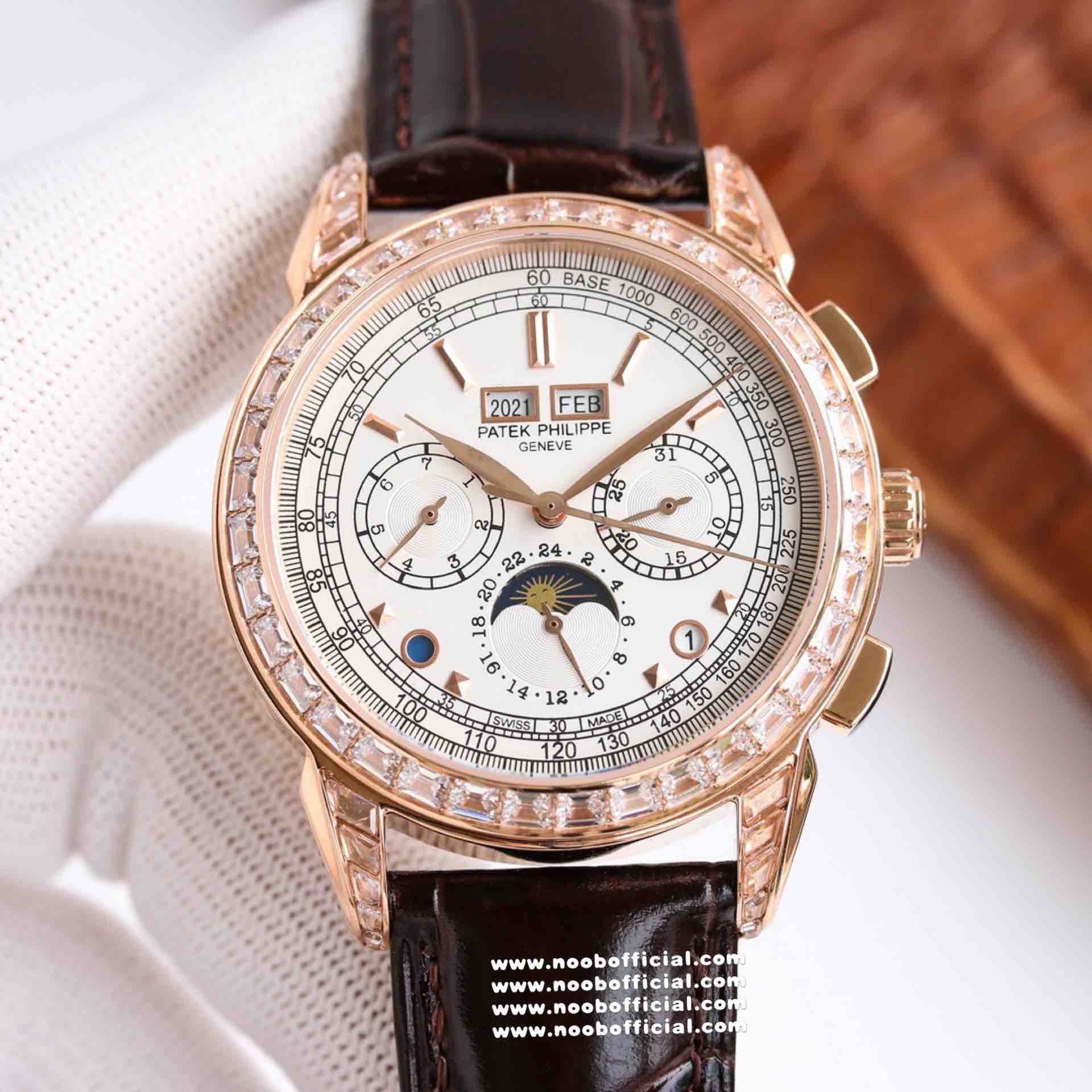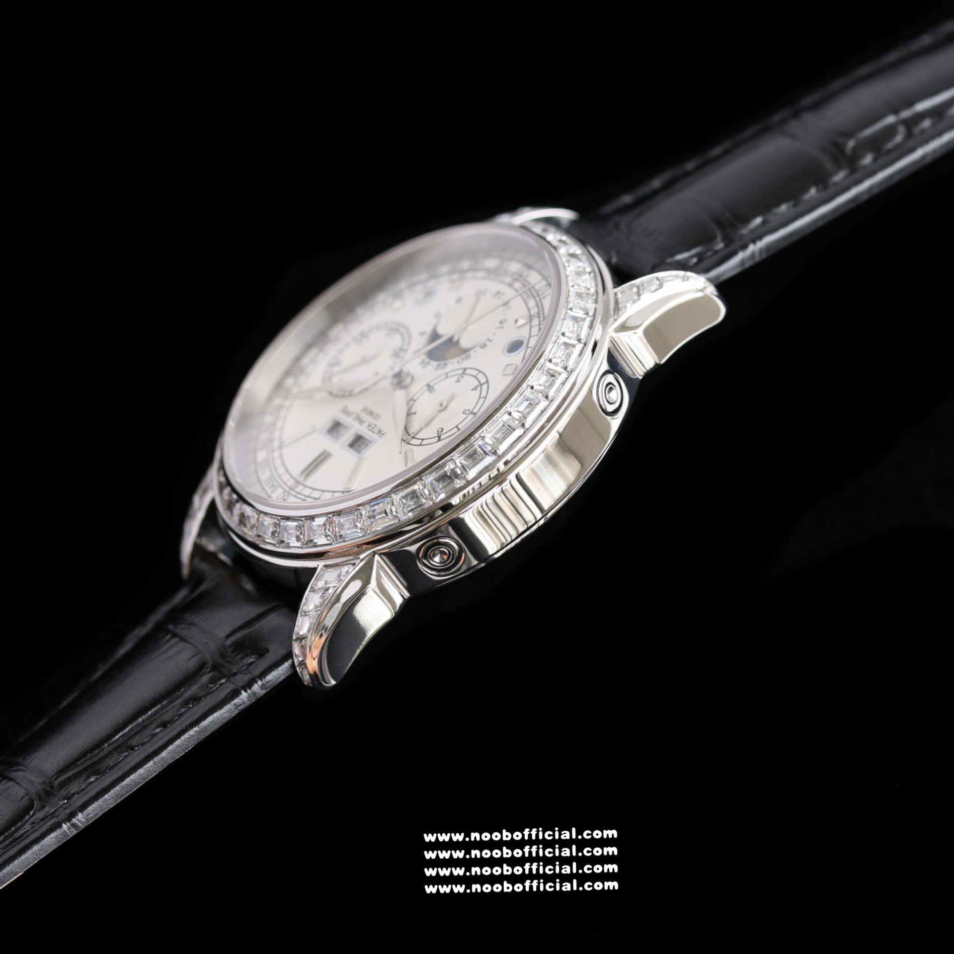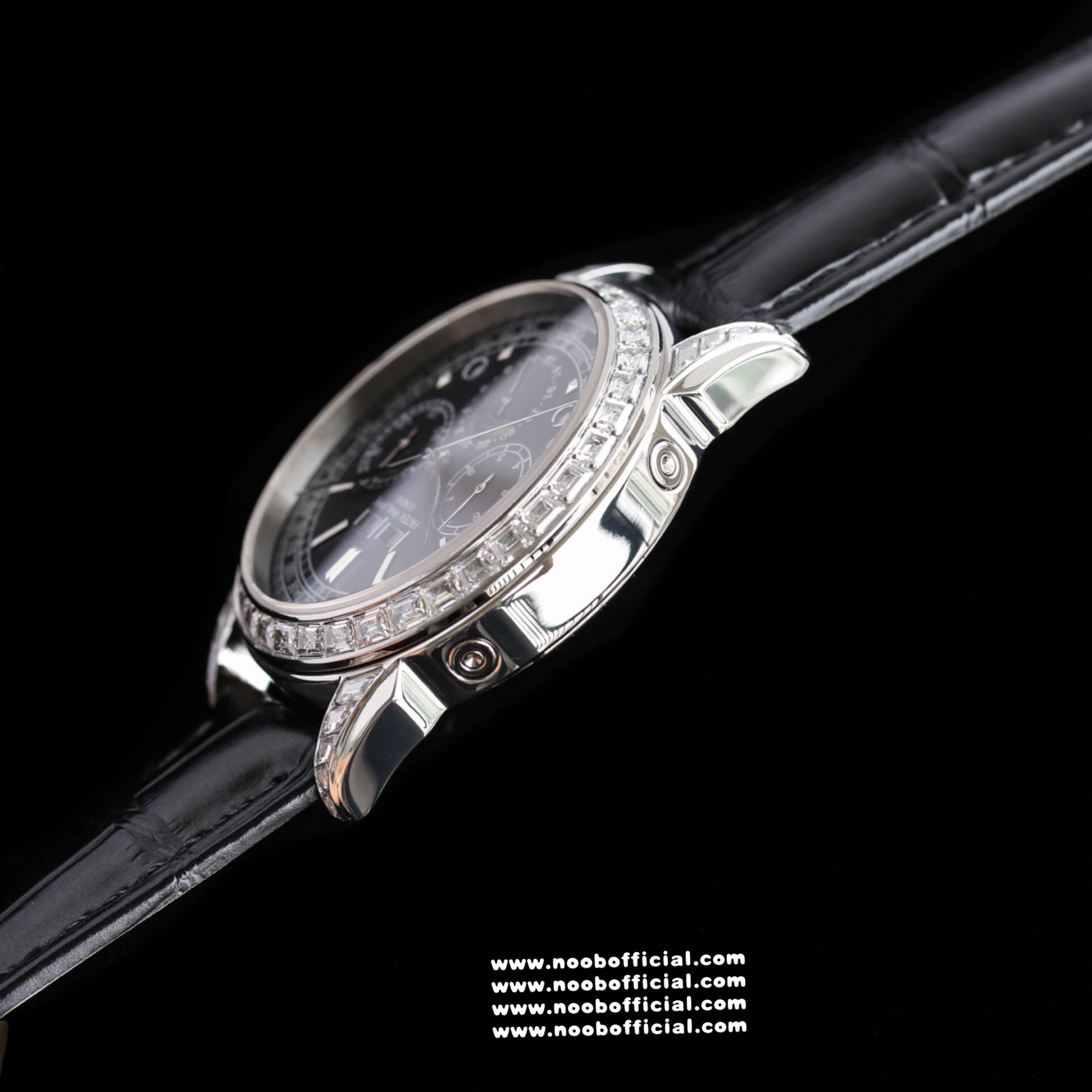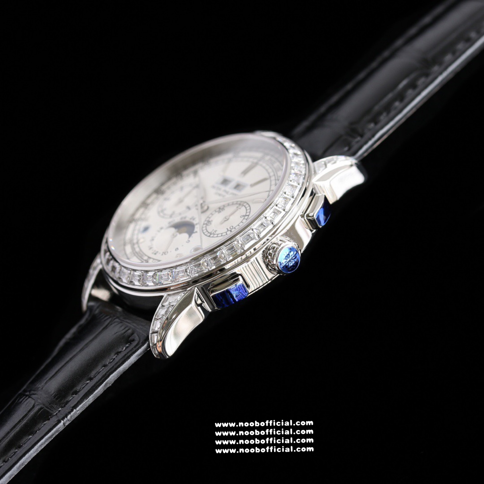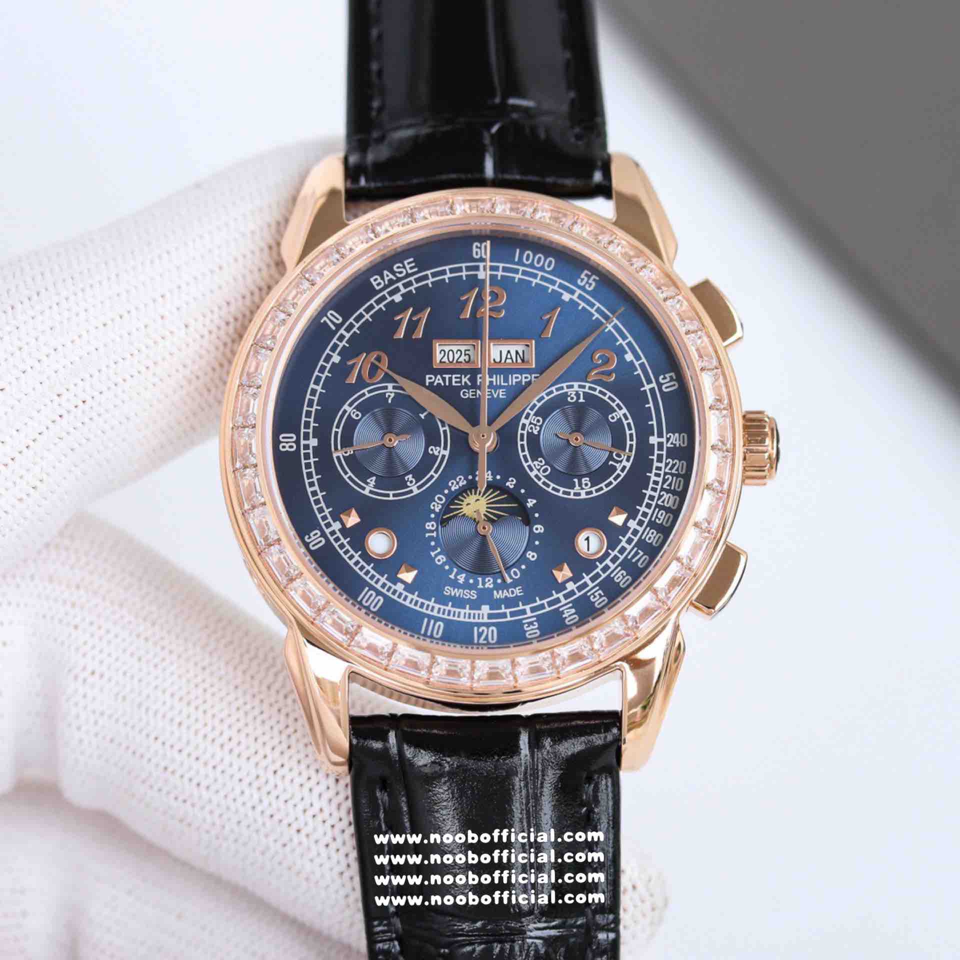 Noob Maker,N厂市场独家,耗时2年,18k包金版本和定制版手工镶钻工艺来啦,由20种不同钻组成,色泽艳丽,扣子也点缀21颗钻,搭配正品一致的美洲鳄鱼皮表带百达.翡丽超级复杂功能计时系列