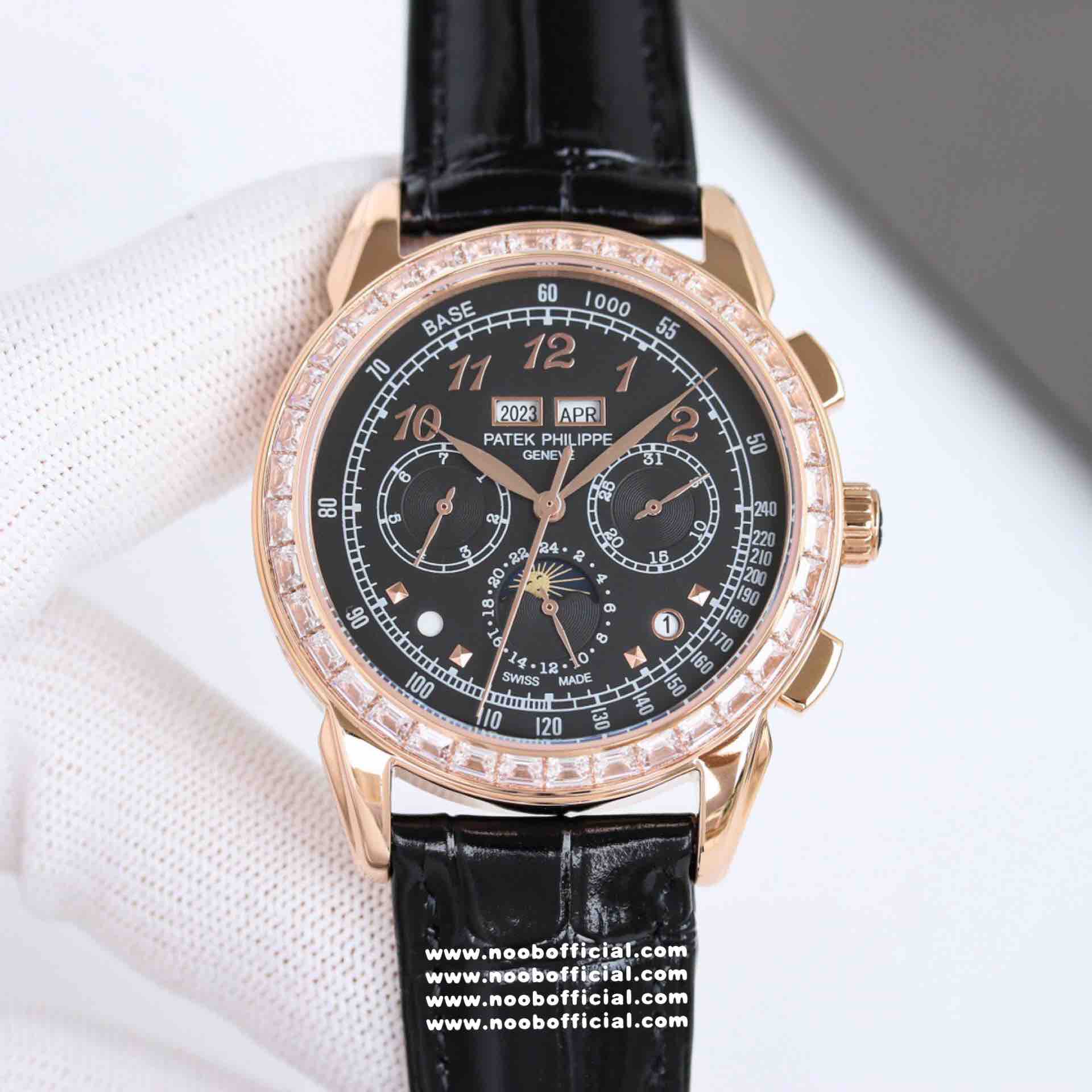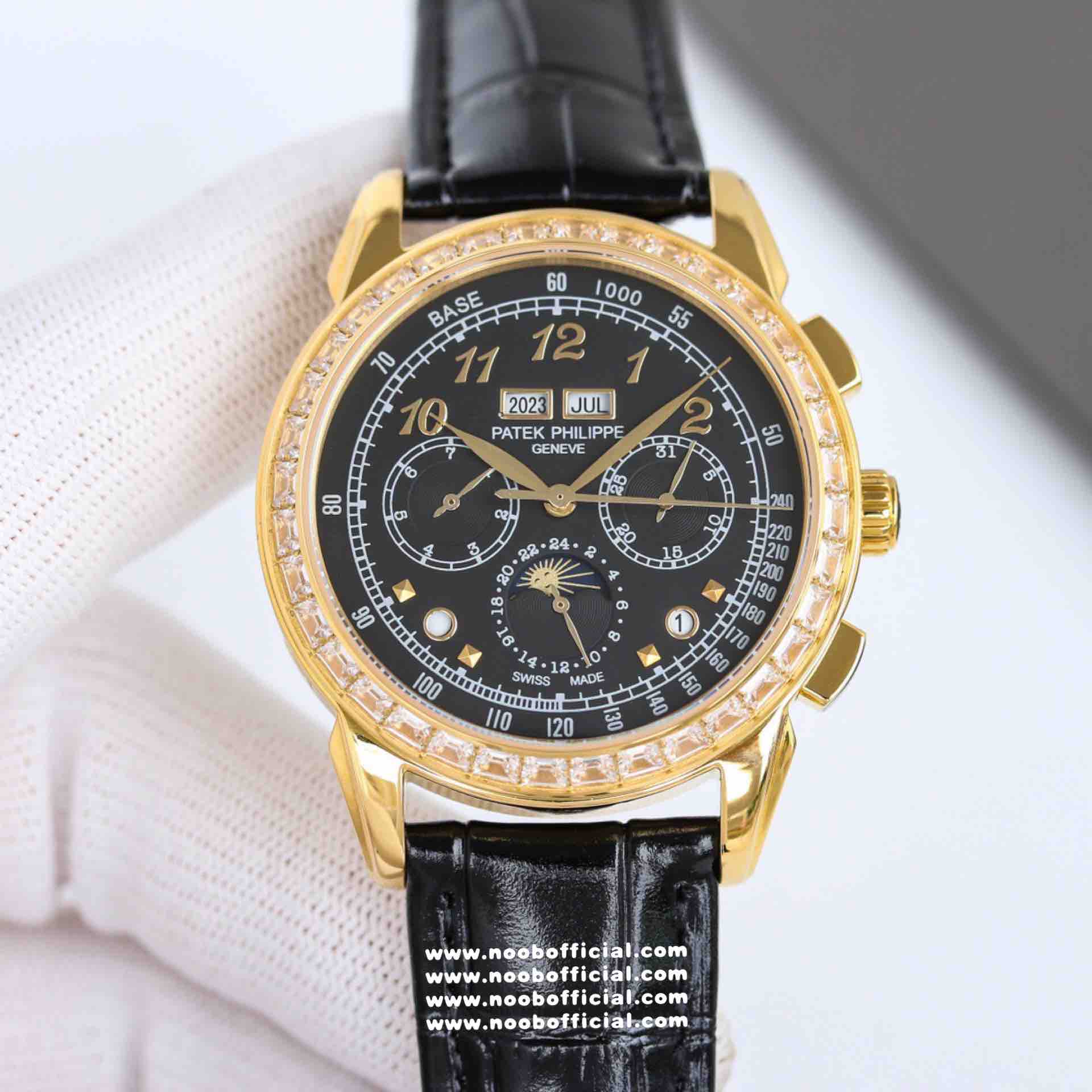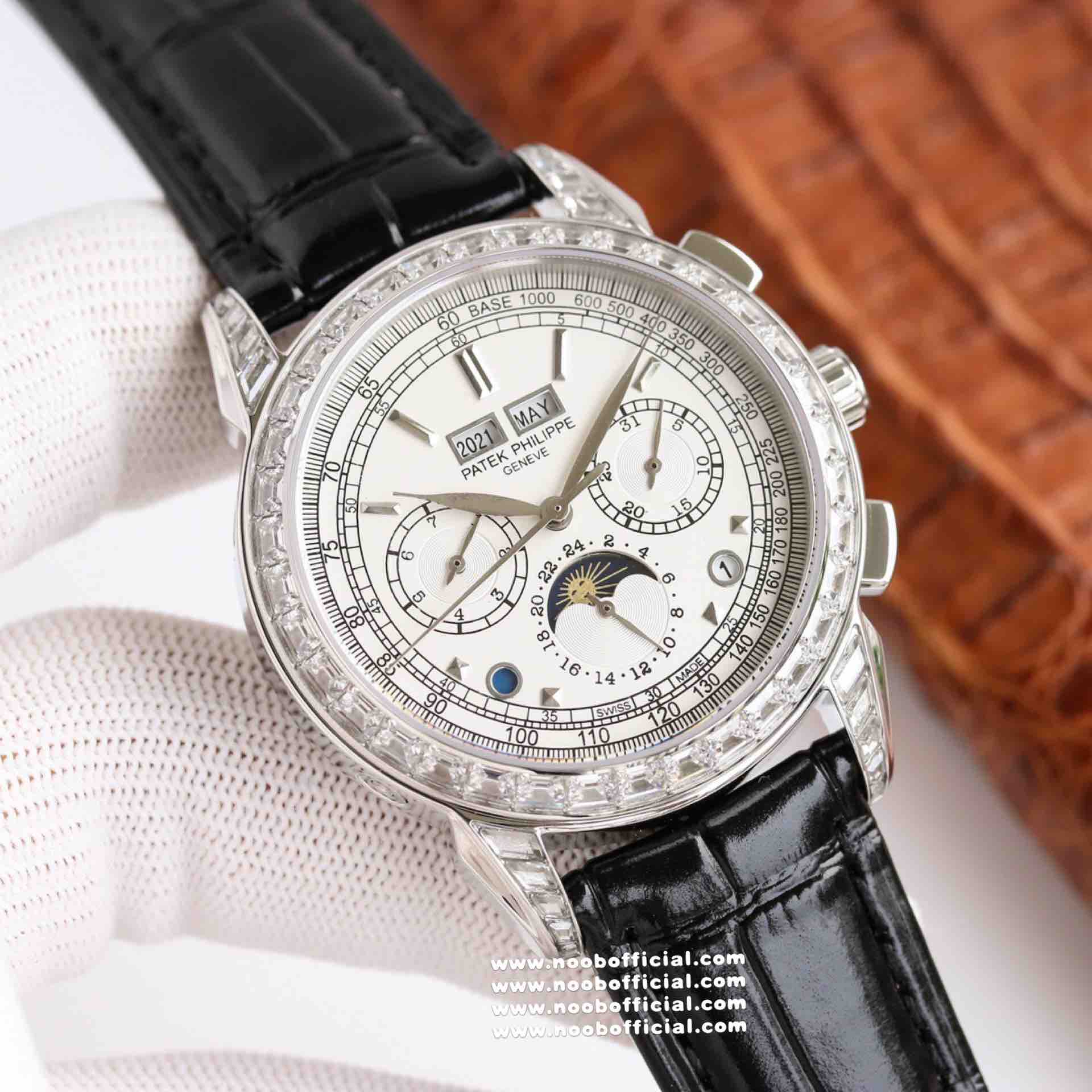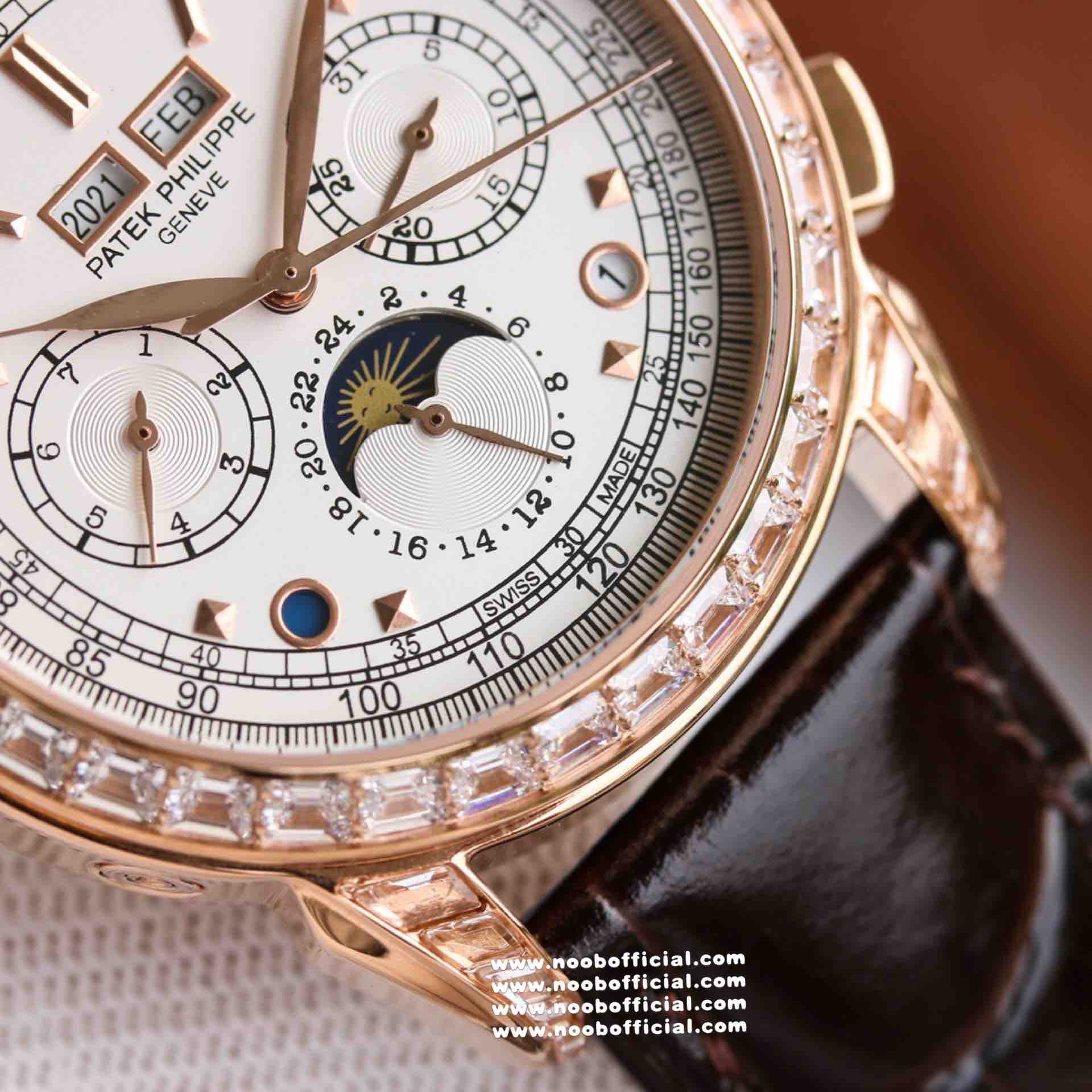 Noob Maker,N厂市场独家,耗时2年,18k包金版本和定制版手工镶钻工艺来啦,由20种不同钻组成,色泽艳丽,扣子也点缀21颗钻,搭配正品一致的美洲鳄鱼皮表带百达.翡丽超级复杂功能计时系列