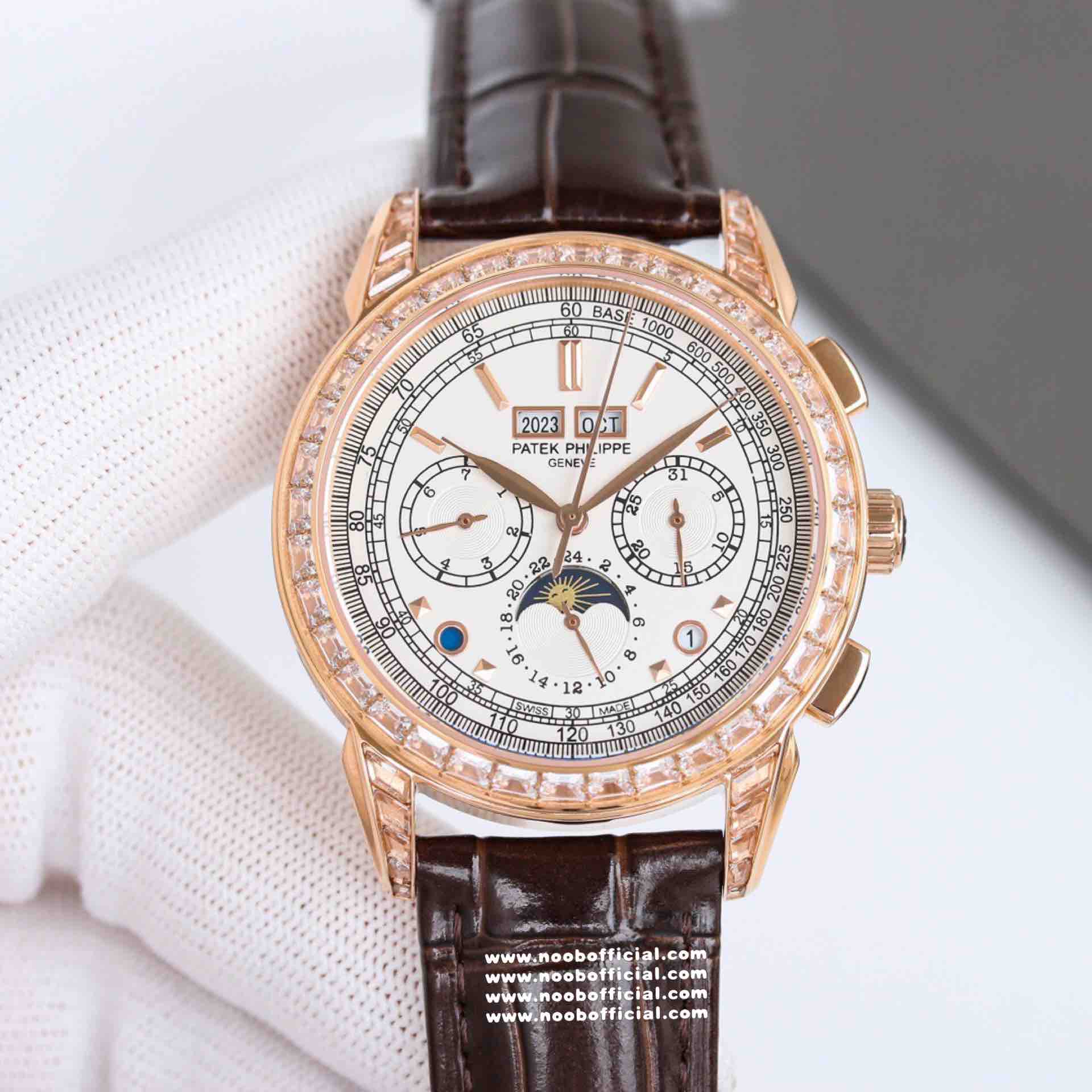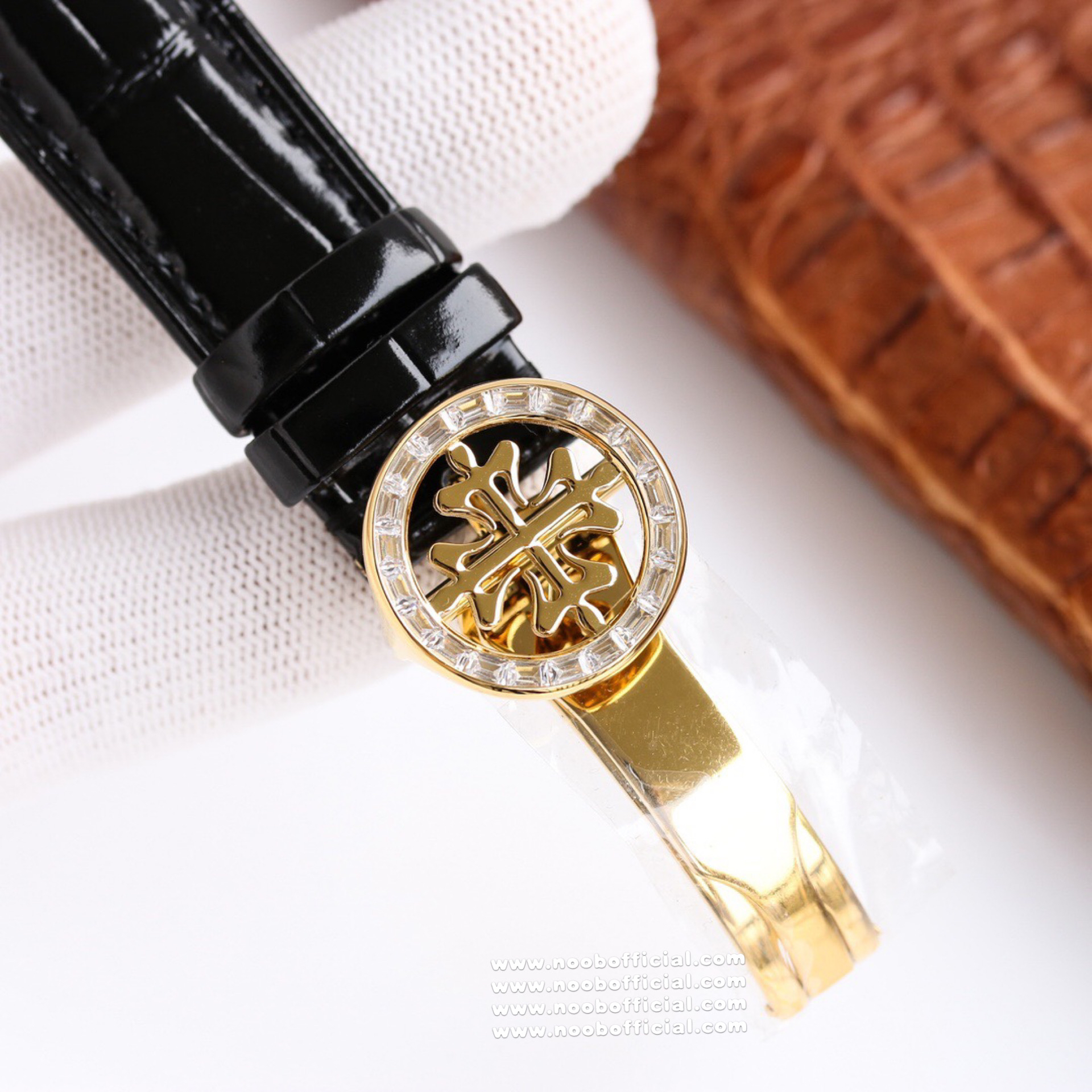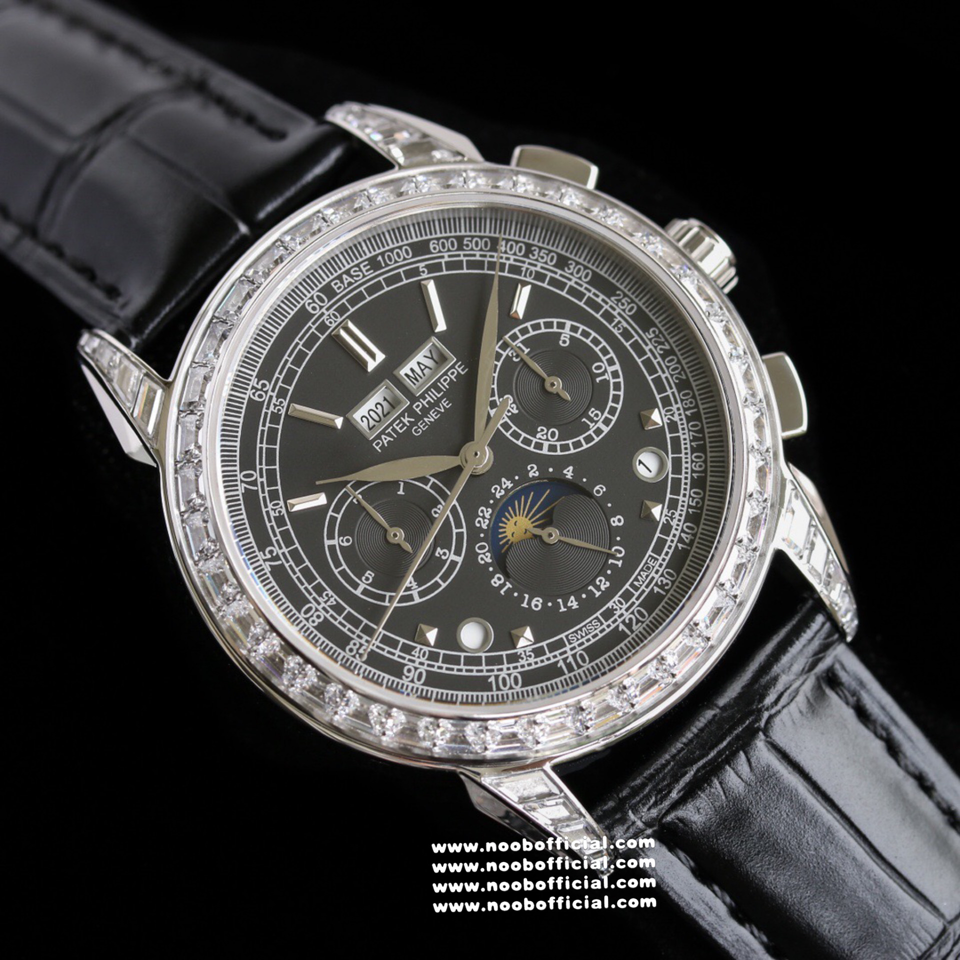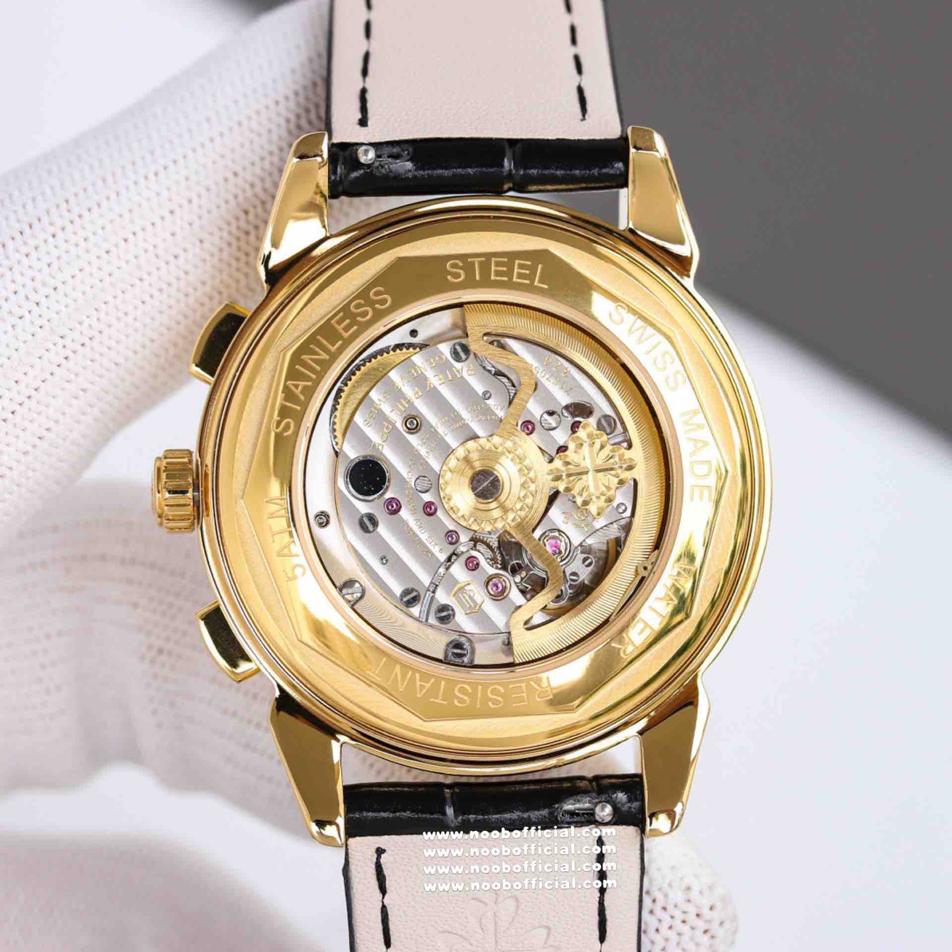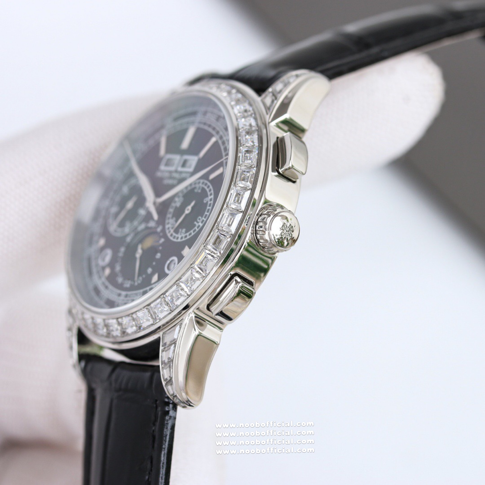 Noob Maker,N厂市场独家,耗时2年,18k包金版本和定制版手工镶钻工艺来啦,由20种不同钻组成,色泽艳丽,扣子也点缀21颗钻,搭配正品一致的美洲鳄鱼皮表带百达.翡丽超级复杂功能计时系列