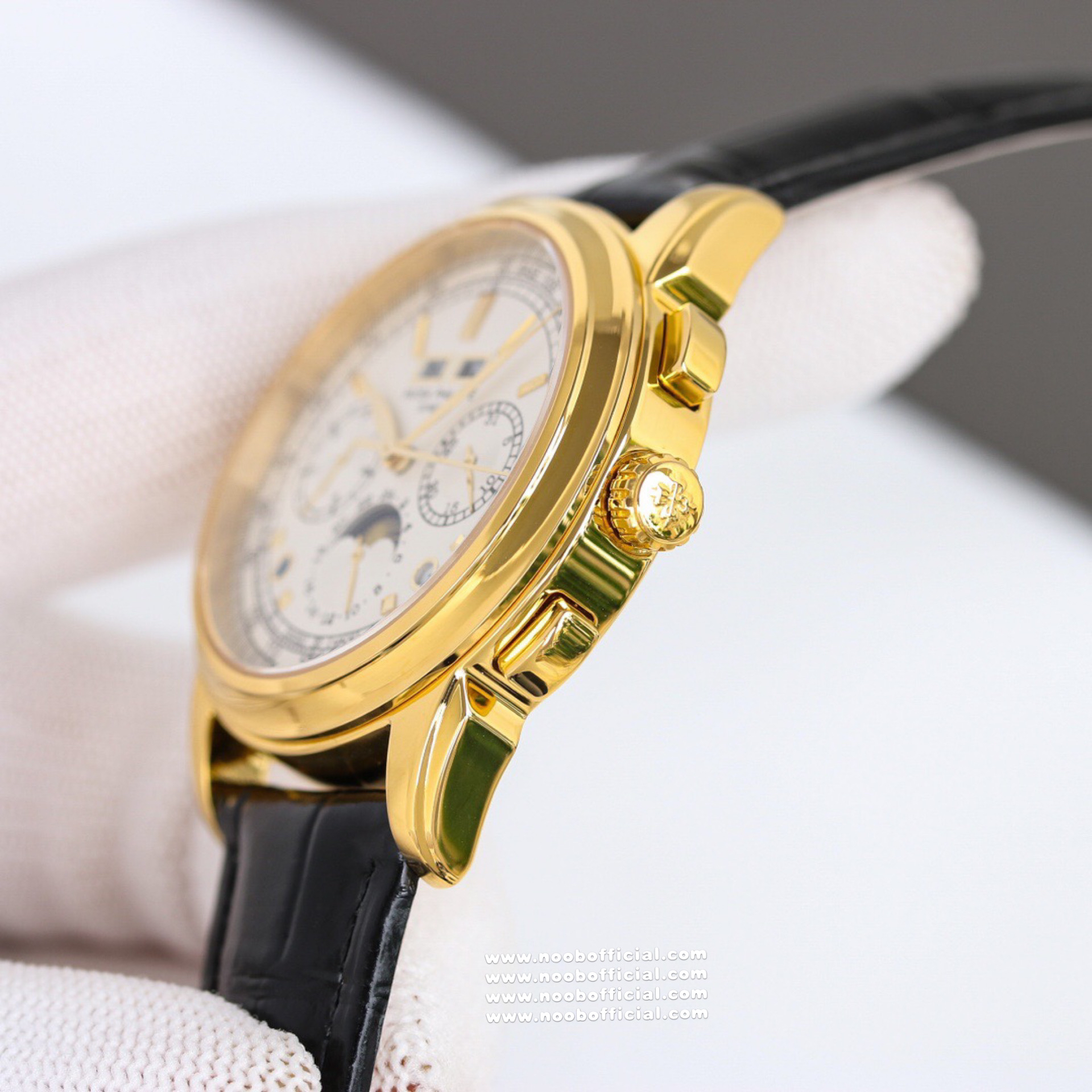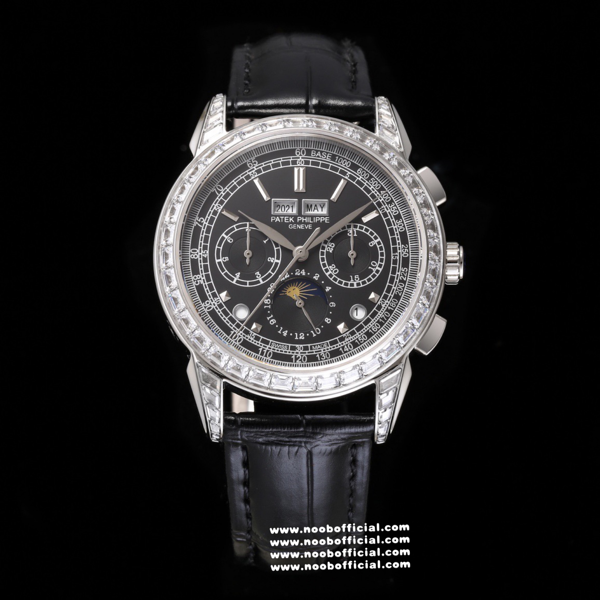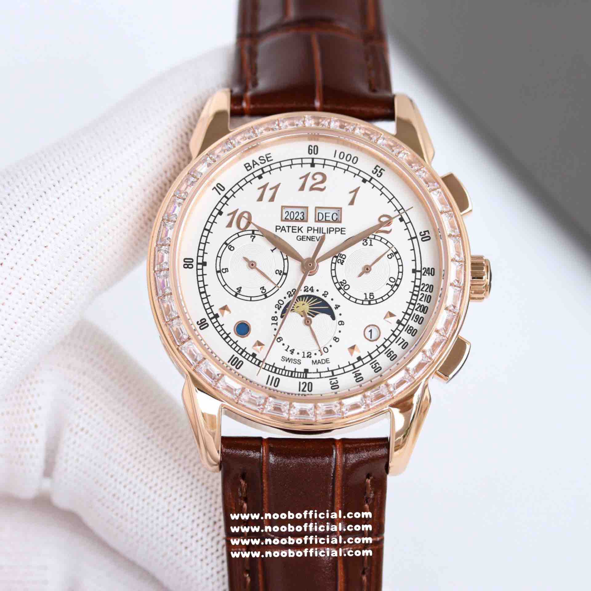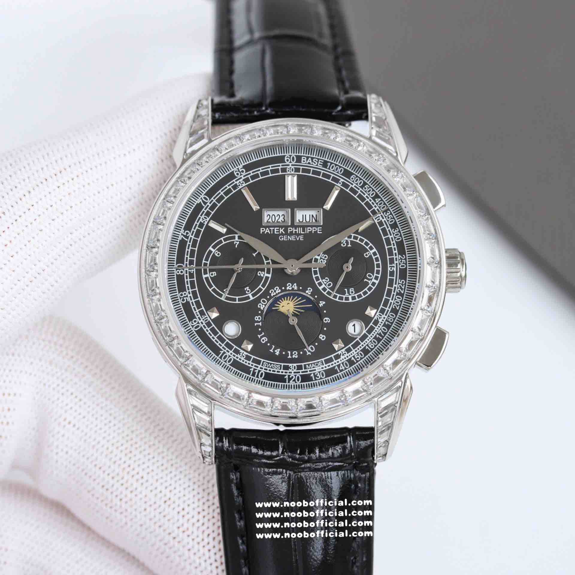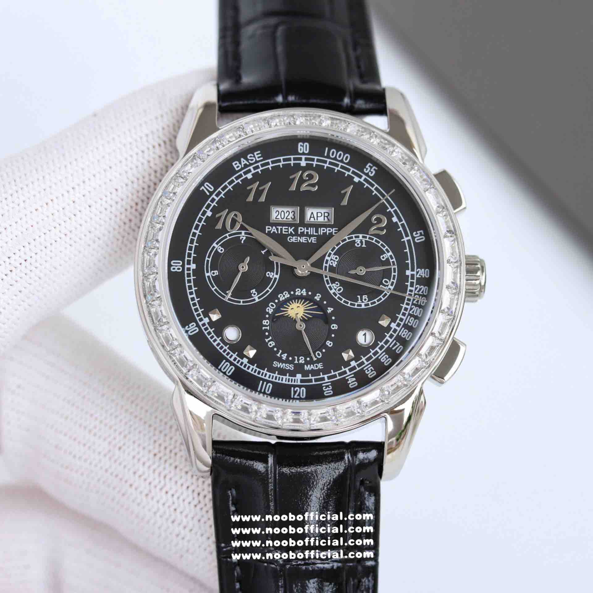 Noob Maker,N厂市场独家,耗时2年,18k包金版本和定制版手工镶钻工艺来啦,由20种不同钻组成,色泽艳丽,扣子也点缀21颗钻,搭配正品一致的美洲鳄鱼皮表带百达.翡丽超级复杂功能计时系列