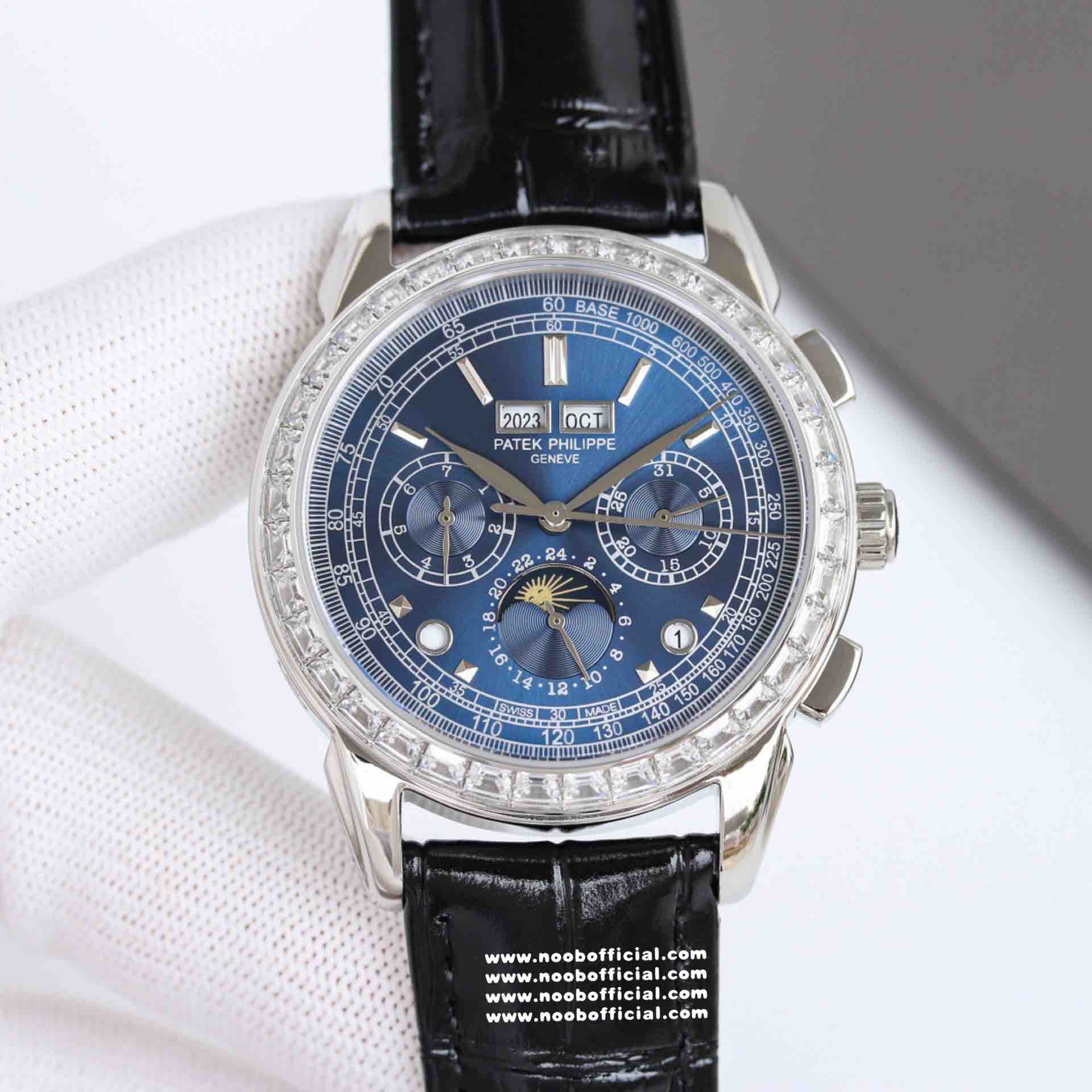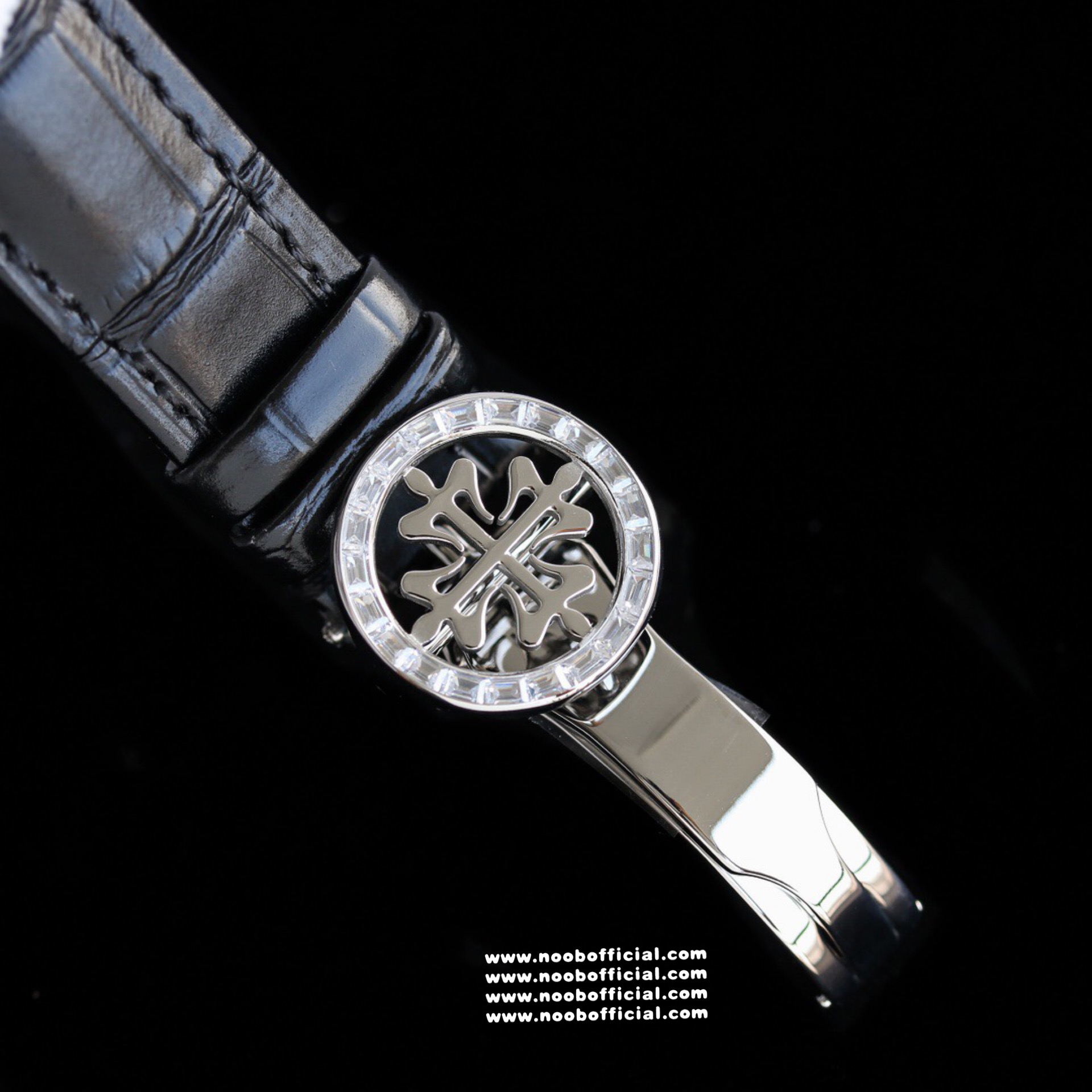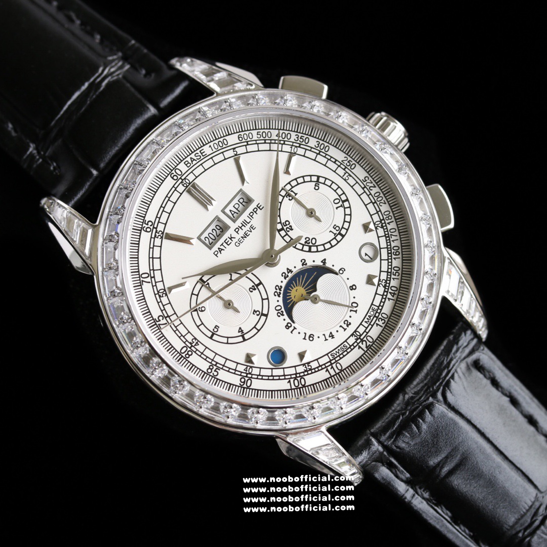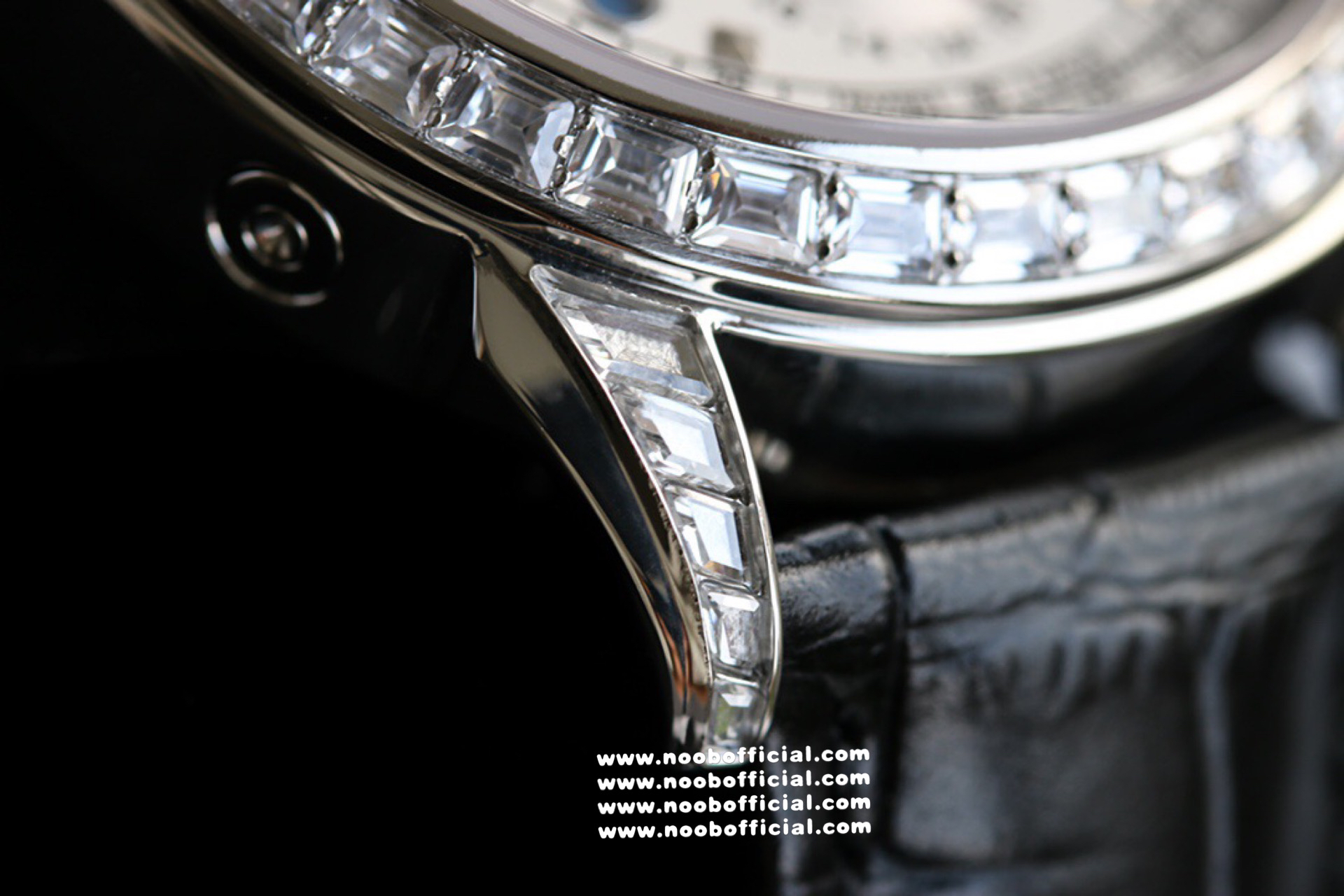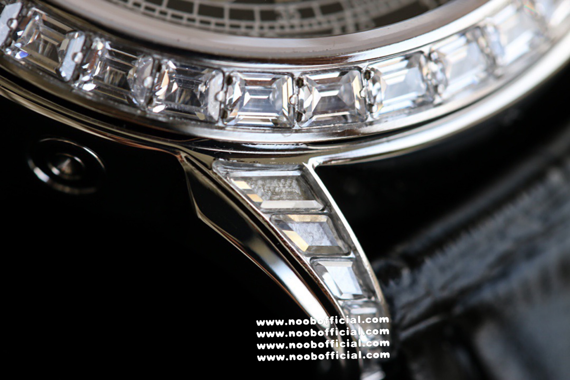 Noob Maker,N厂市场独家,耗时2年,18k包金版本和定制版手工镶钻工艺来啦,由20种不同钻组成,色泽艳丽,扣子也点缀21颗钻,搭配正品一致的美洲鳄鱼皮表带百达.翡丽超级复杂功能计时系列