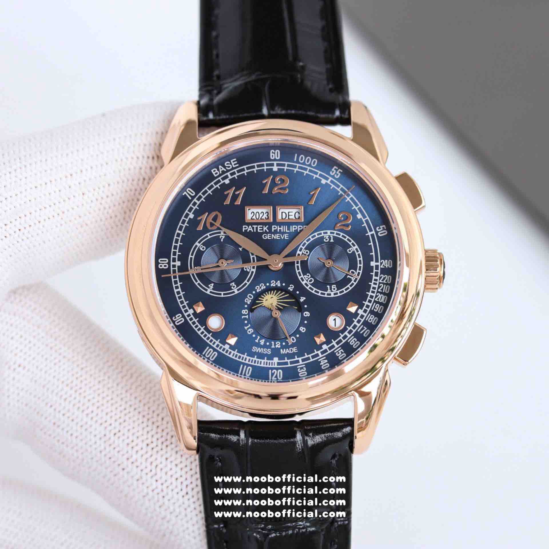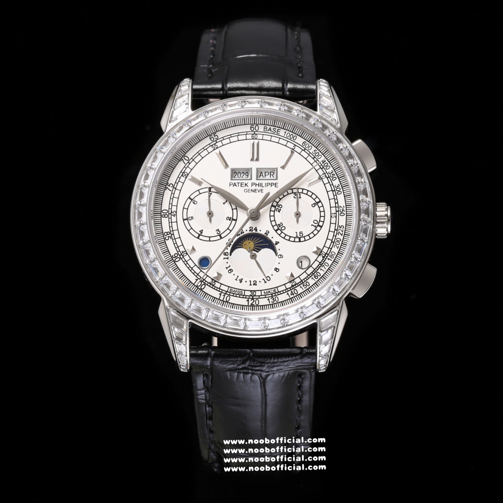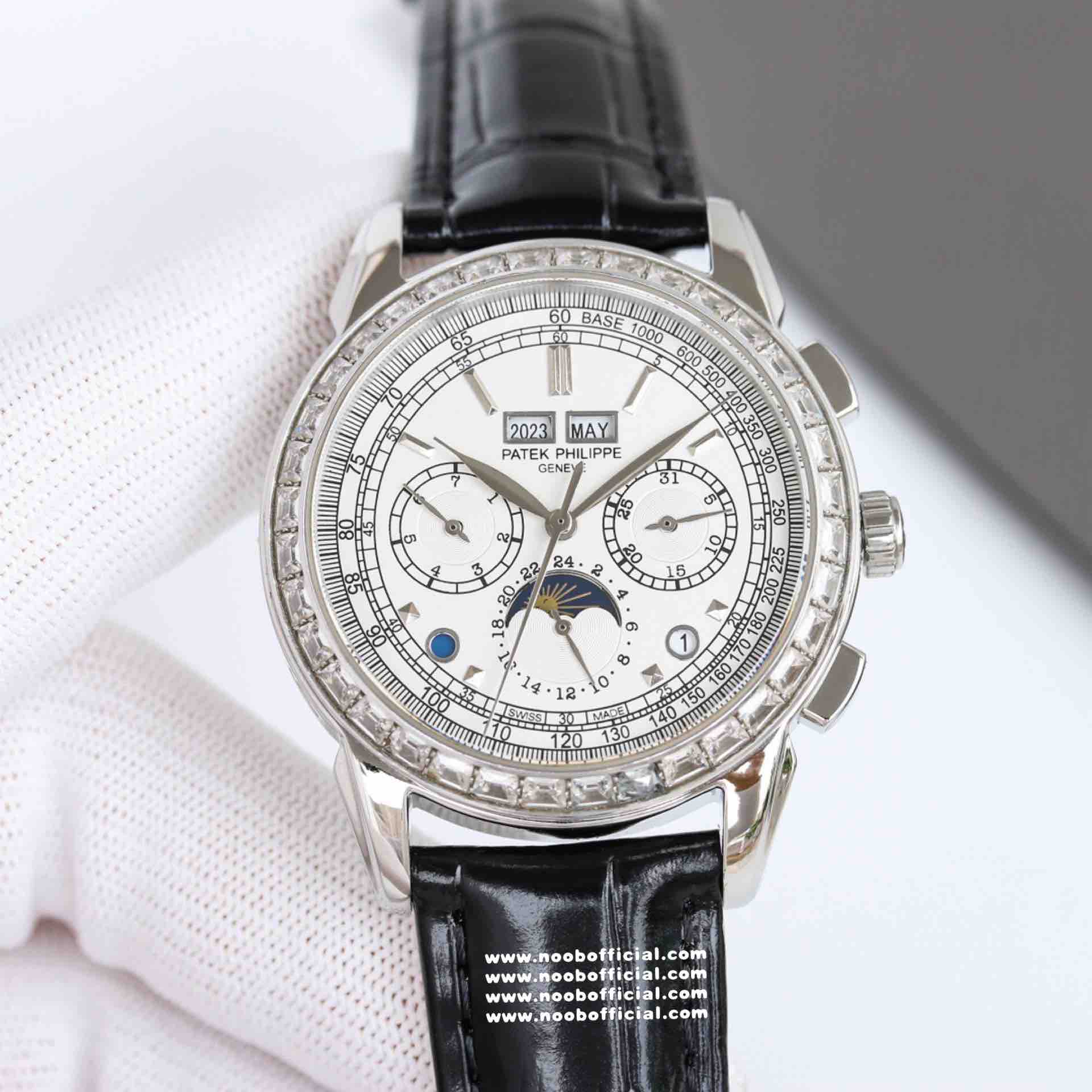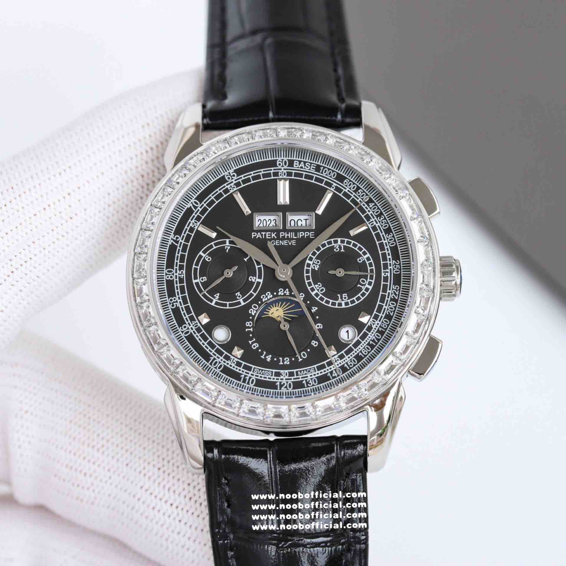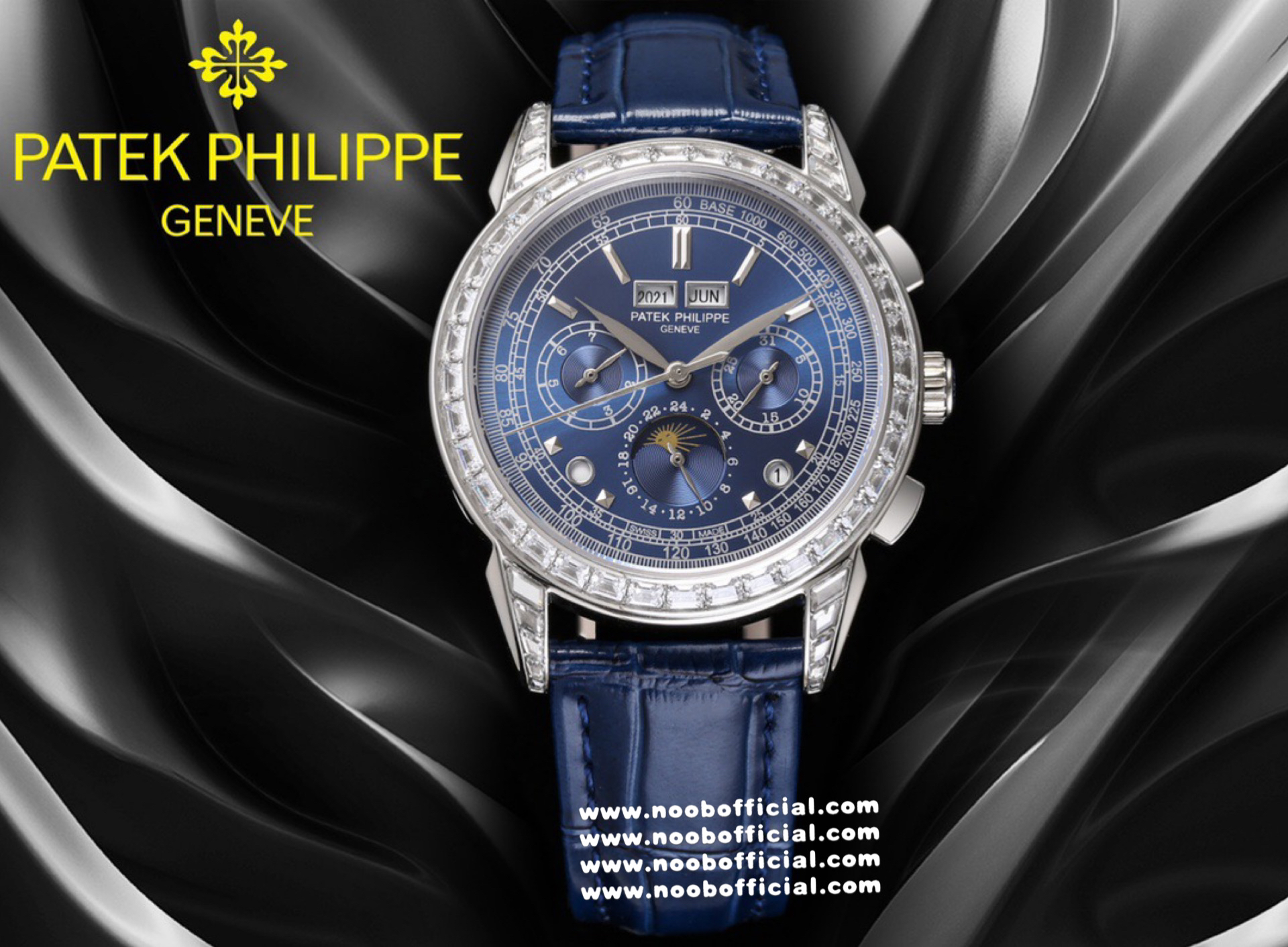 Noob Maker,N厂市场独家,耗时2年,18k包金版本和定制版手工镶钻工艺来啦,由20种不同钻组成,色泽艳丽,扣子也点缀21颗钻,搭配正品一致的美洲鳄鱼皮表带百达.翡丽超级复杂功能计时系列