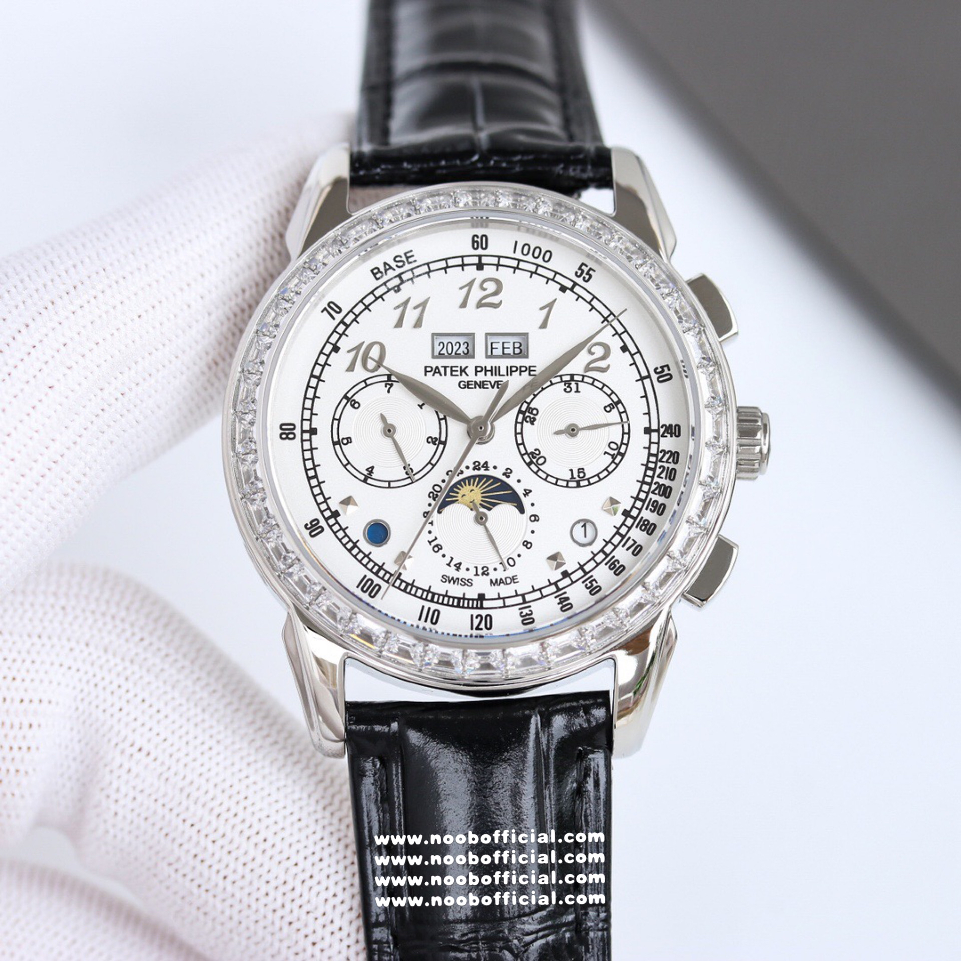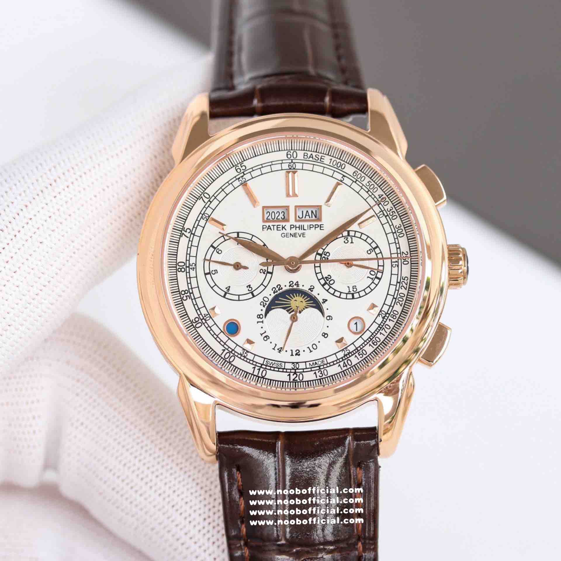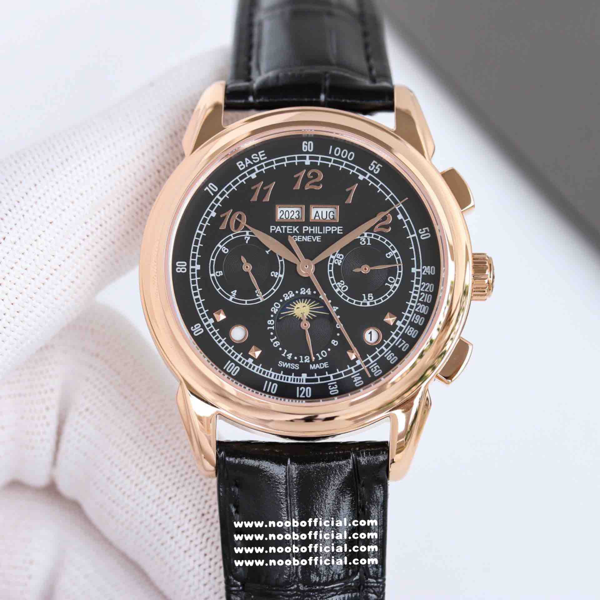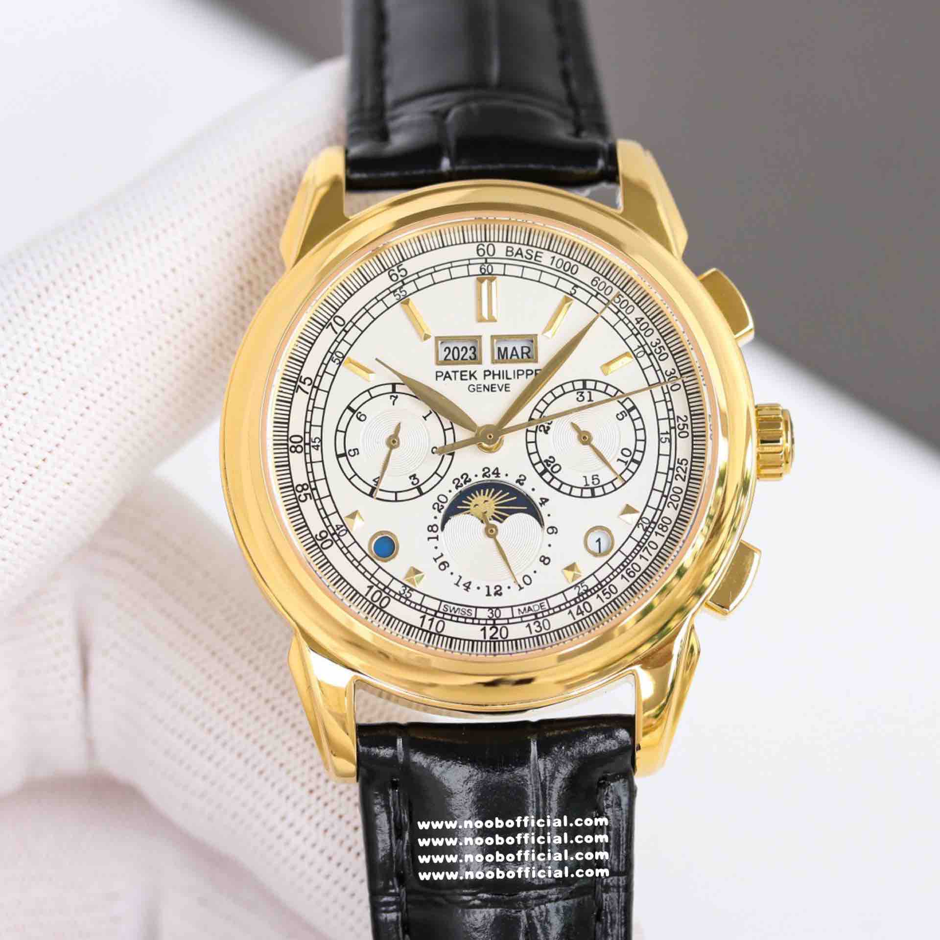 Noob Maker,N厂市场独家,耗时2年,18k包金版本和定制版手工镶钻工艺来啦,由20种不同钻组成,色泽艳丽,扣子也点缀21颗钻,搭配正品一致的美洲鳄鱼皮表带百达.翡丽超级复杂功能计时系列