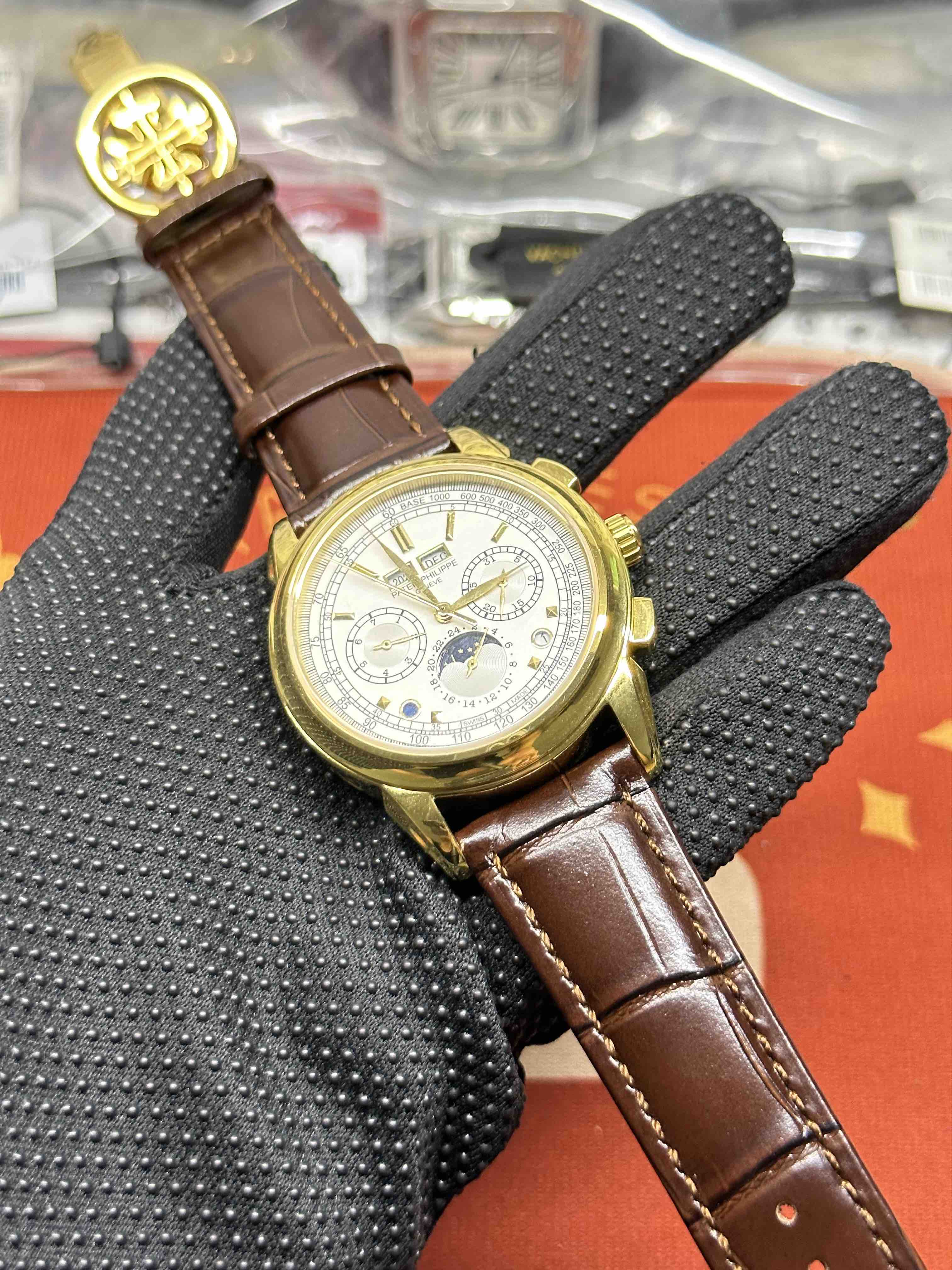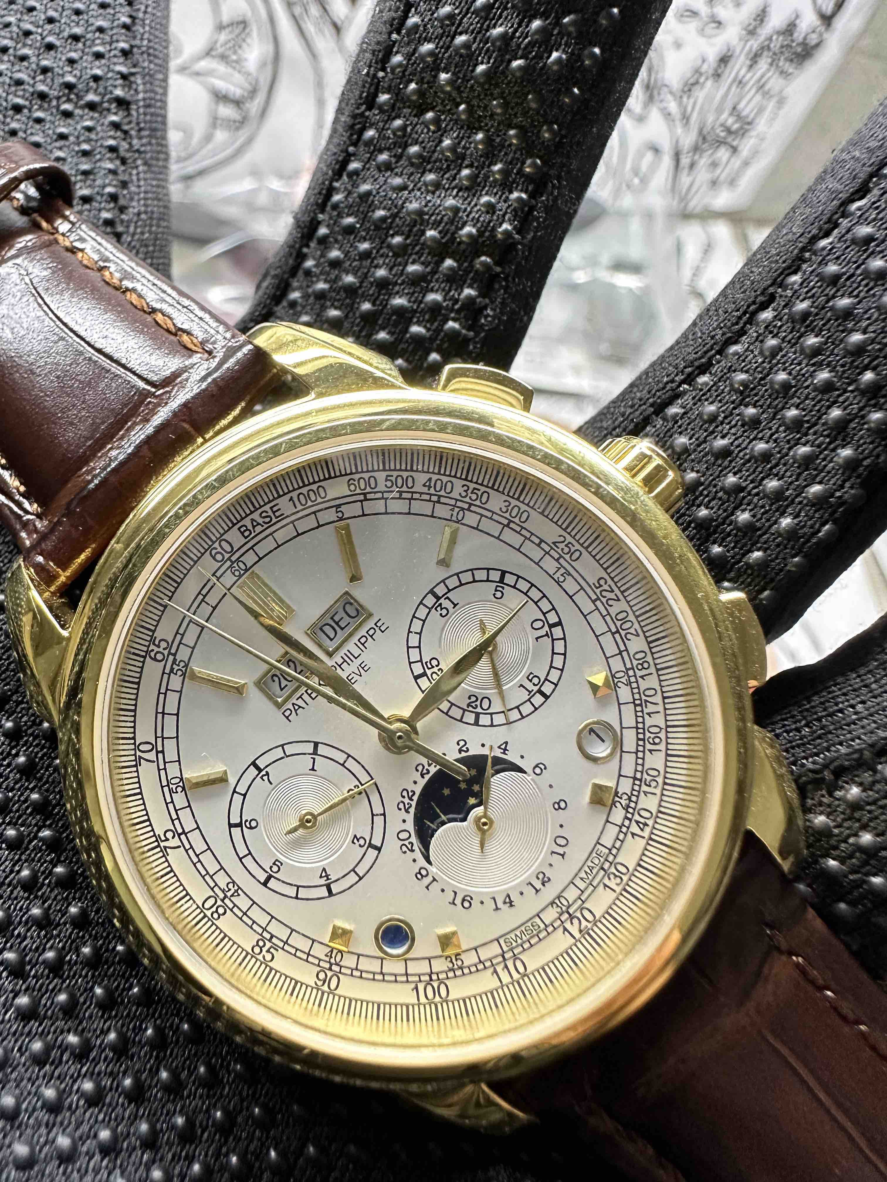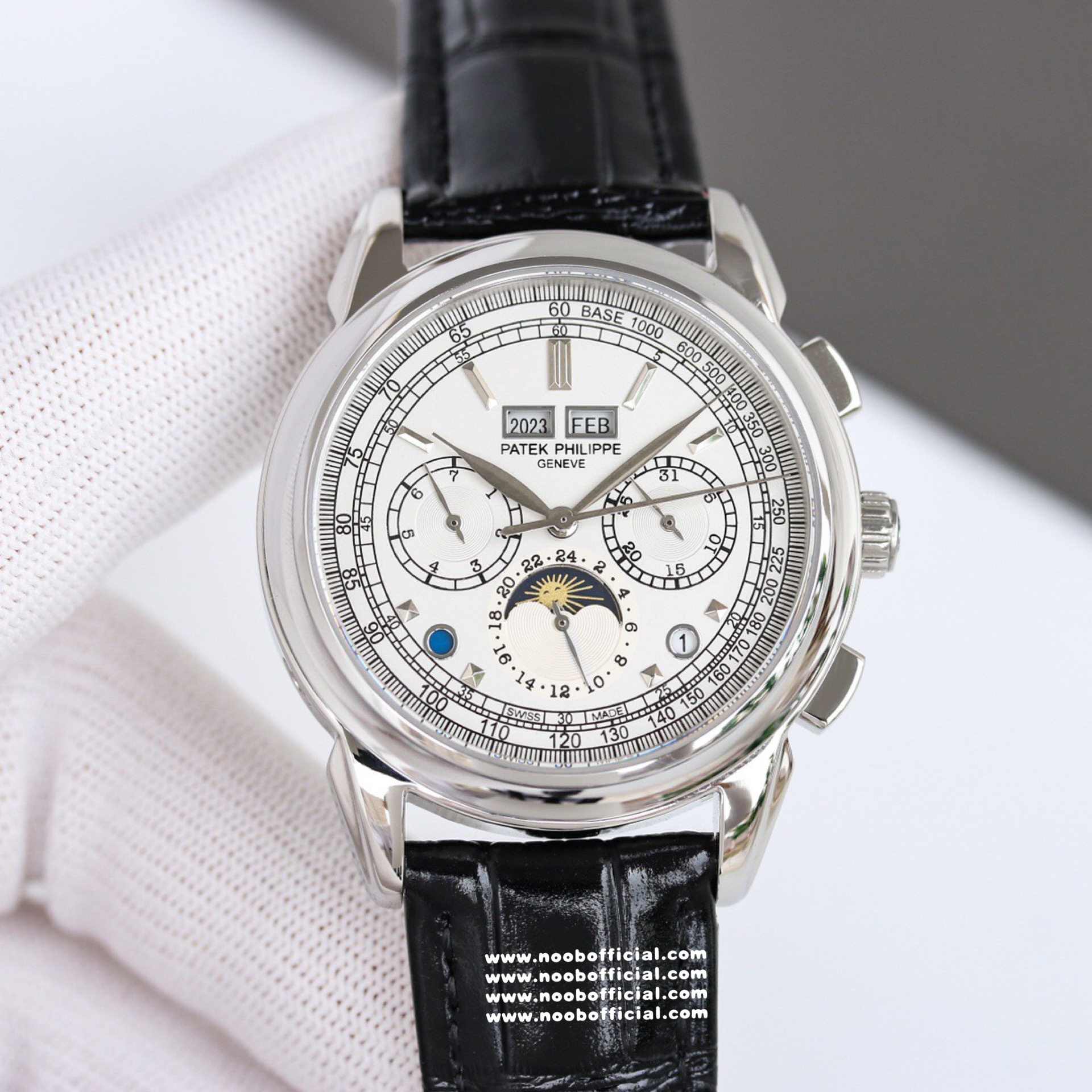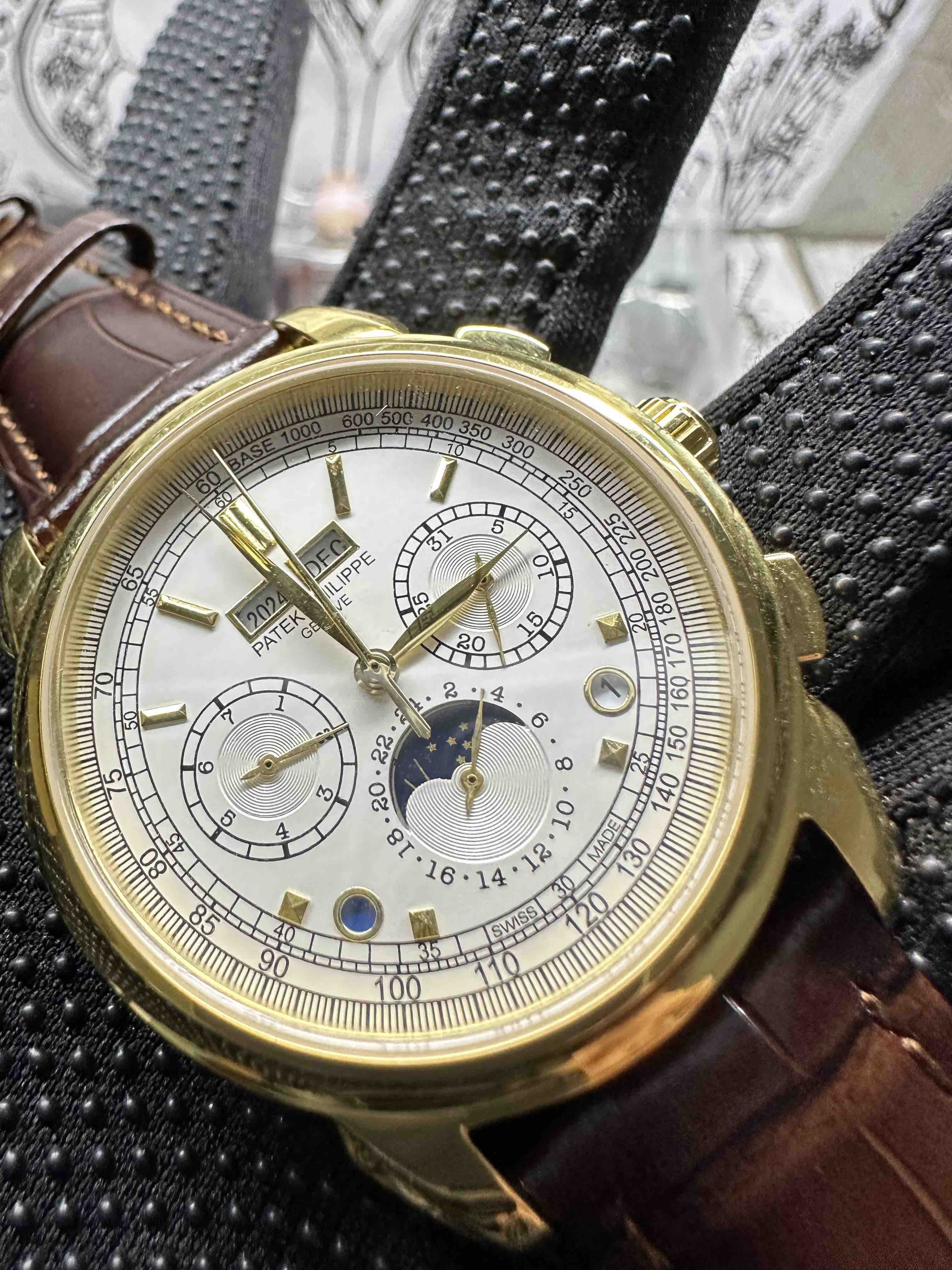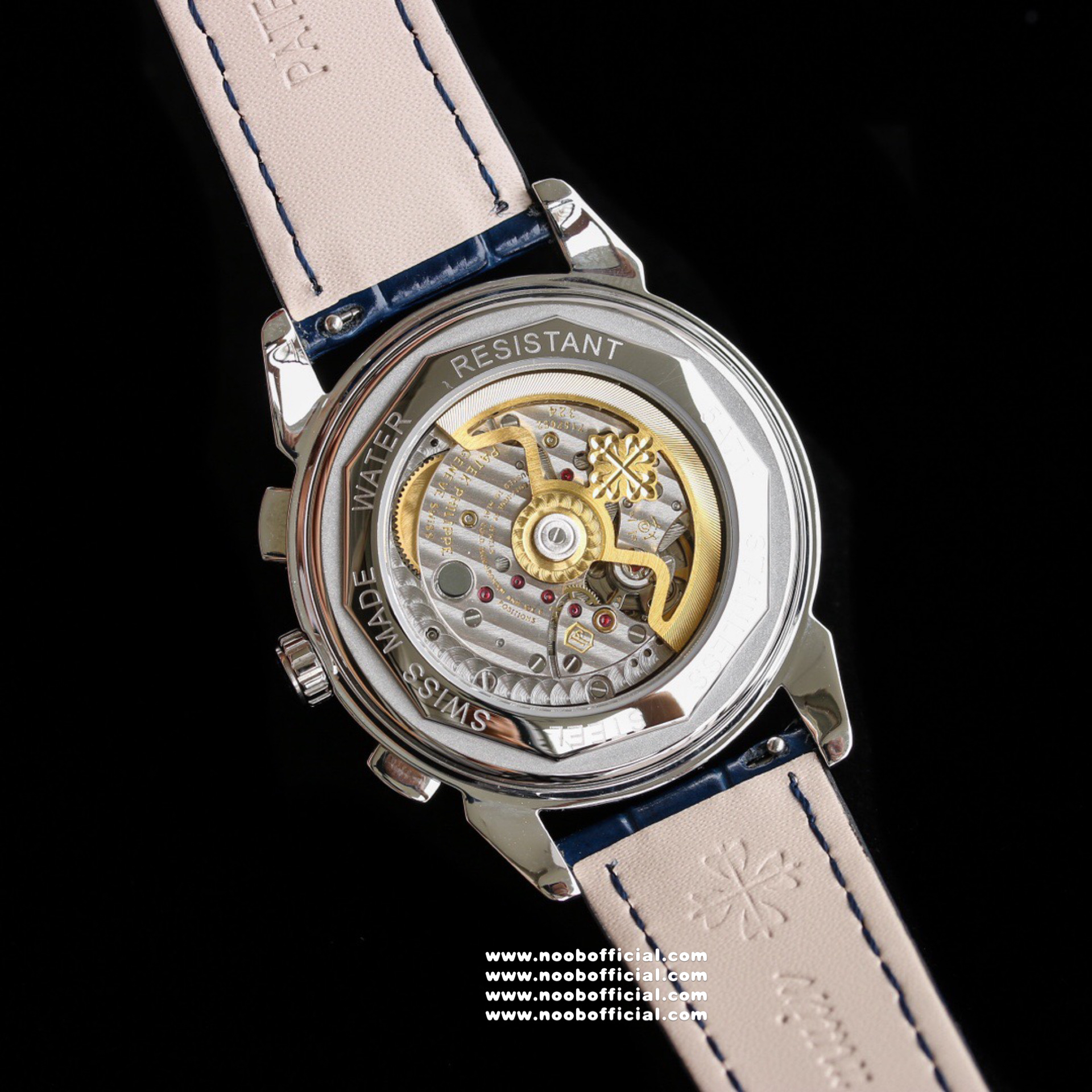 Noob Maker,N厂市场独家,耗时2年,18k包金版本和定制版手工镶钻工艺来啦,由20种不同钻组成,色泽艳丽,扣子也点缀21颗钻,搭配正品一致的美洲鳄鱼皮表带百达.翡丽超级复杂功能计时系列