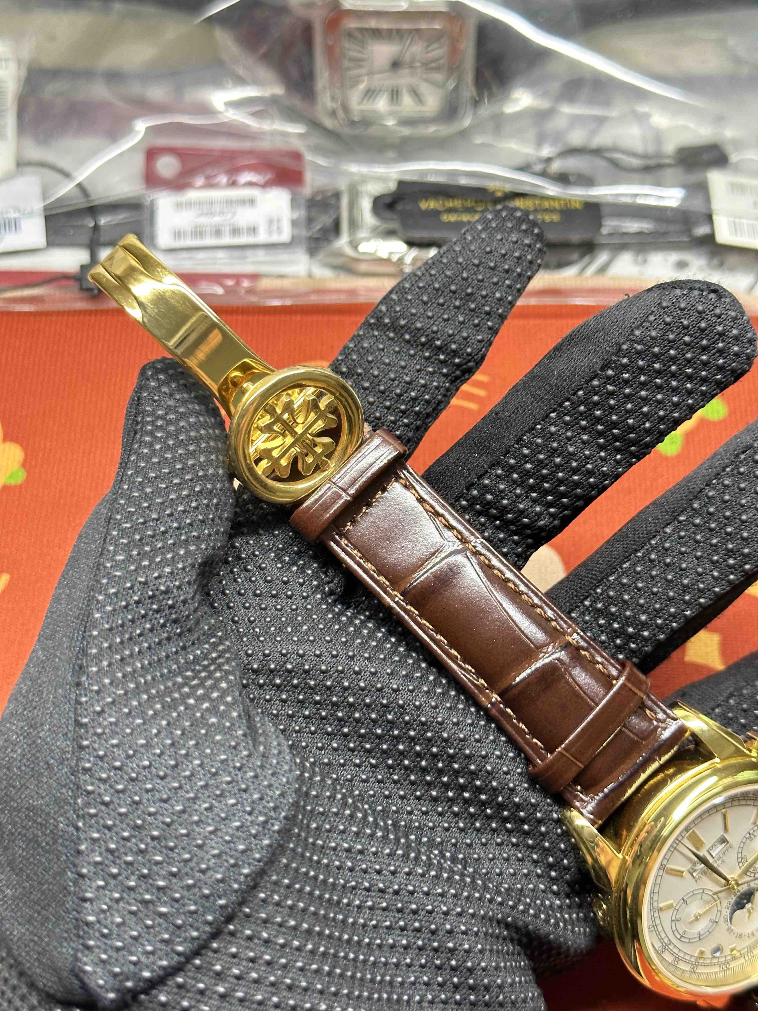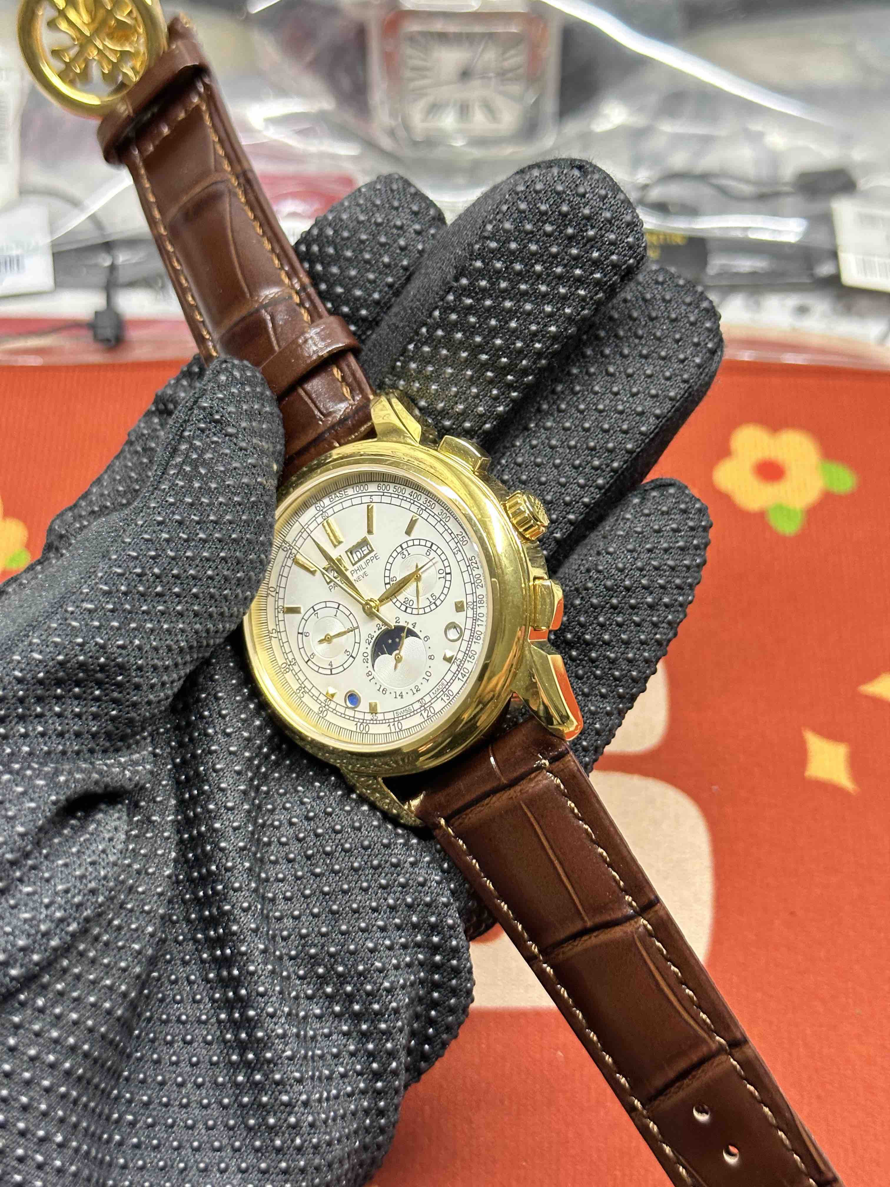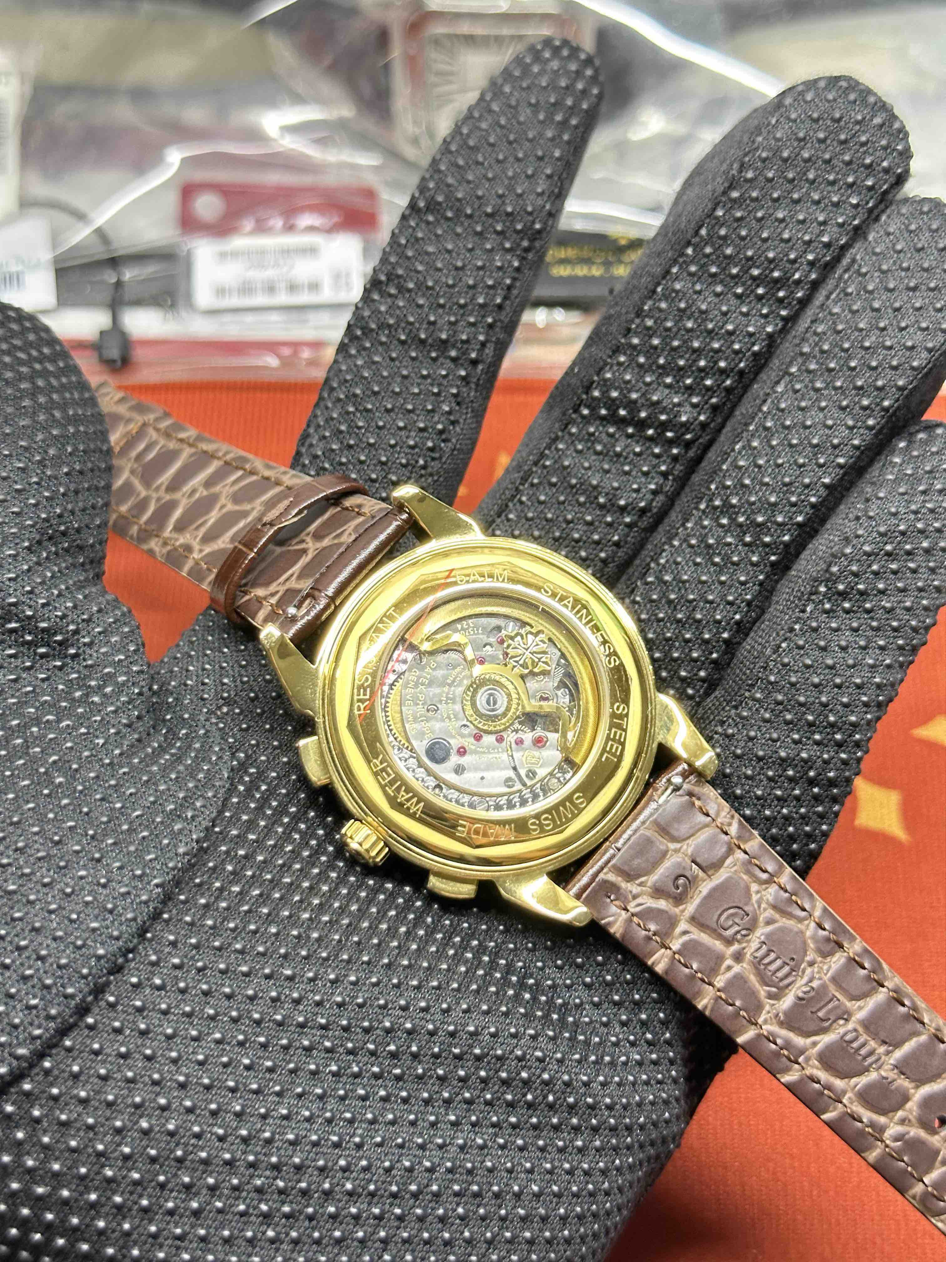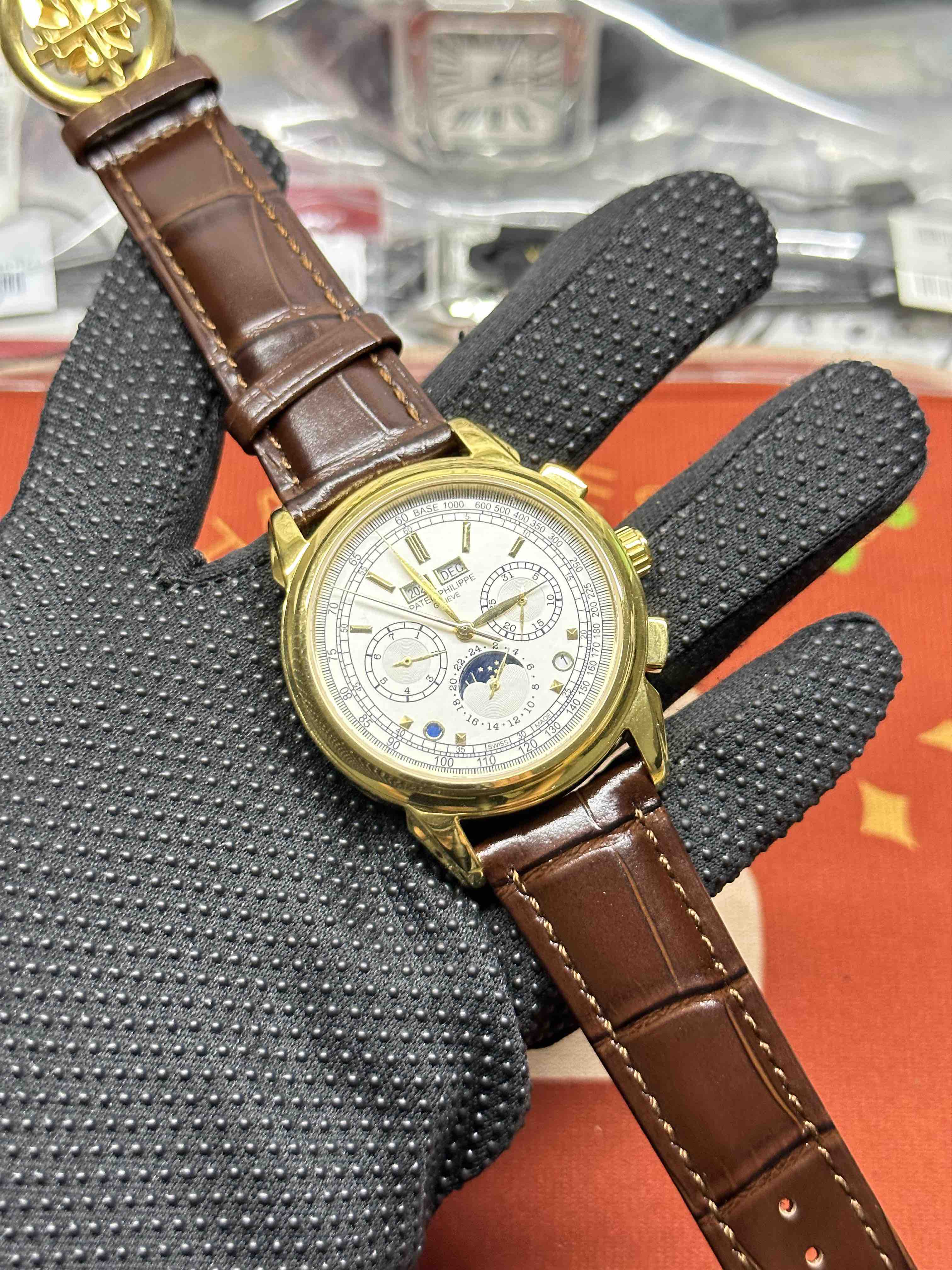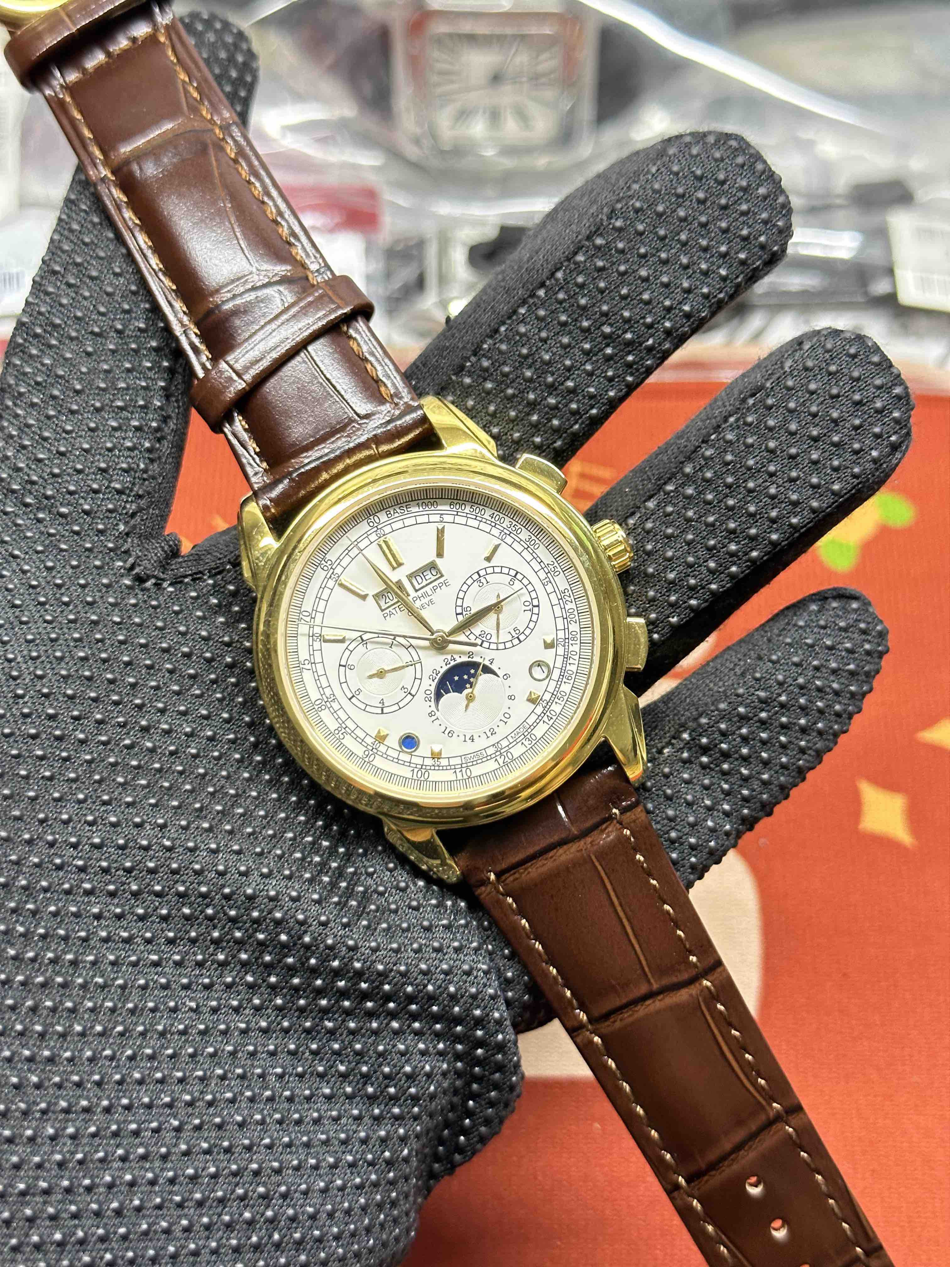 Noob Maker,N厂市场独家,耗时2年,18k包金版本和定制版手工镶钻工艺来啦,由20种不同钻组成,色泽艳丽,扣子也点缀21颗钻,搭配正品一致的美洲鳄鱼皮表带百达.翡丽超级复杂功能计时系列!用心之作,细节方面: