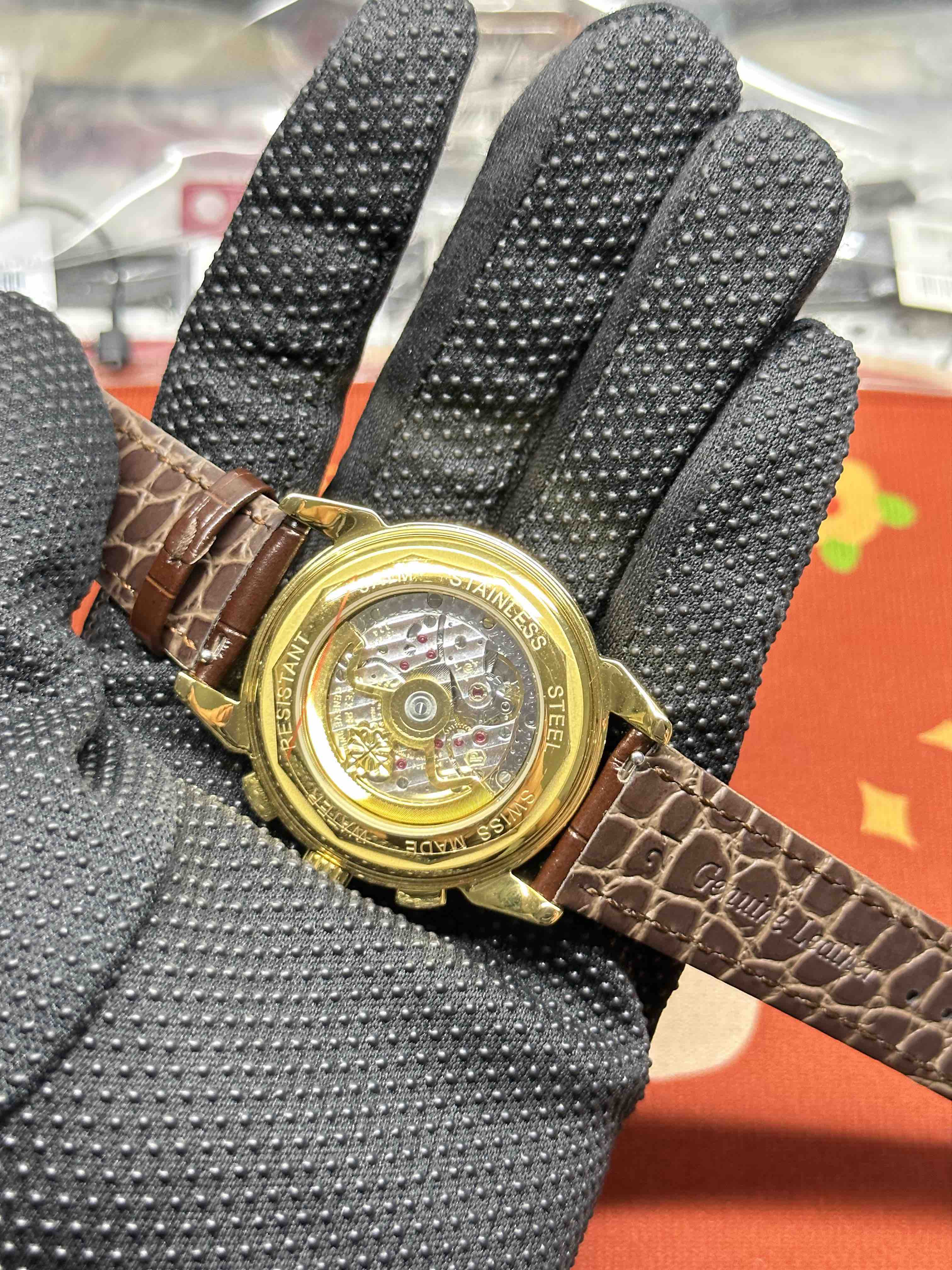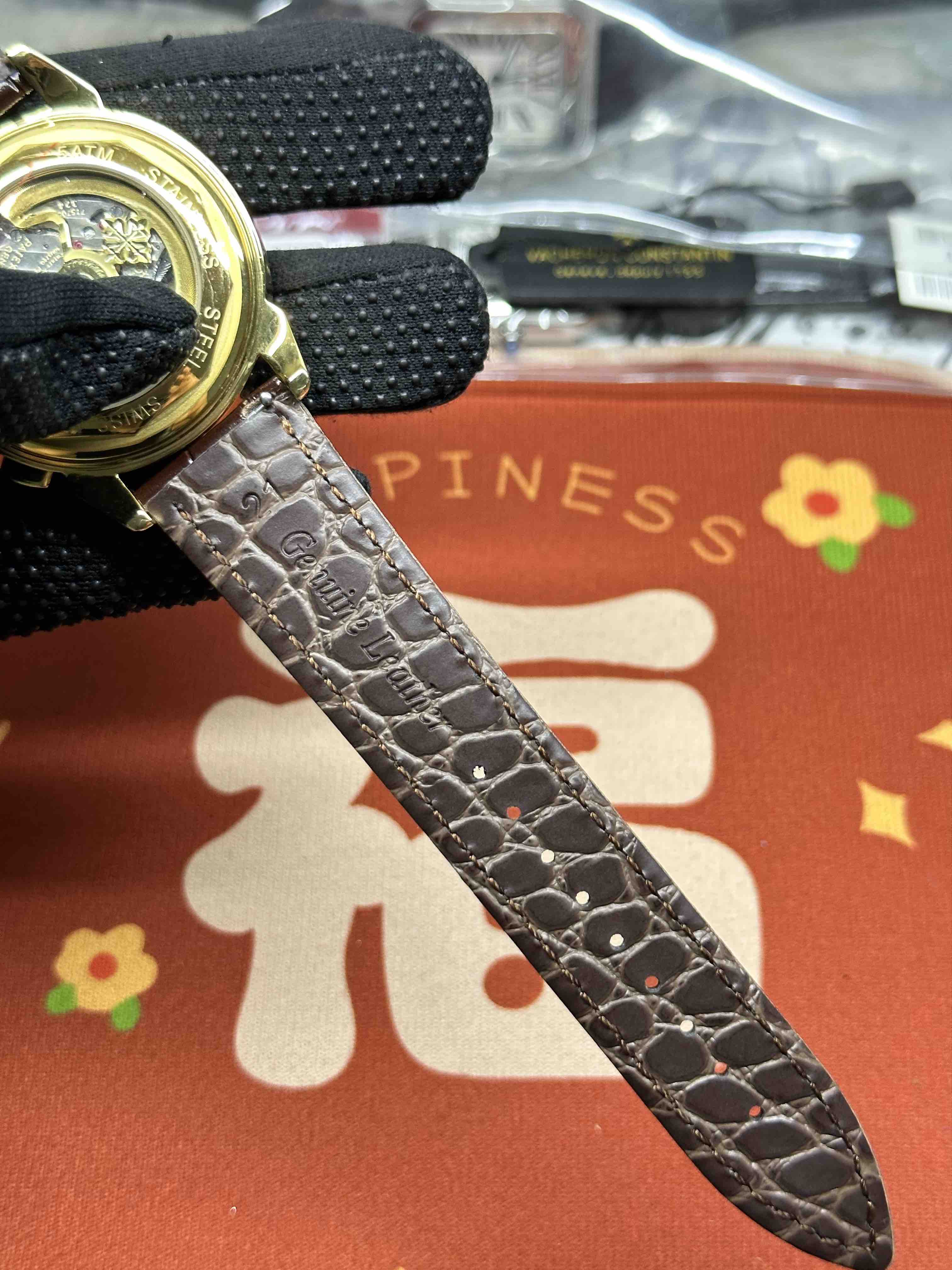 3:表壳为316L全钢镀纳米铂金表技术,圈口点缀南非钻,更彰显高贵大气,表带搭配意大利头层小牛皮!更显大气上档次!