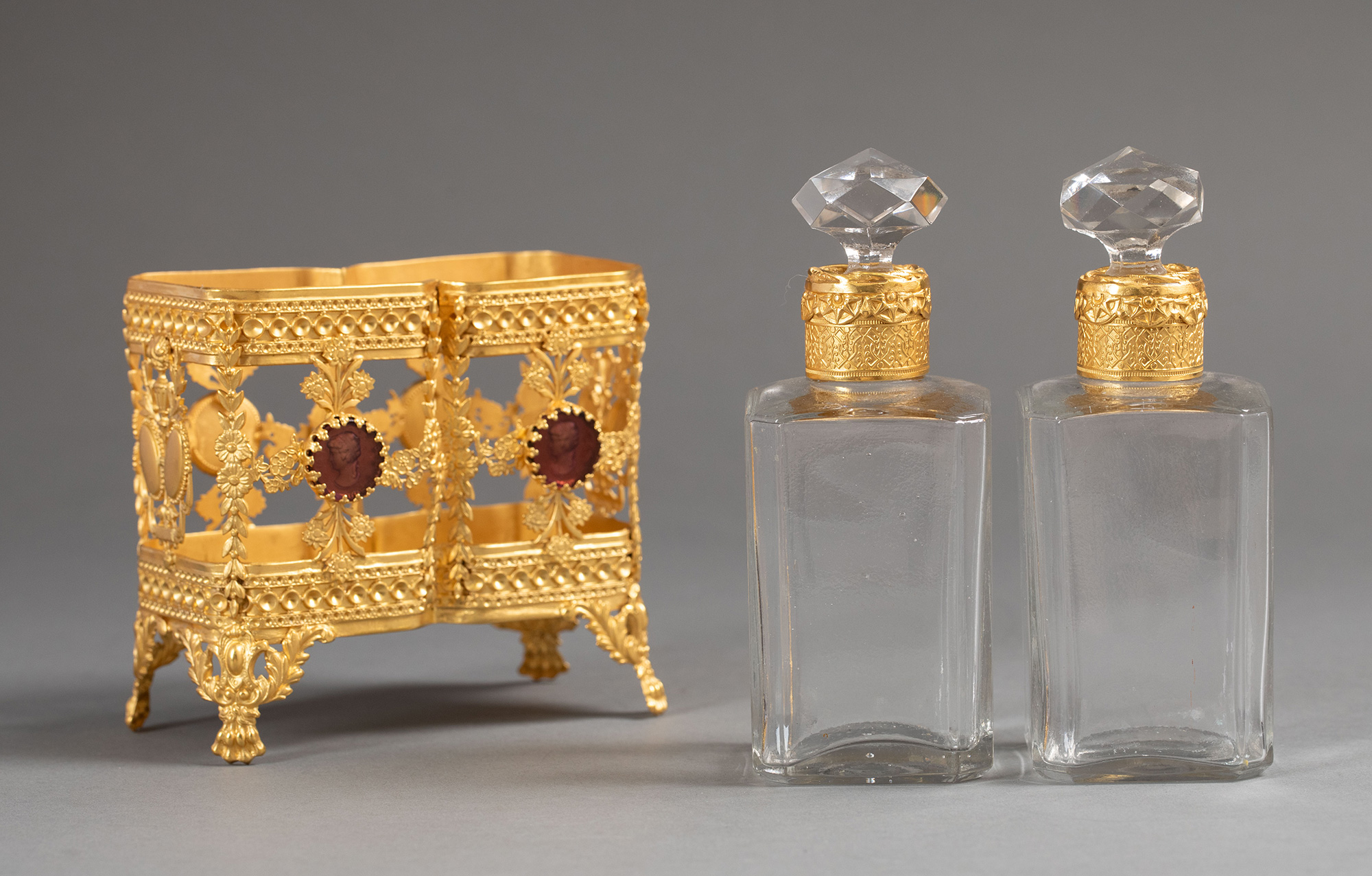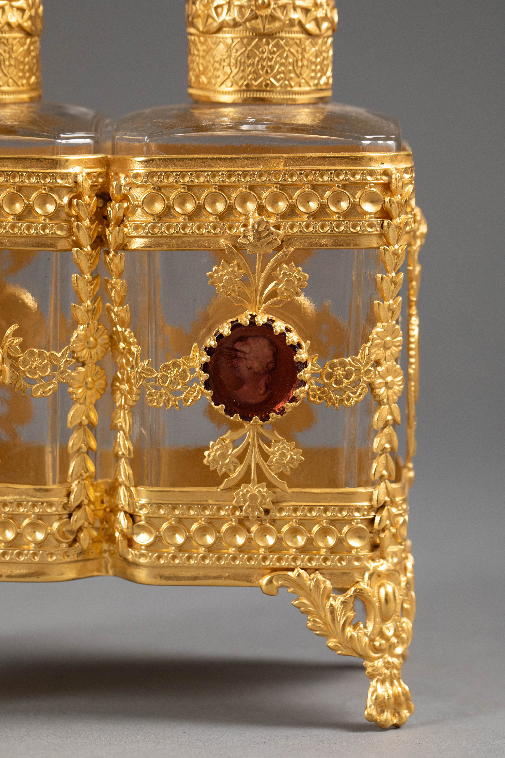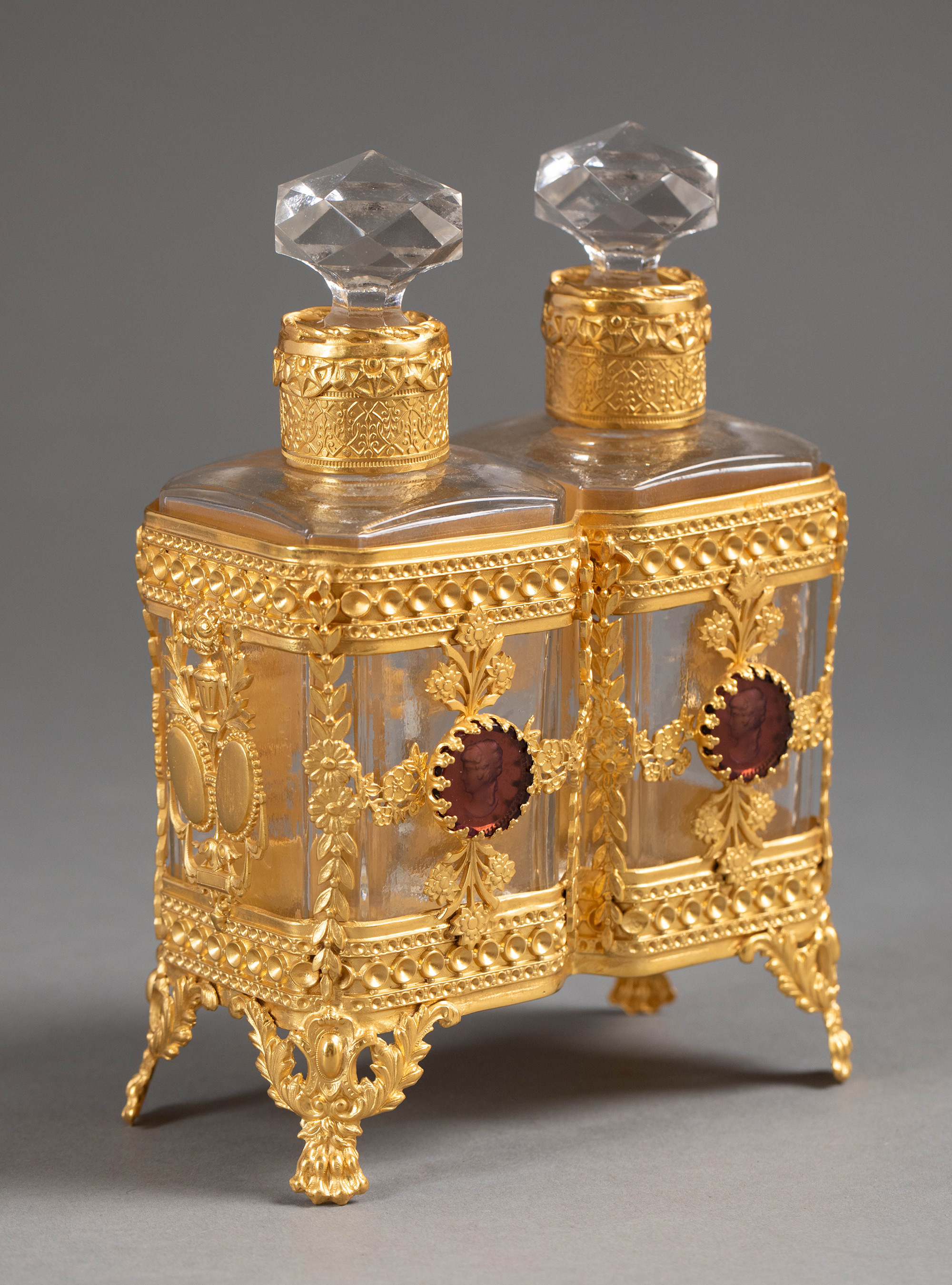 19世纪末法国出品花卉卷叶纹铜鎏金精雕镶嵌古典女子肖像主题卡梅奥装饰水晶香水瓶一对