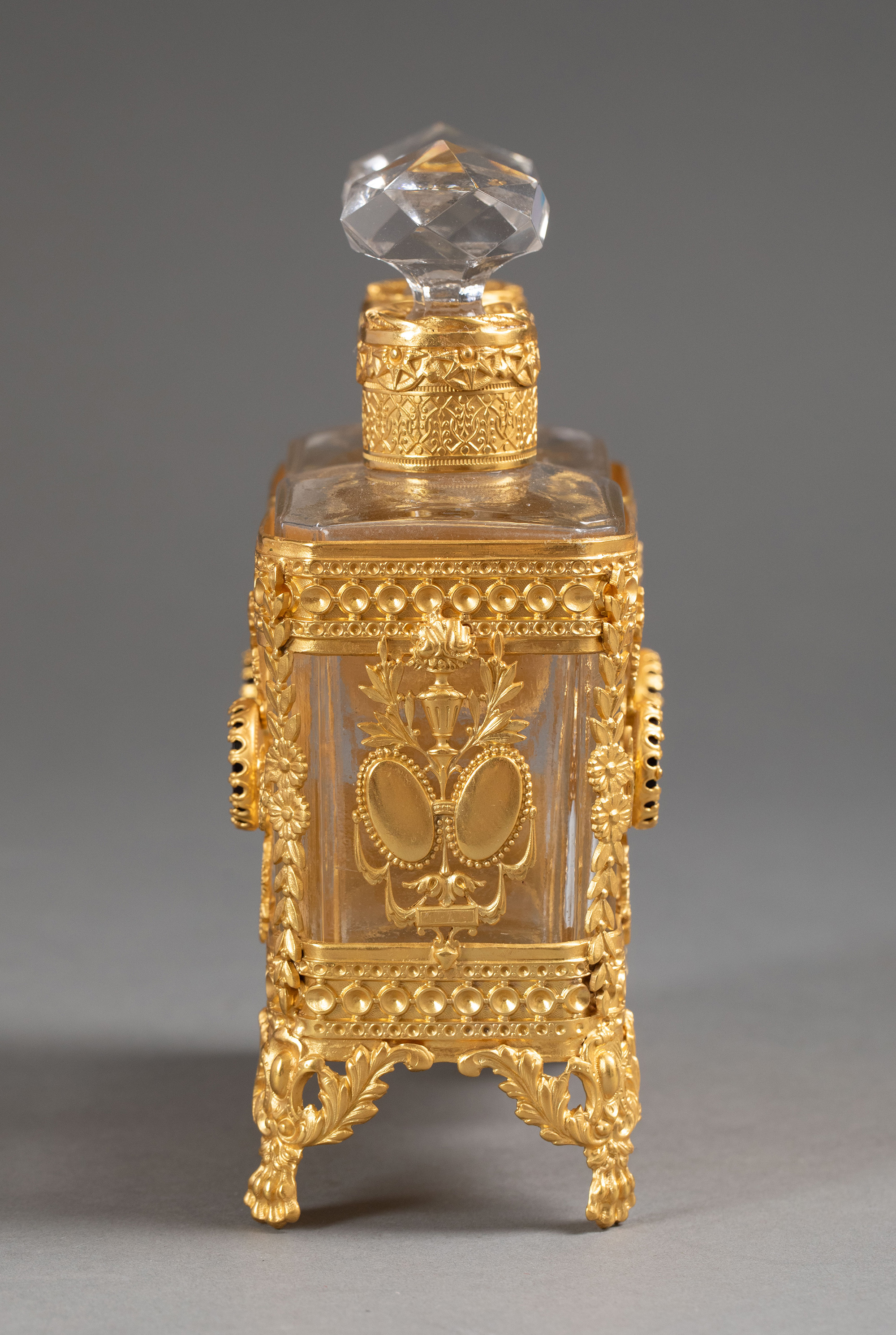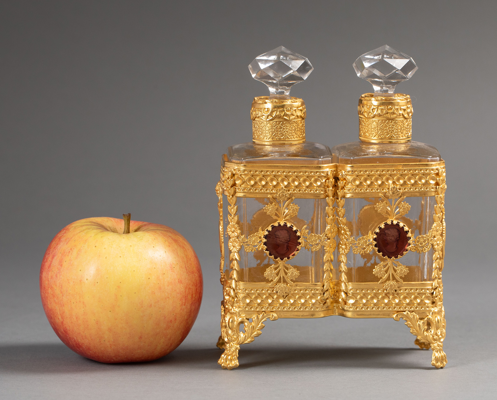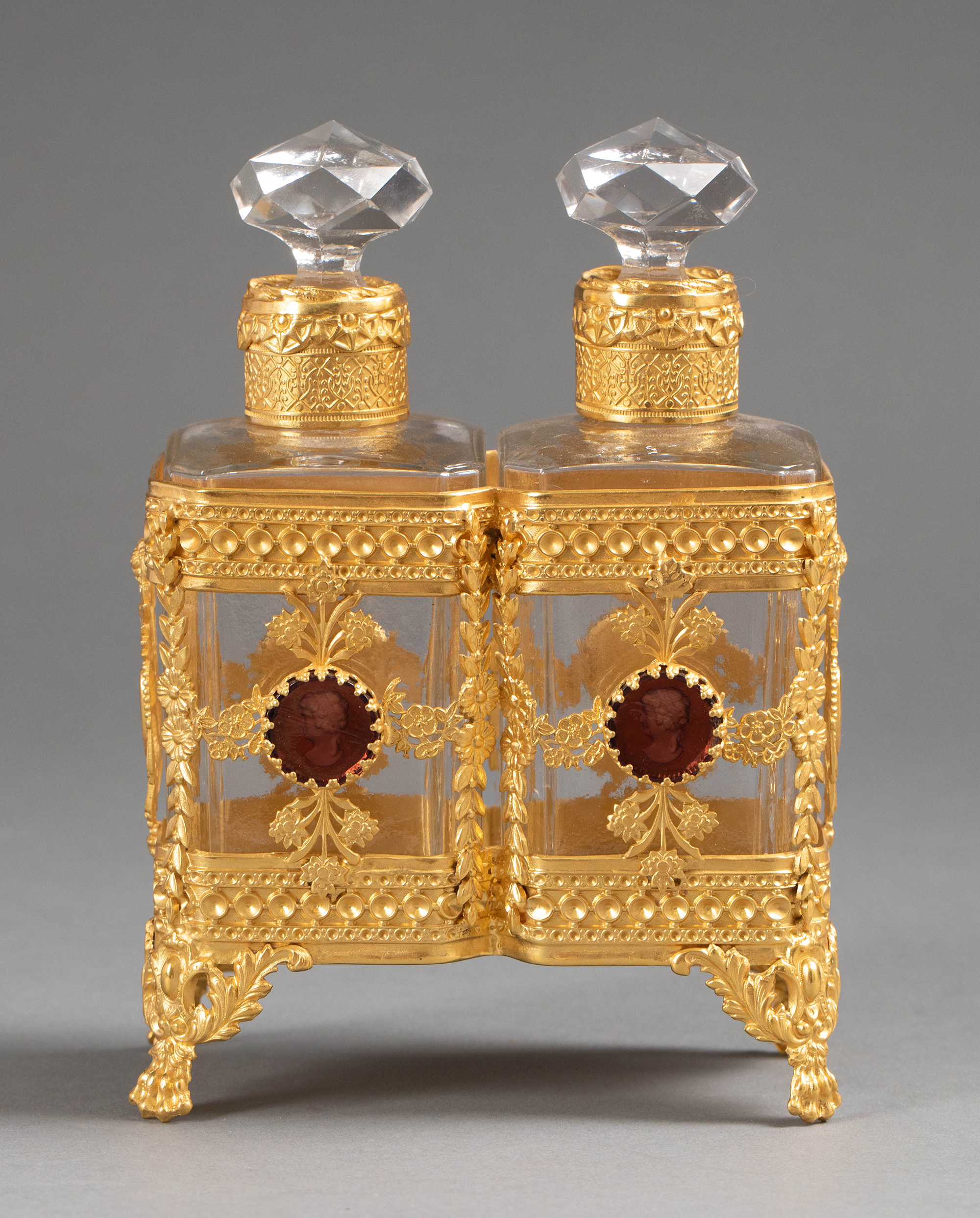 独角鹿西洋古董19世纪末法国出品花卉卷叶纹铜鎏金精雕镶嵌古典女子肖像主题卡梅奥装饰水晶香水瓶一对