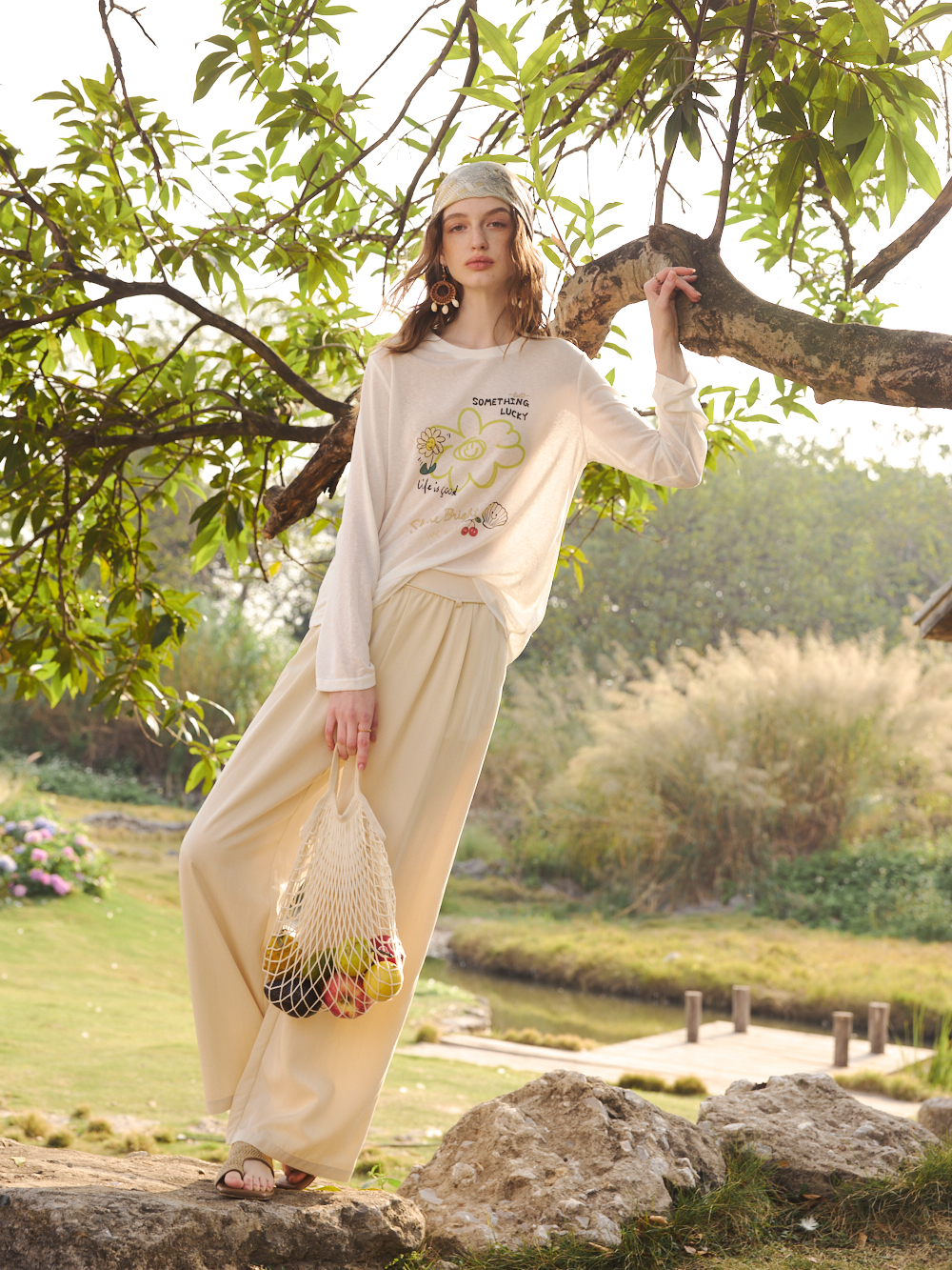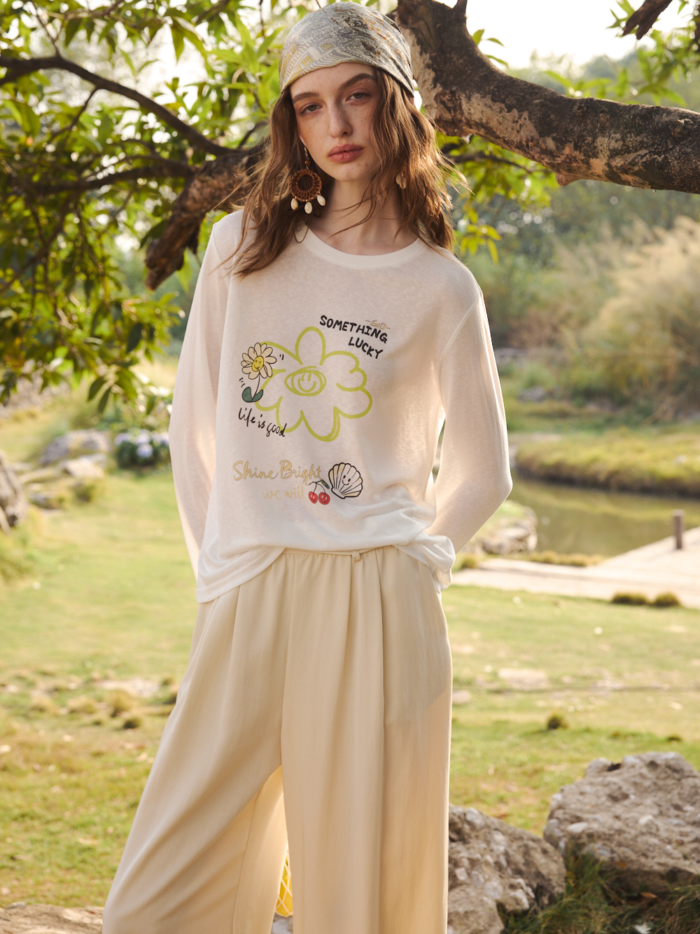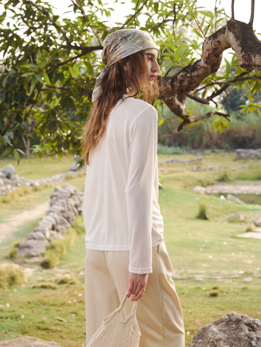 OLrain欧芮儿2026新款T恤白色长袖宽松透气休闲上衣