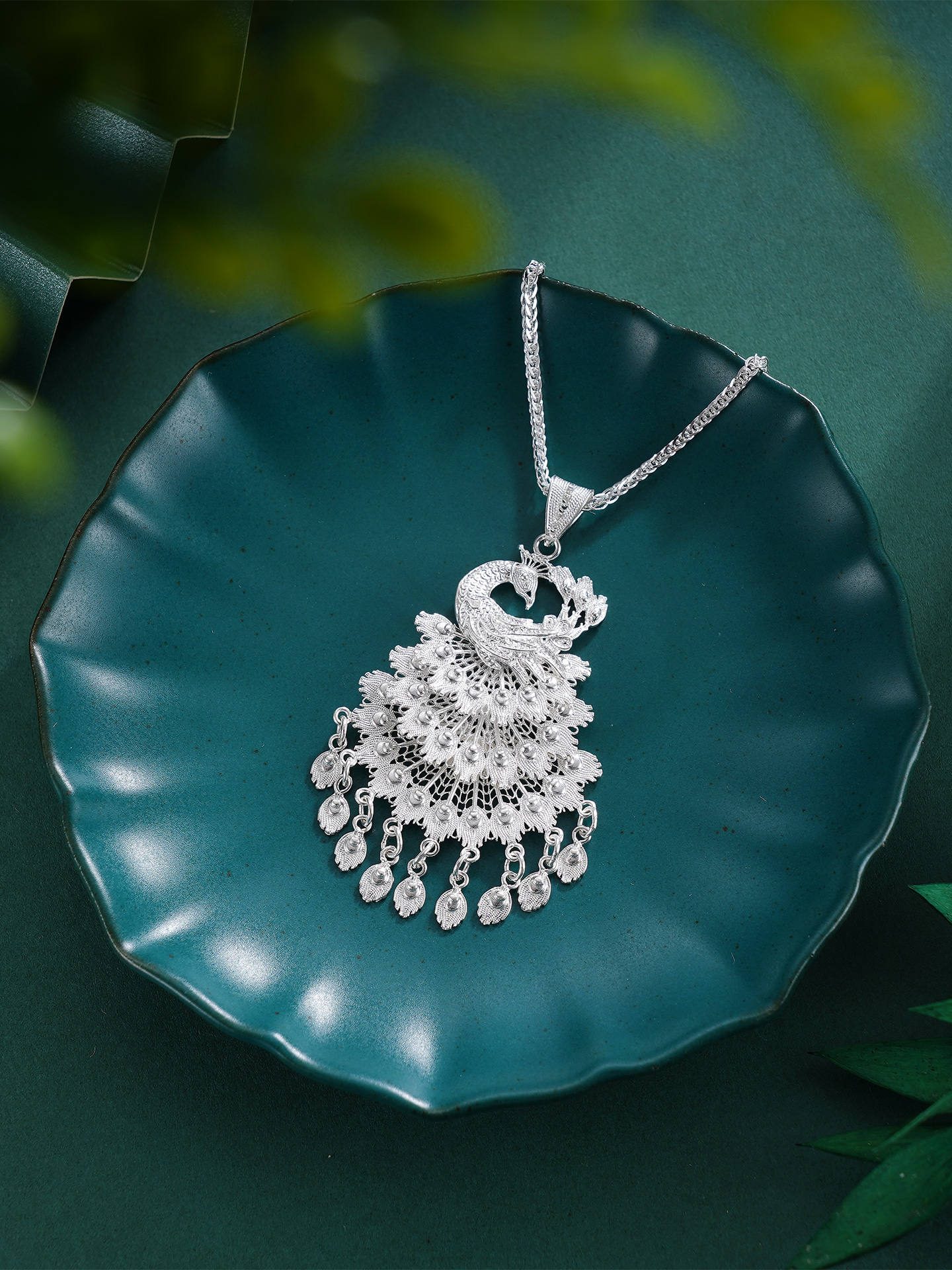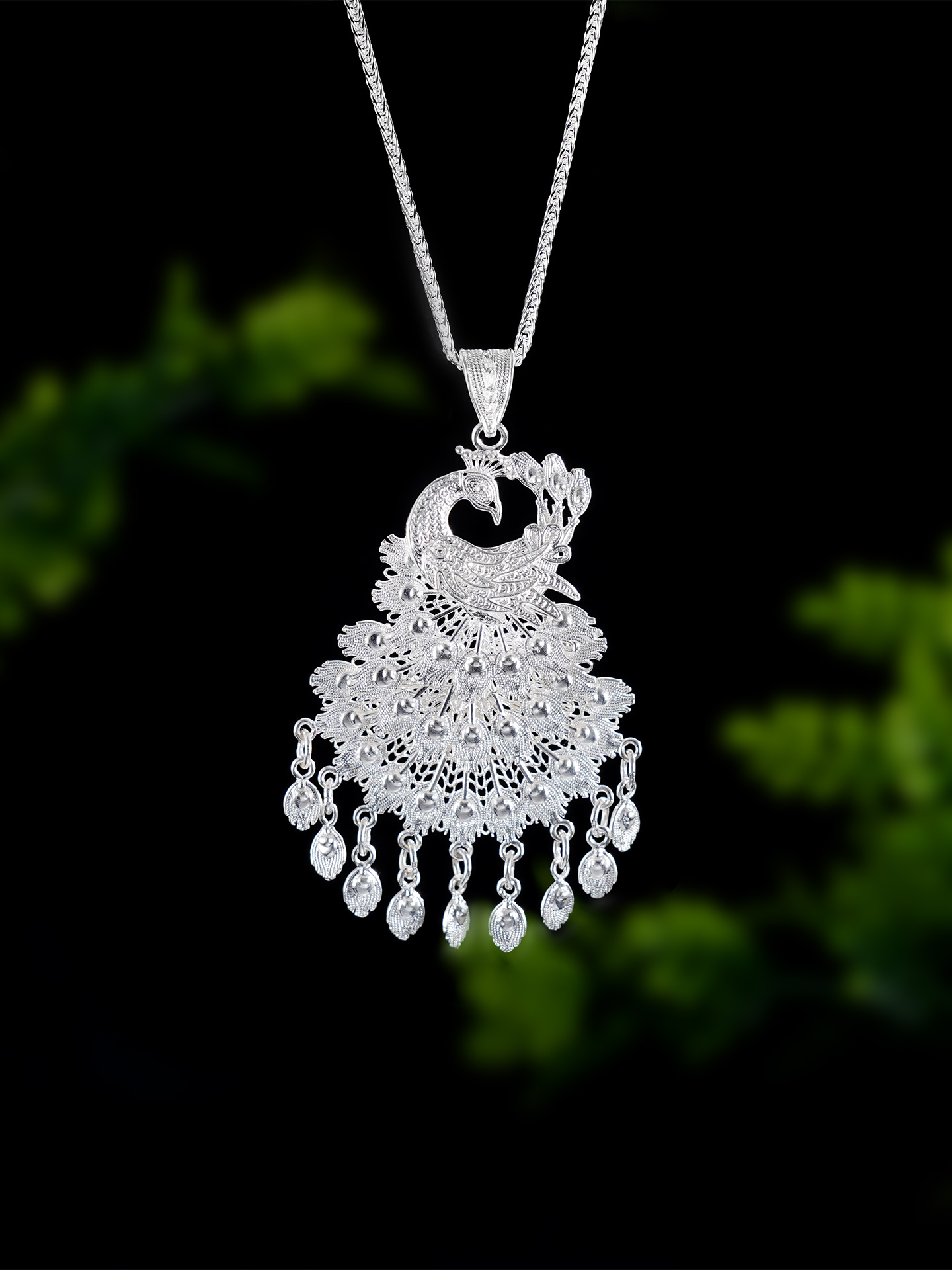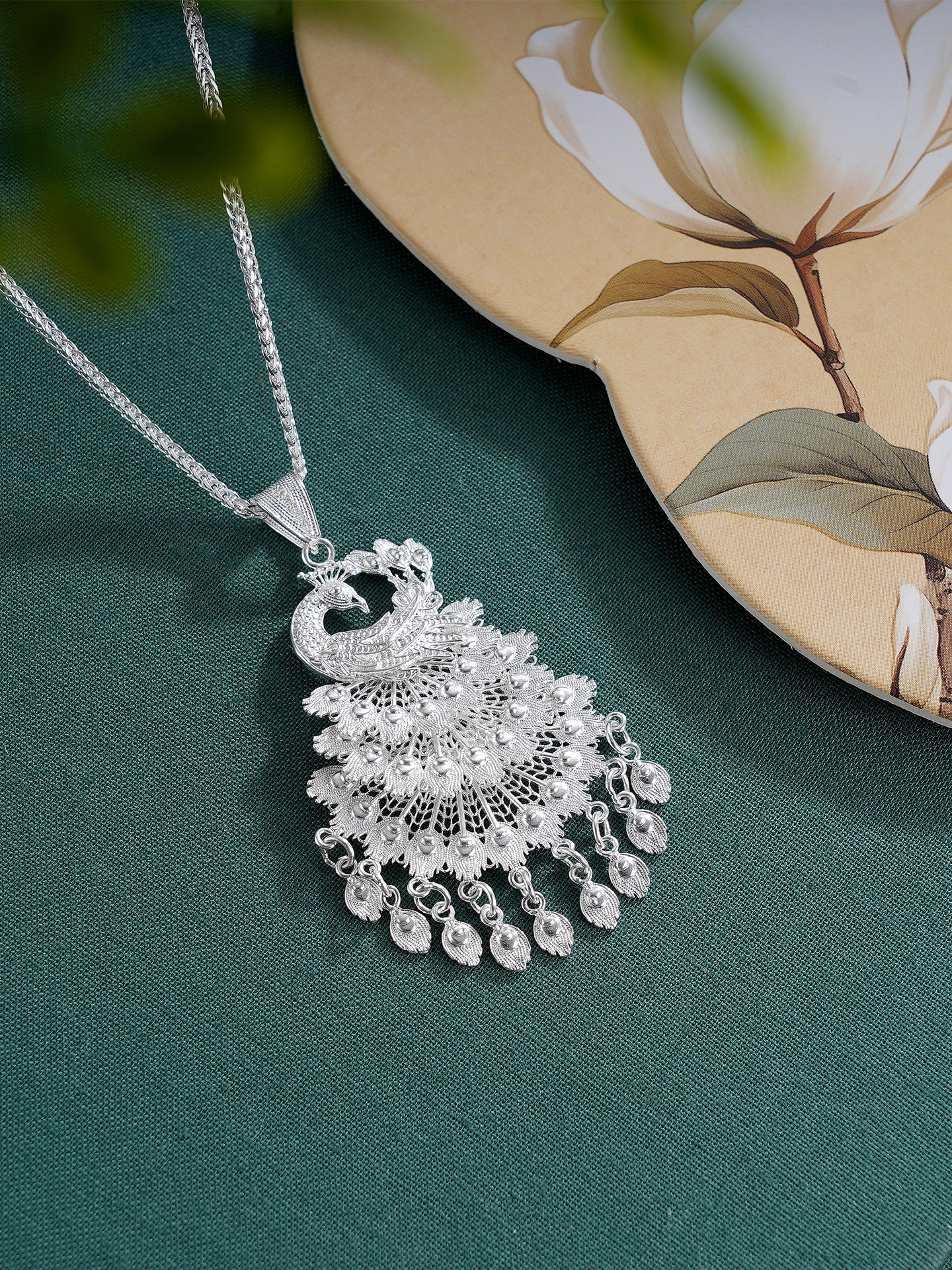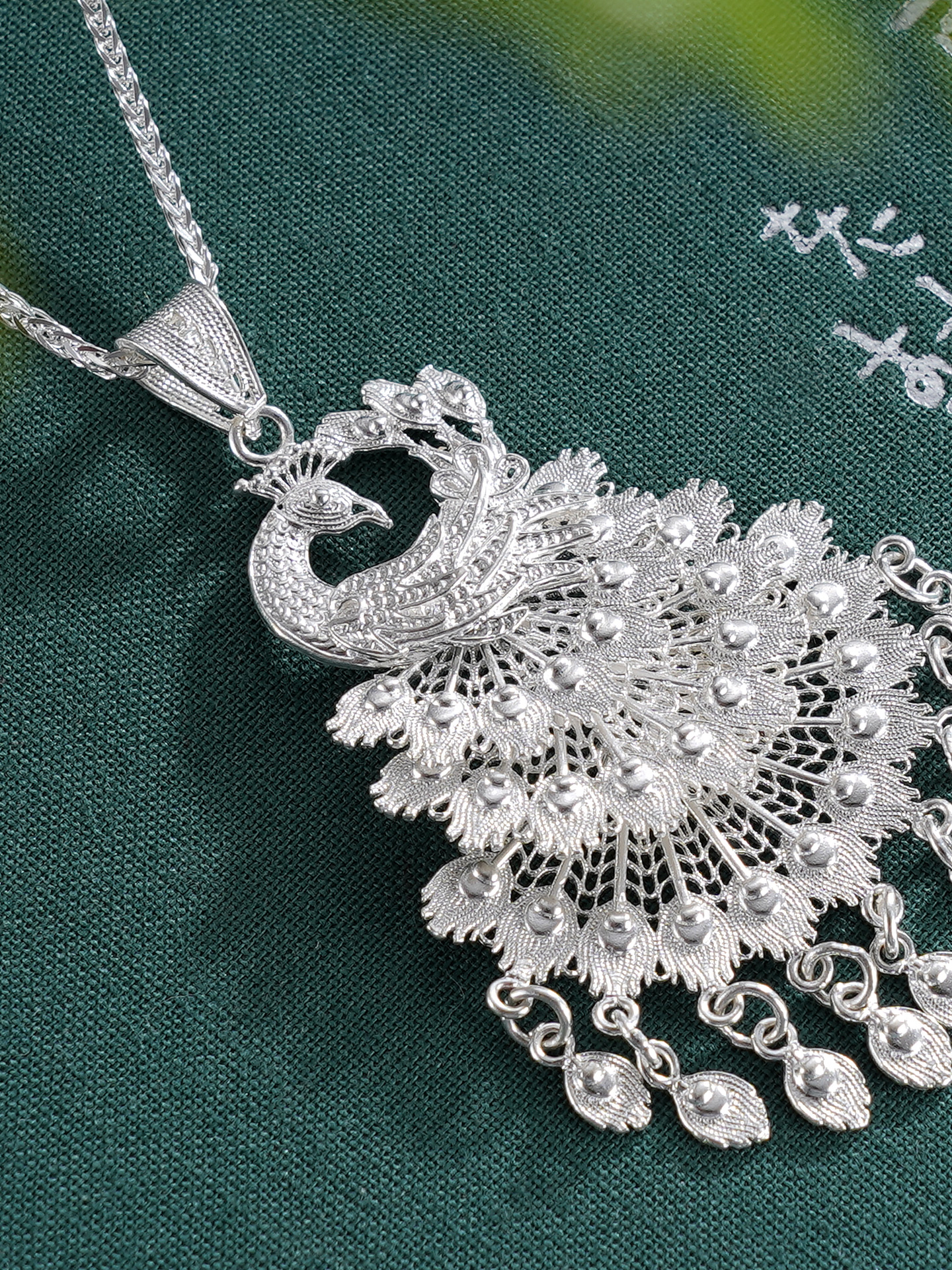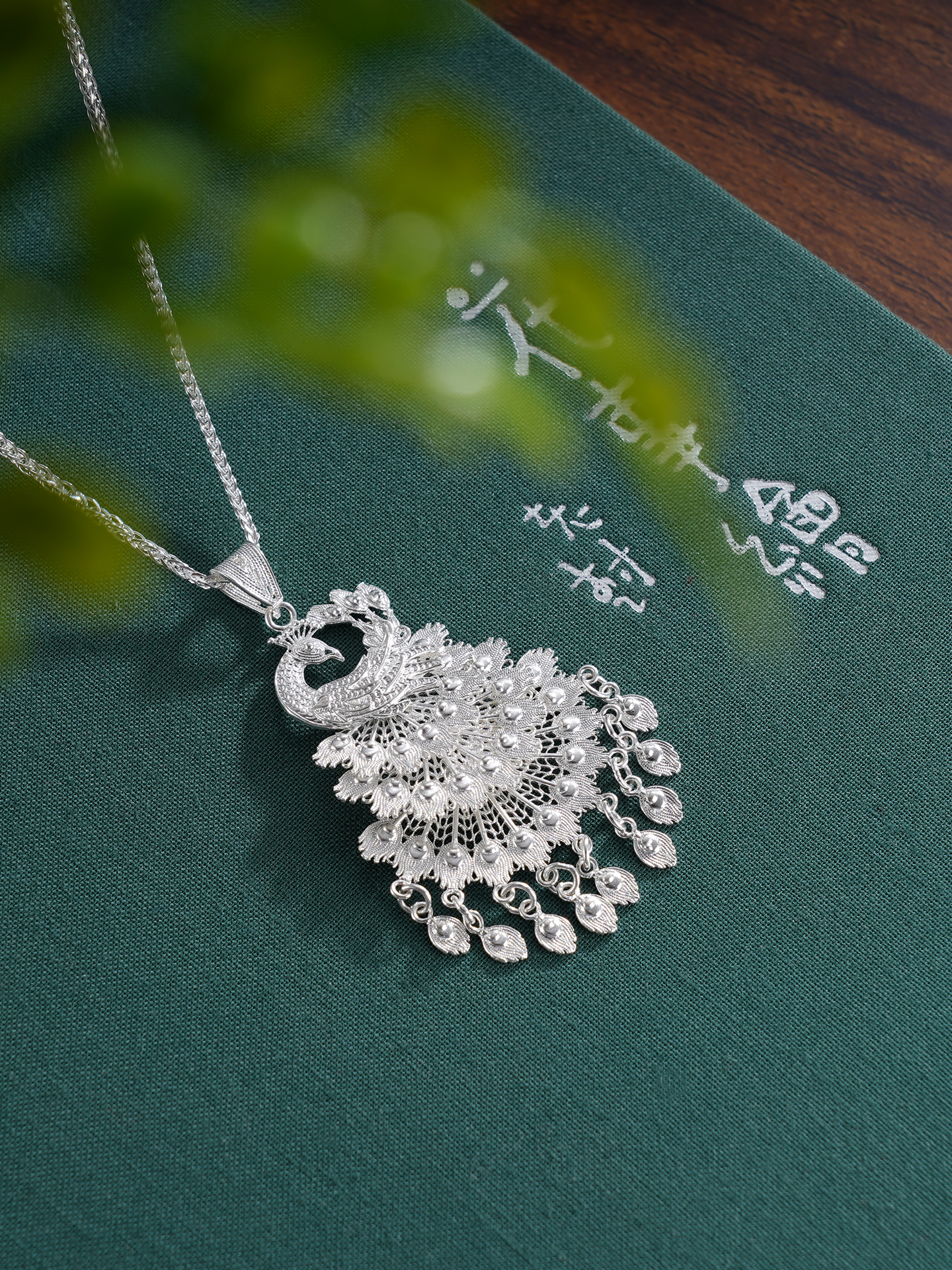 【寓意】:孔雀开屏寓意白头偕老、幸福美满羽毛由银丝勾勒组成片片绽开,灵美动人以花丝为骨,再以镶嵌作饰花丝与镶嵌相得益彰,精妙绝伦。