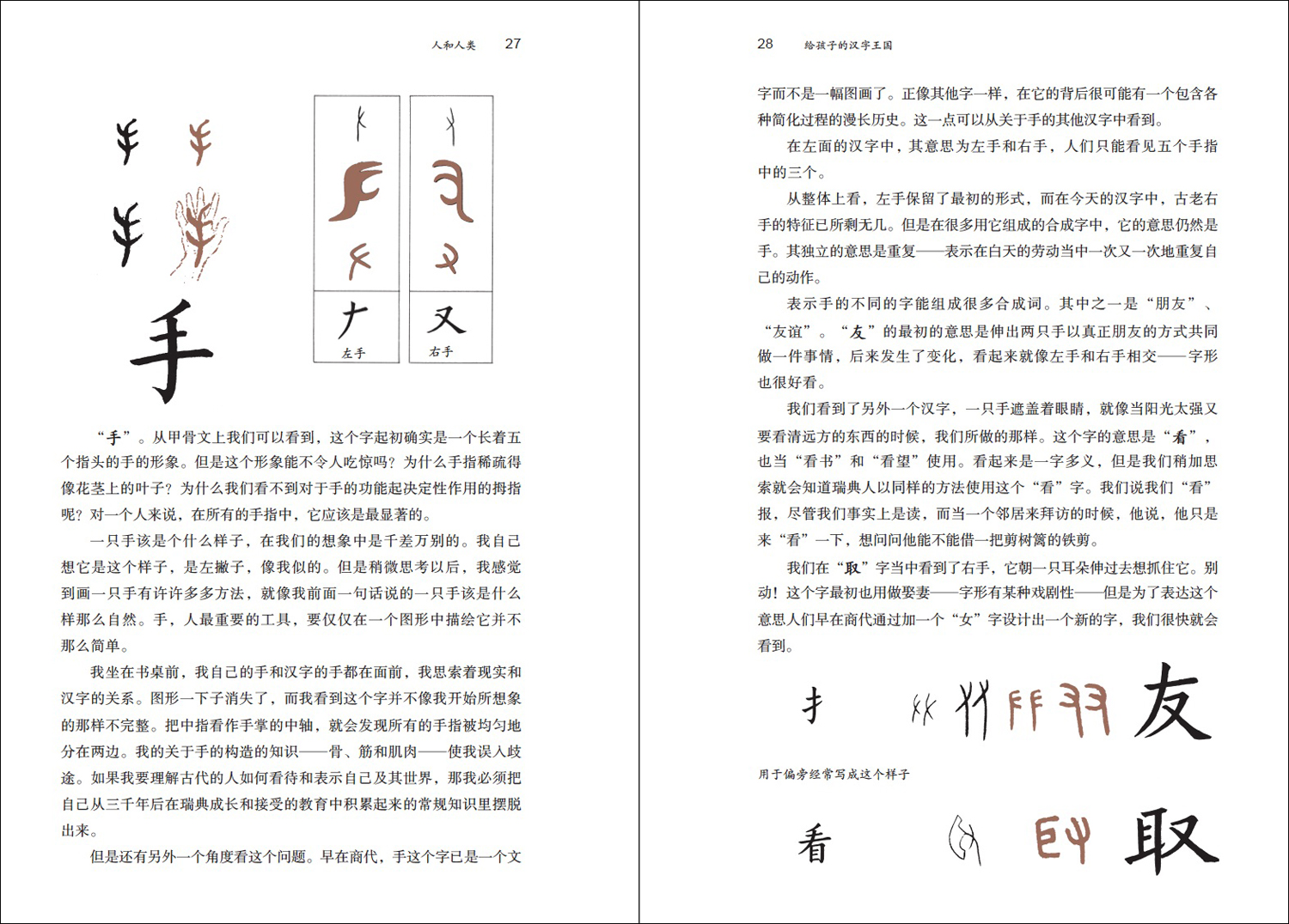 汉字为什么是这个样子?从我20世纪50年代末跟高本汉(Bernhard Karlgren)开始学习汉语起,这个问题一直吸引着我。高本汉每教一个字都要解释它的结构以及人们所知道的它的最初形式。他讲汉字的来龙去脉,使它们变得活生生的,很容易理解。当时他本人作为世界最知名的汉语语言学家之一已有几十年,但是他对汉字的热爱仍然充满青春的活力,他以似乎永不枯竭的激情在黑板上、粉尘中进行着汉字分析。