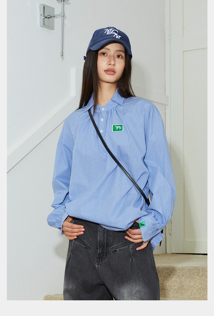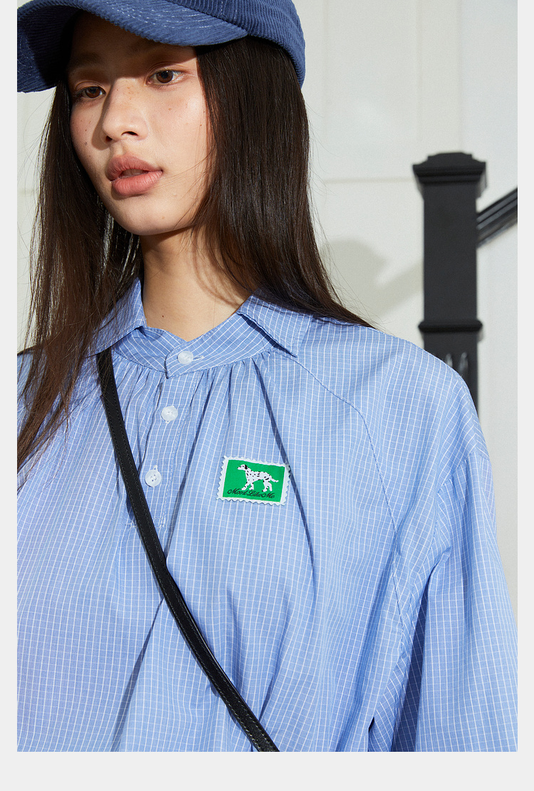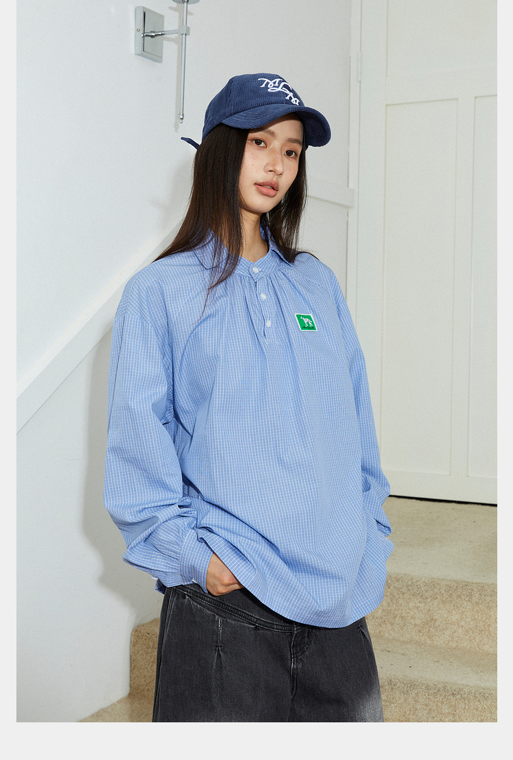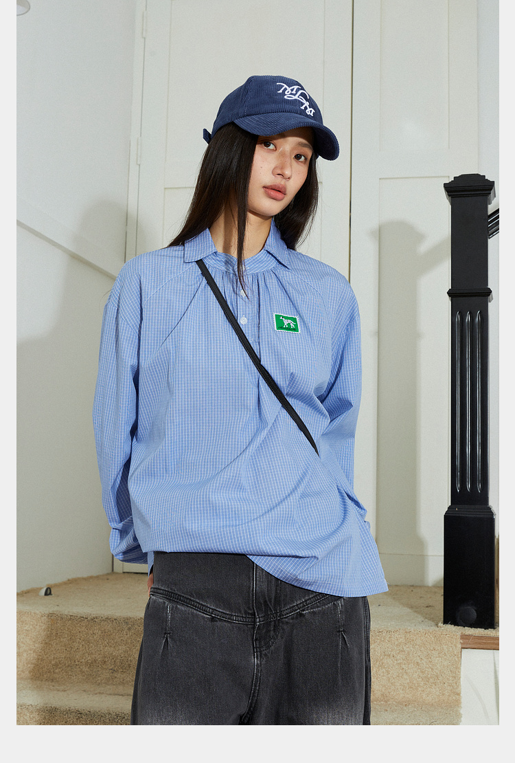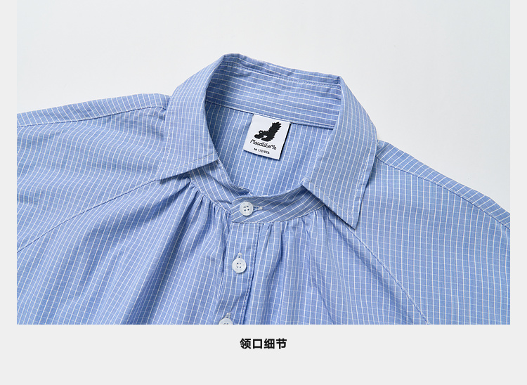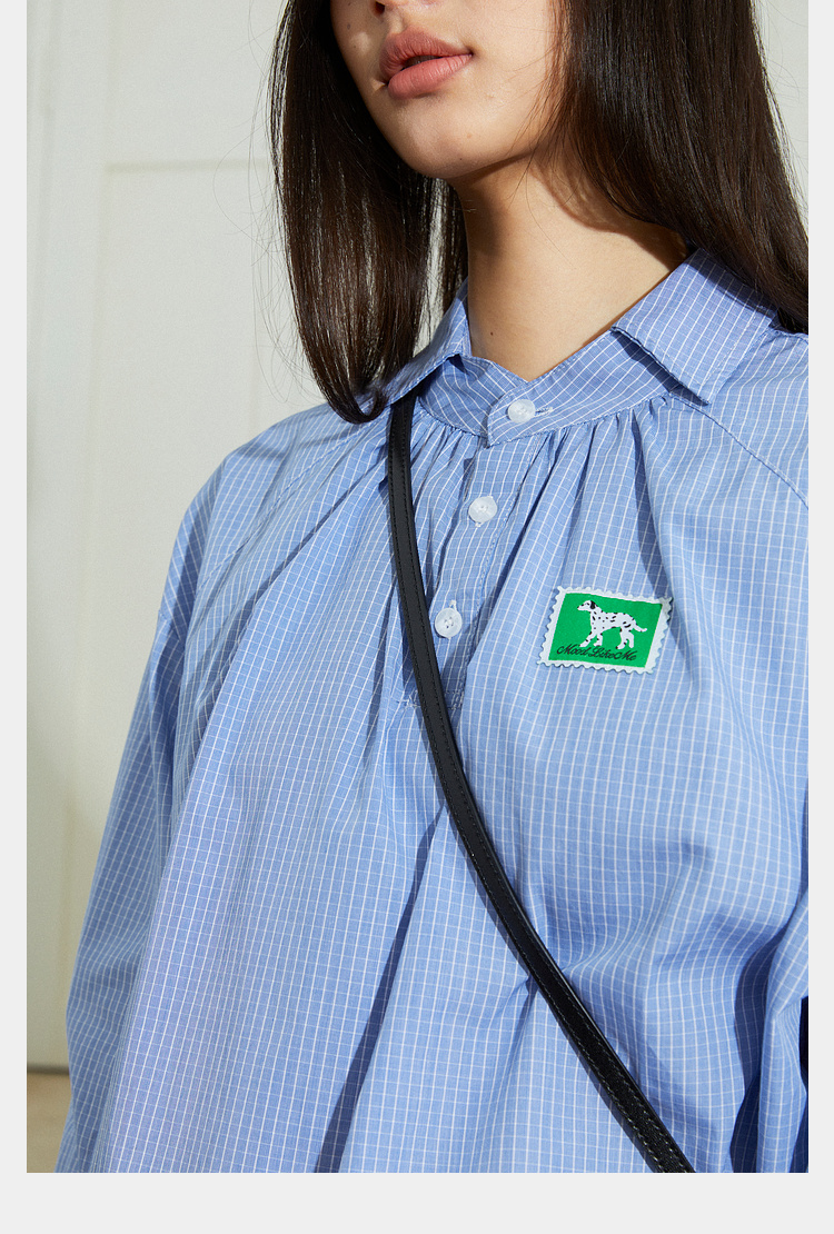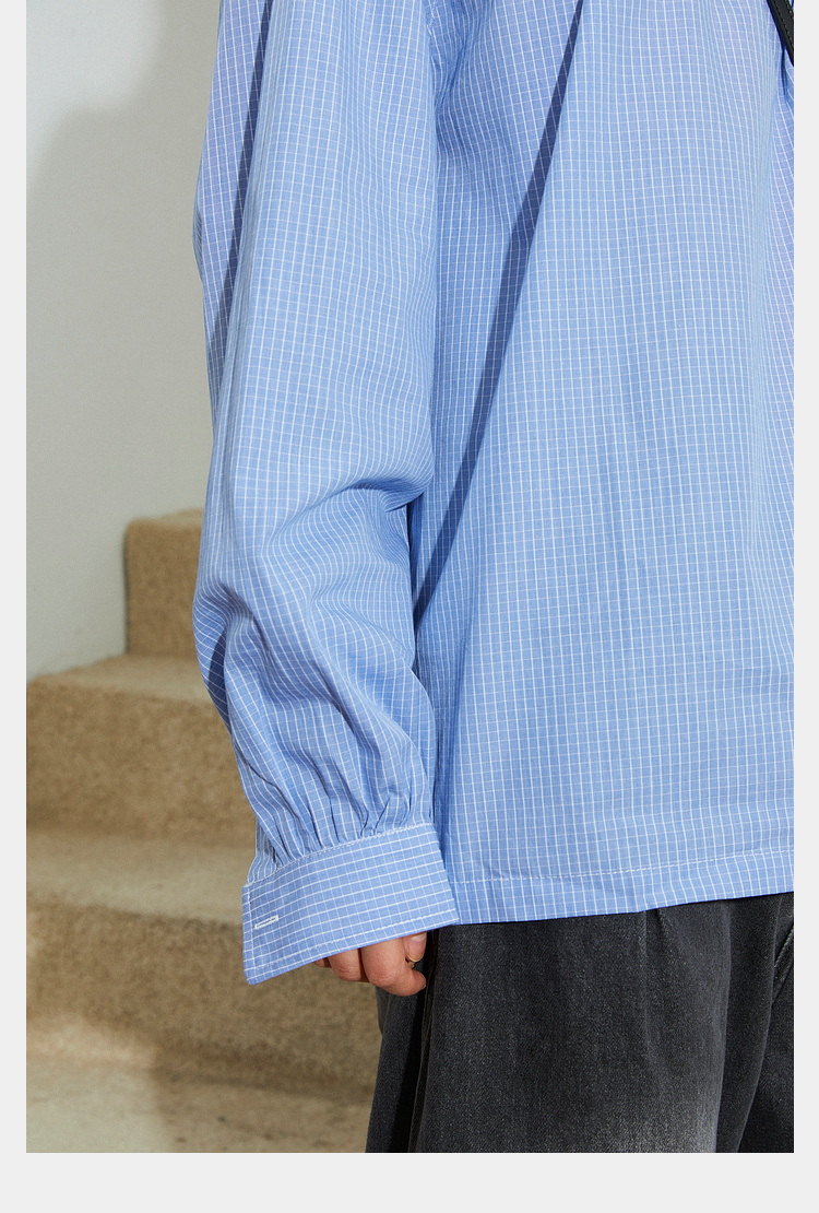 Mood Like Me/MCS2409/蓝色细格纹半开领抽褶衬衫