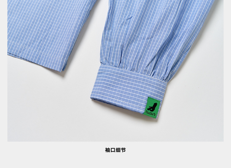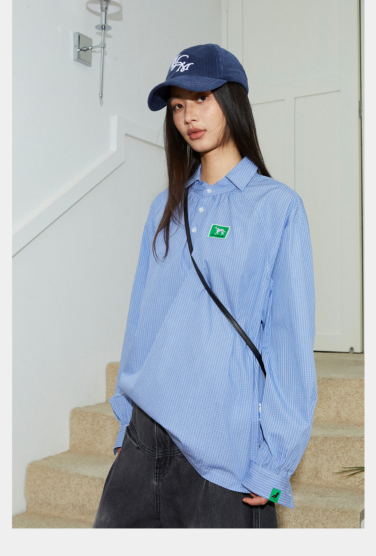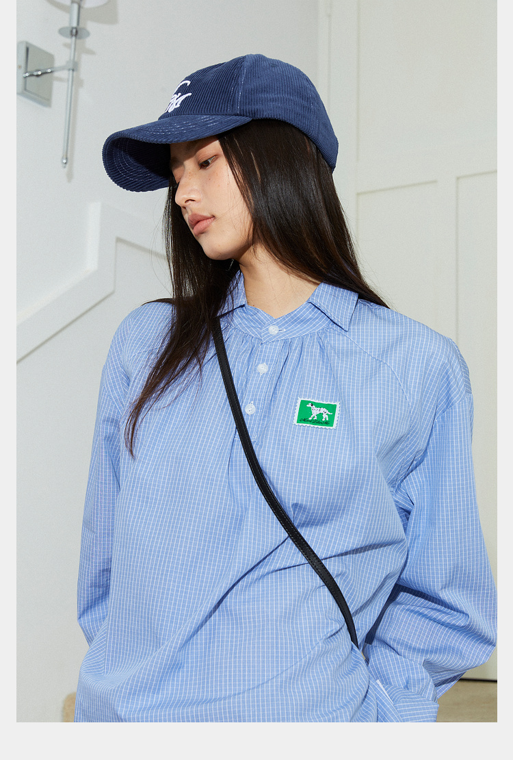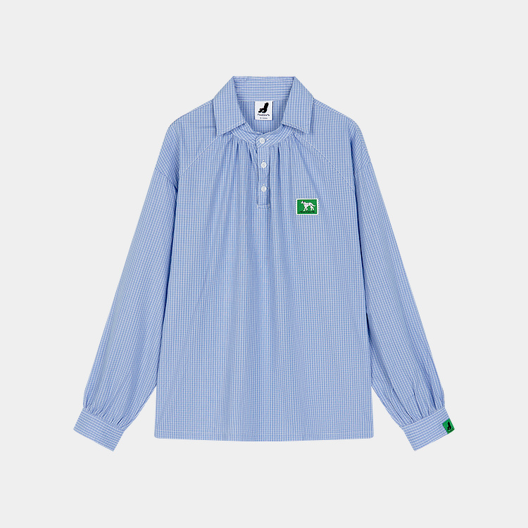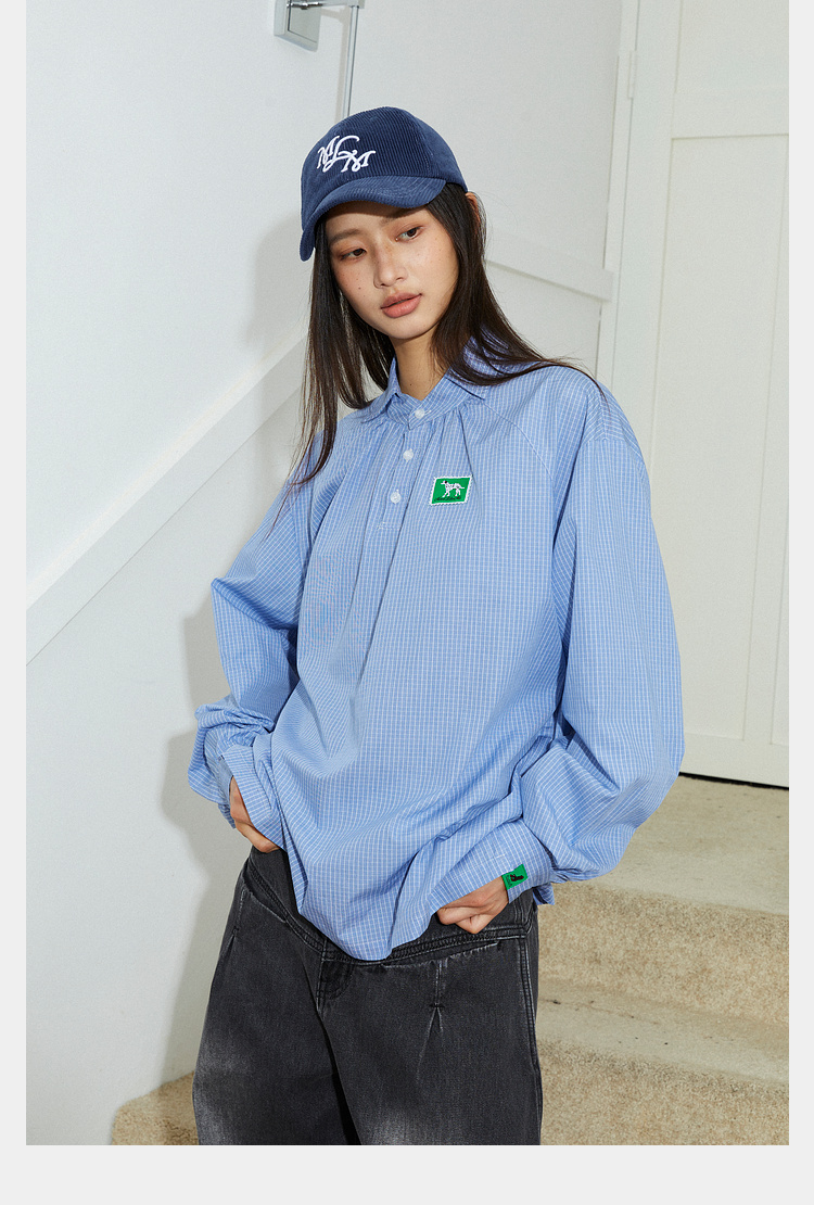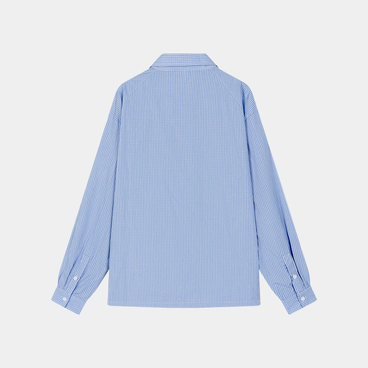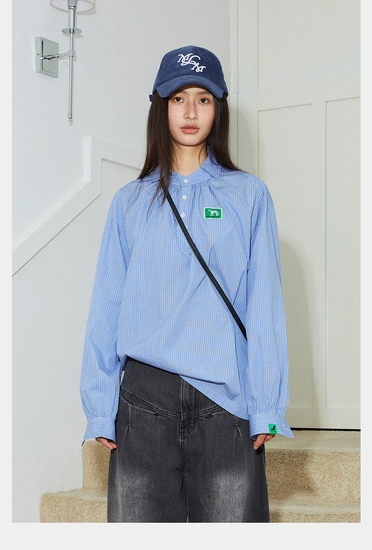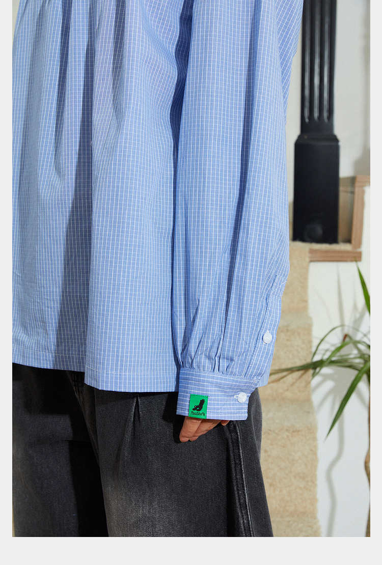 Mood Like Me/MCS2409/蓝色细格纹半开领抽褶衬衫