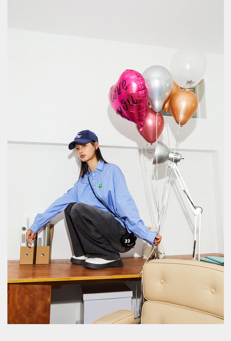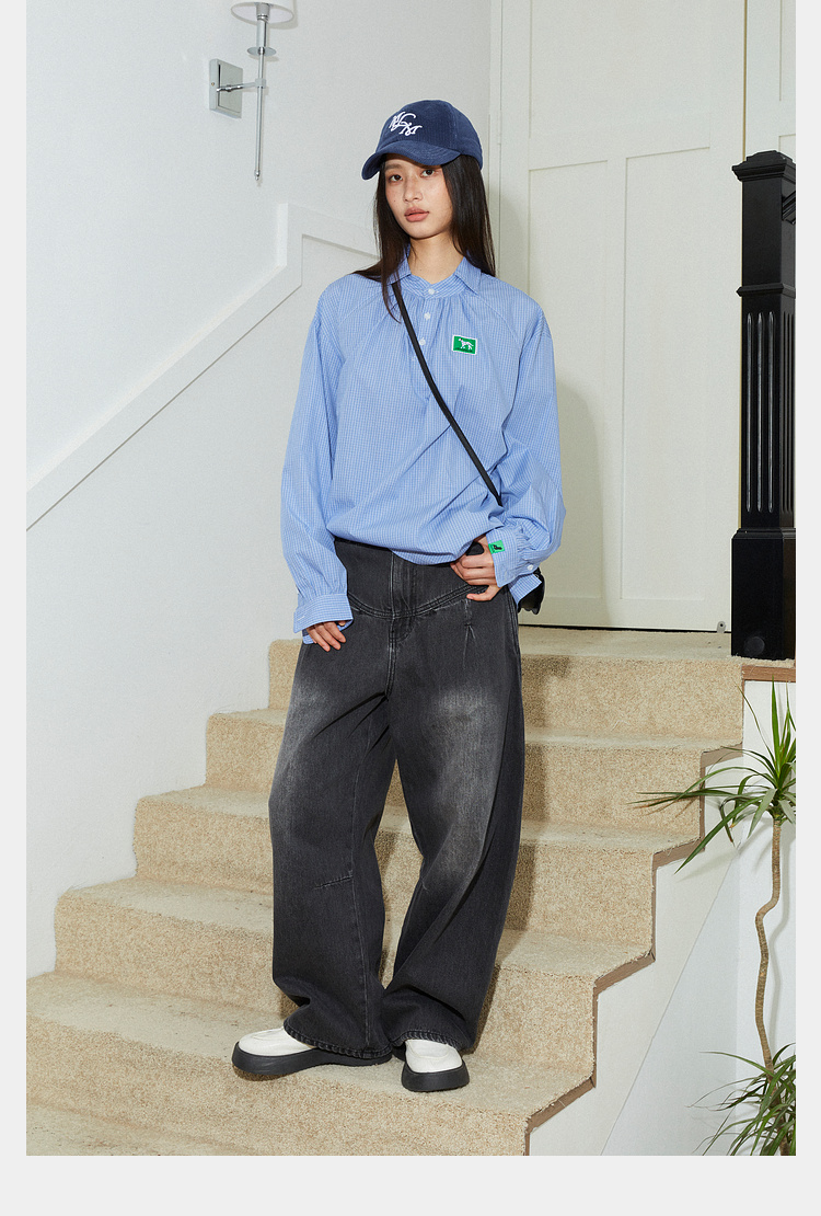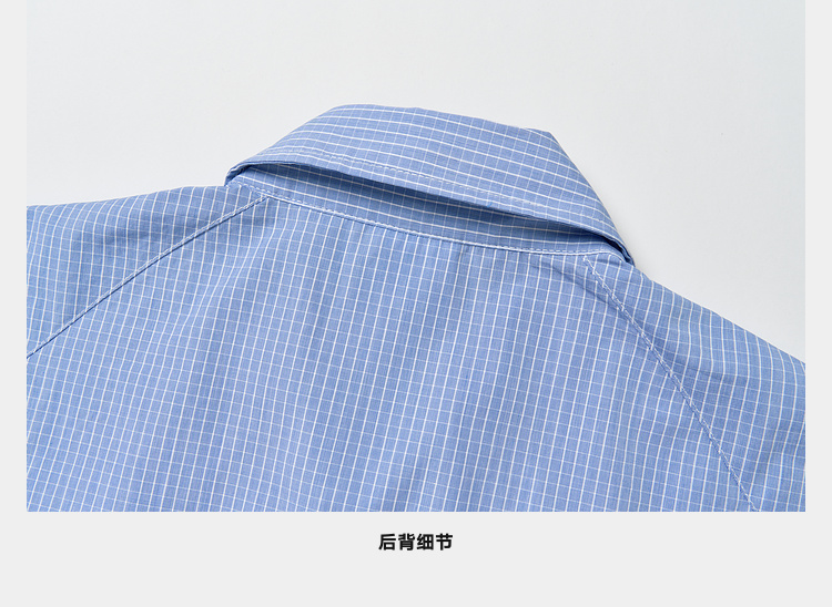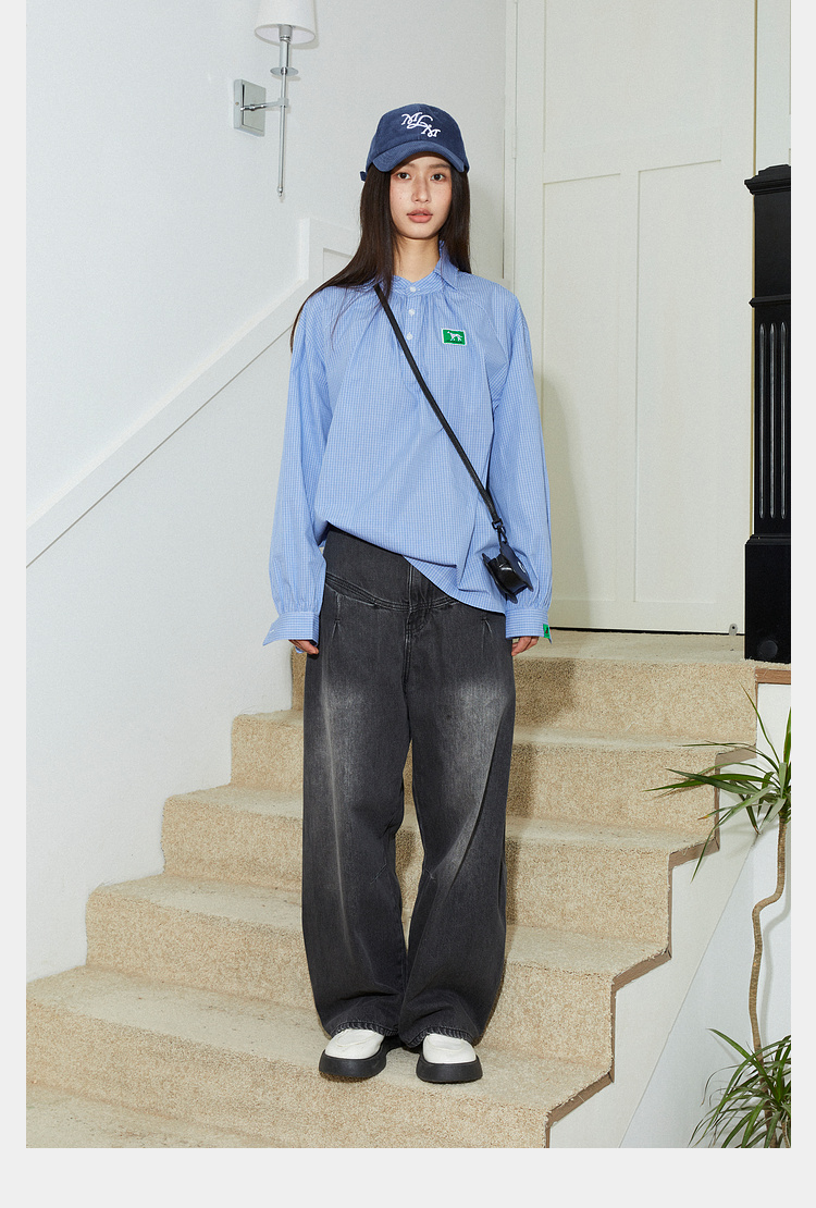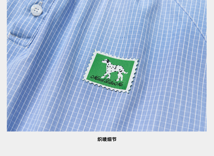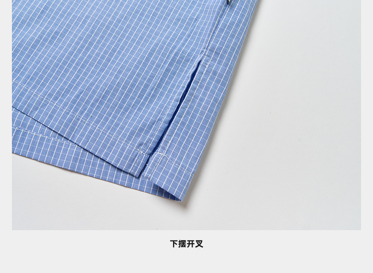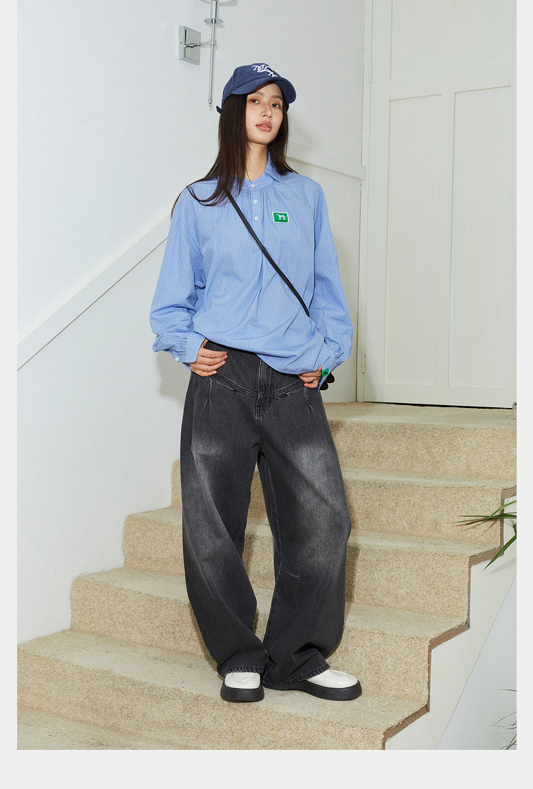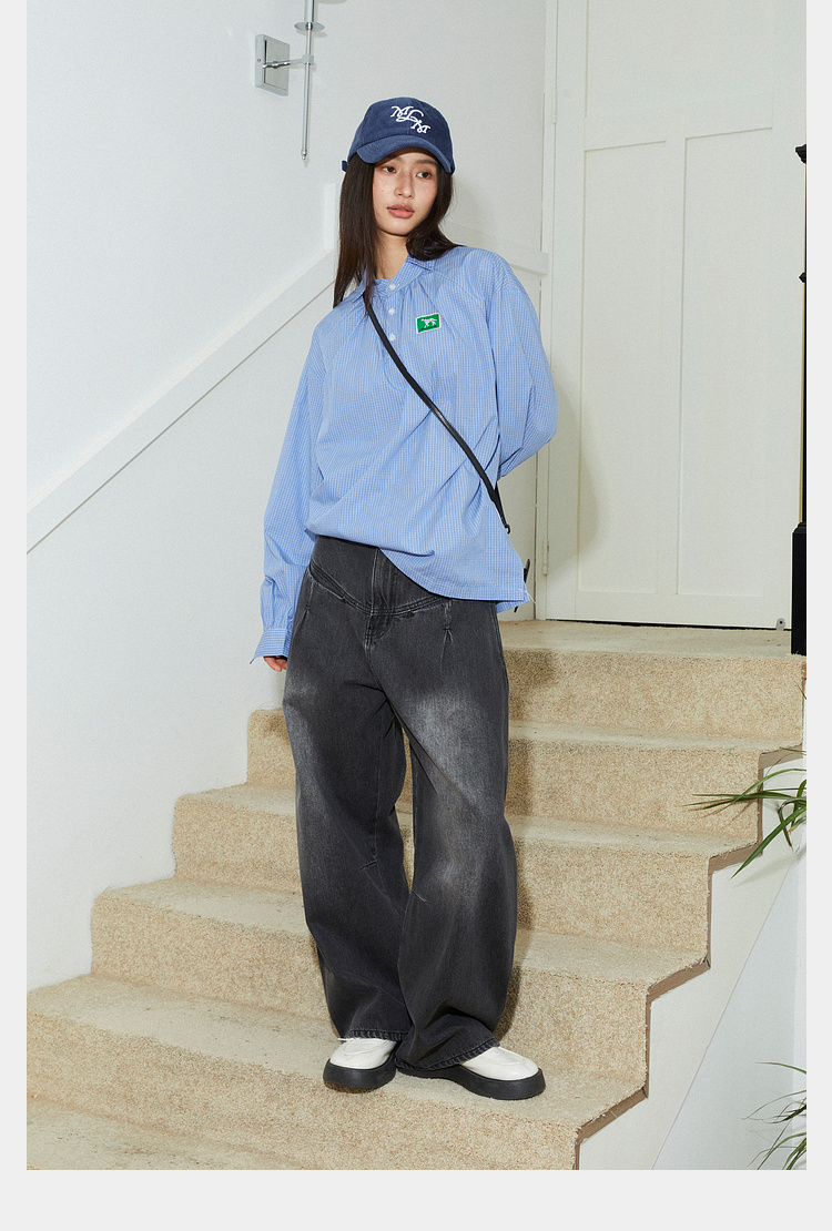 Mood Like Me/MCS2409/蓝色细格纹半开领抽褶衬衫