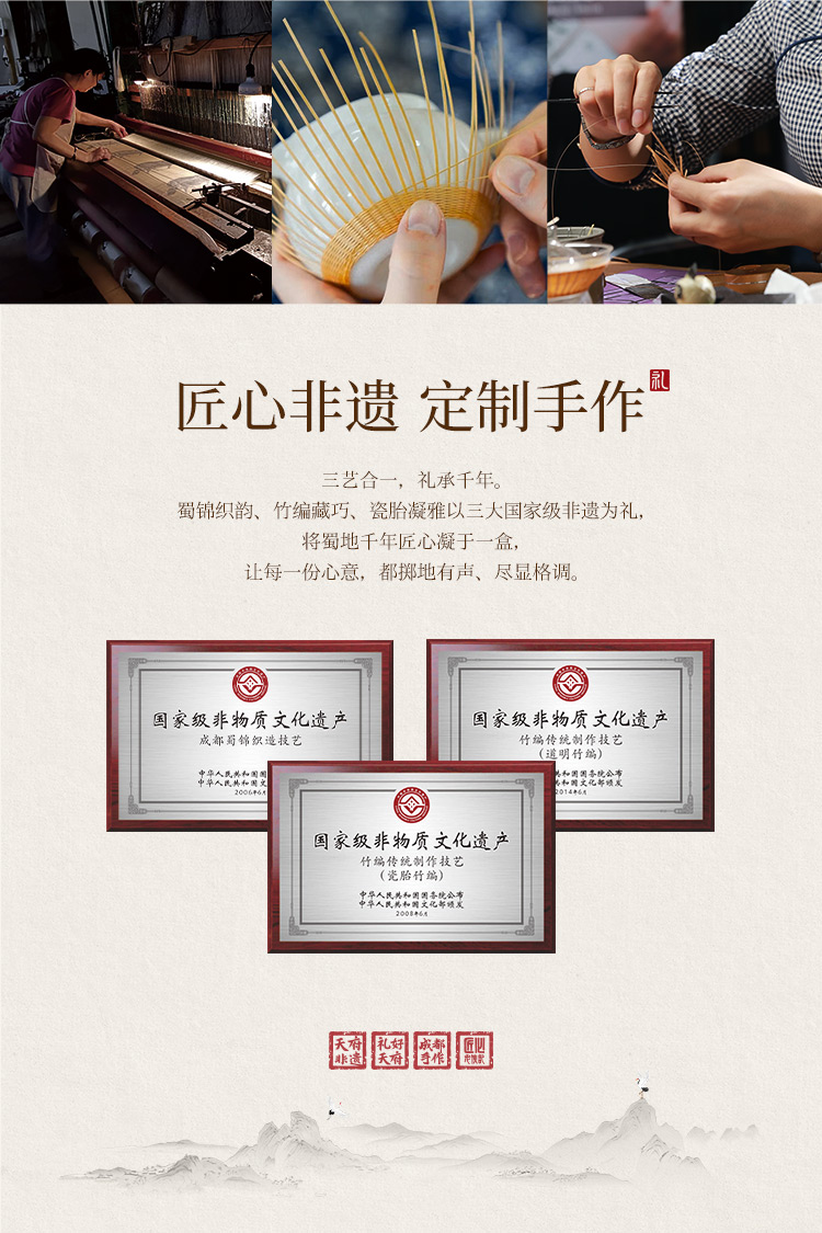 【产品工艺】国家级非遗非遗代表性项目:蜀锦织造技艺/瓷套竹编制作技艺/道明竹编制作技艺;