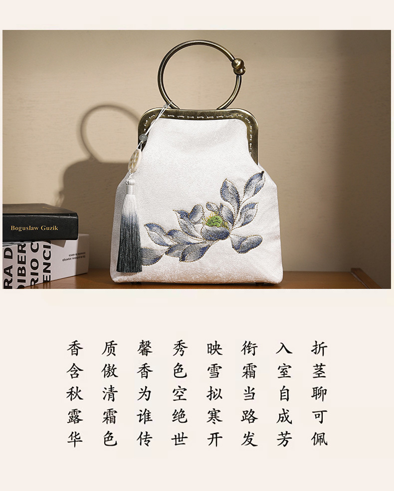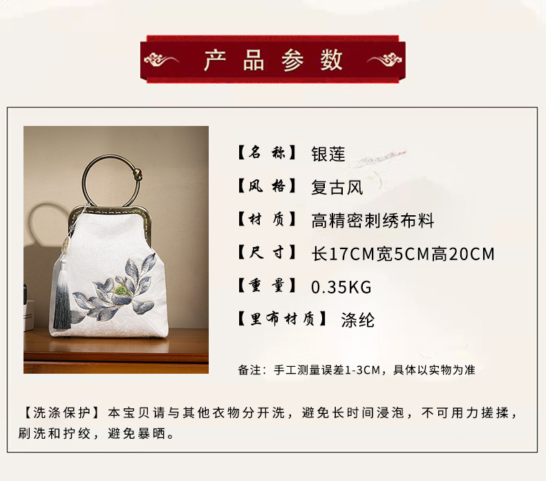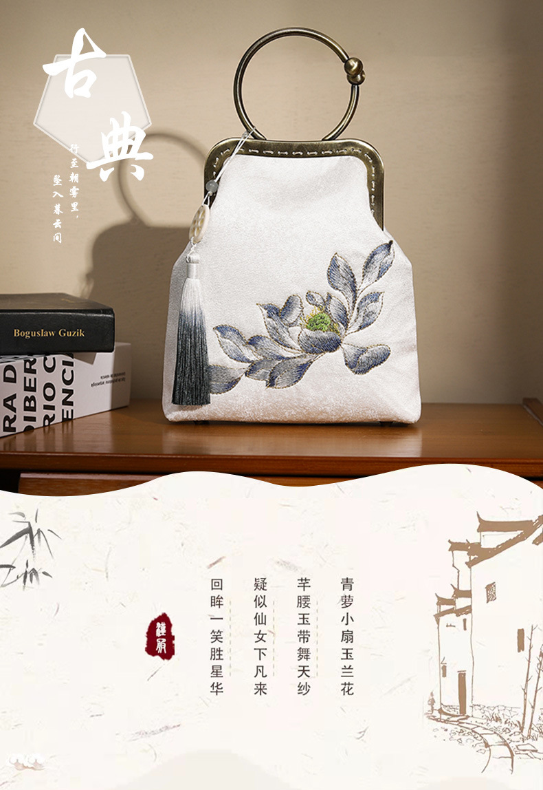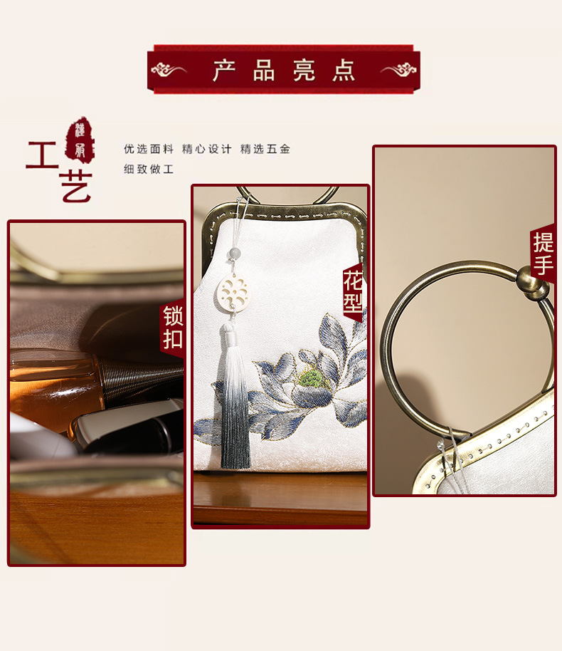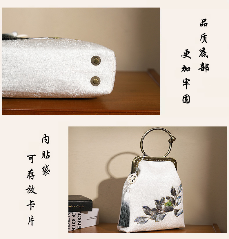古风包旗袍绣花金口手拎包,复古民刺绣手提包JX-银莲