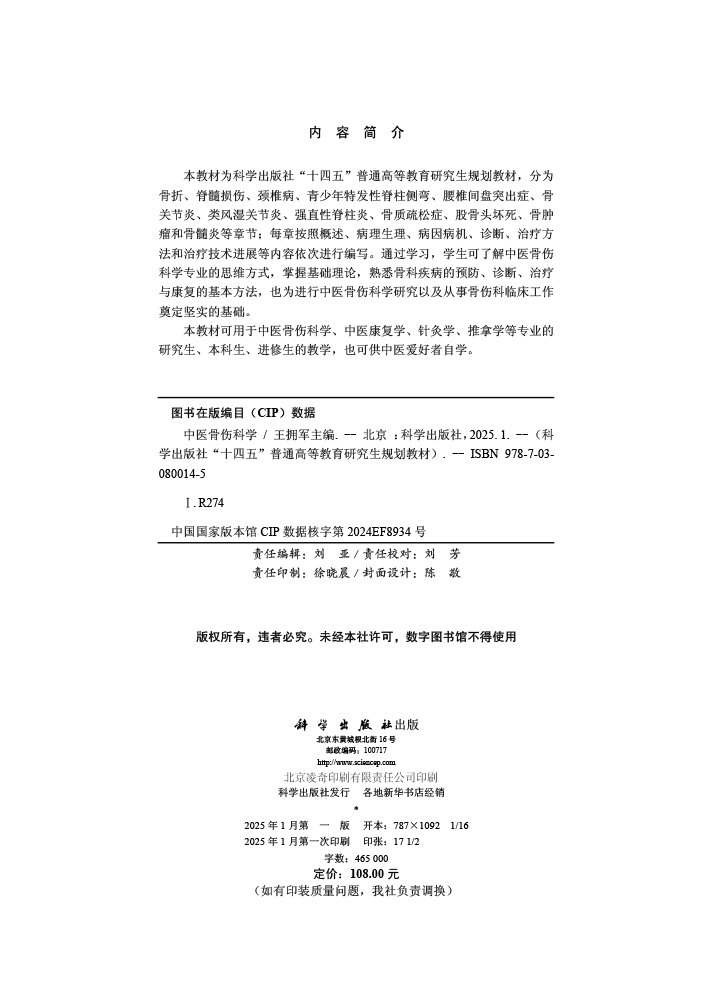 中医骨伤科学十四五普通高等教育研究生规划教材 王拥军 供中医骨伤科学中医康复学针灸学推拿学等专业的研究生本科生进修生的教学