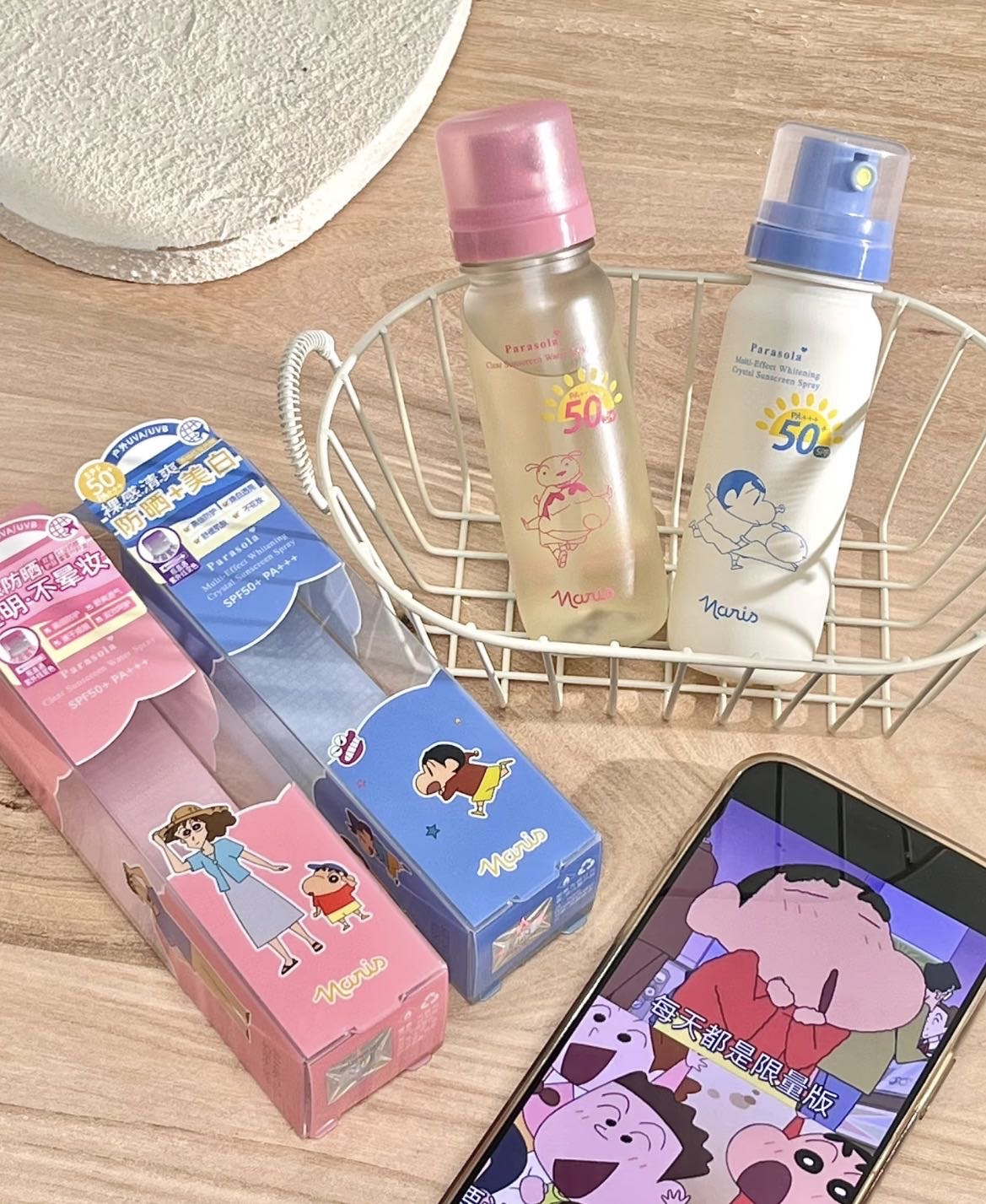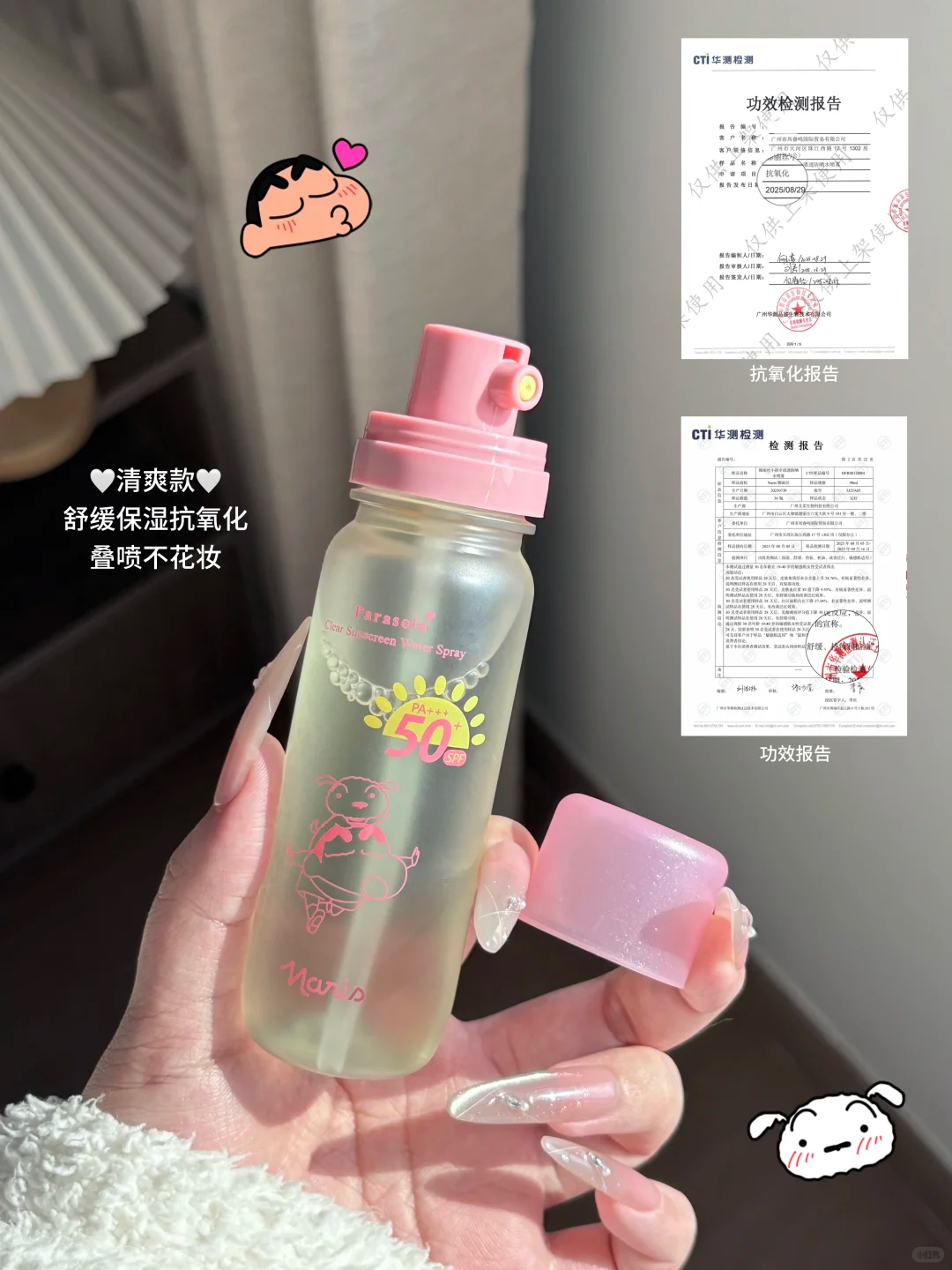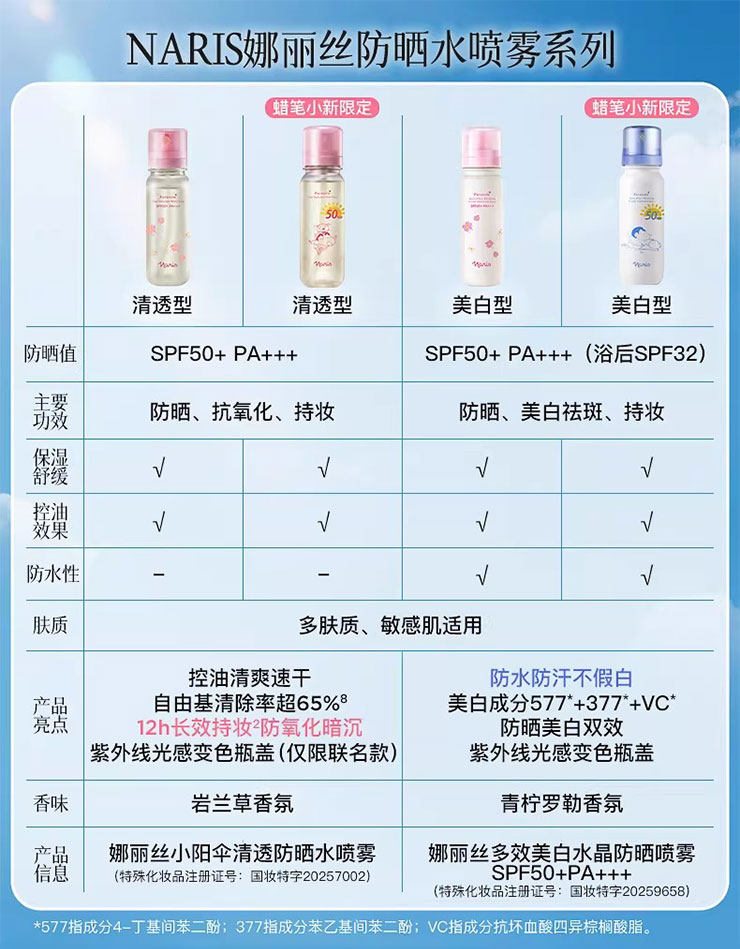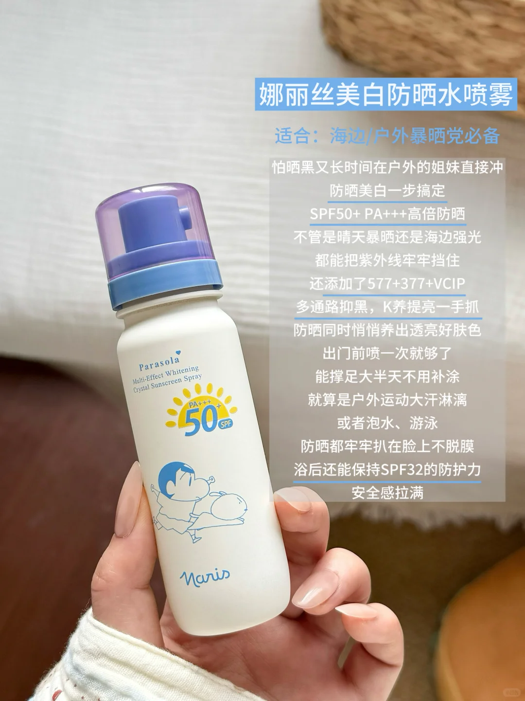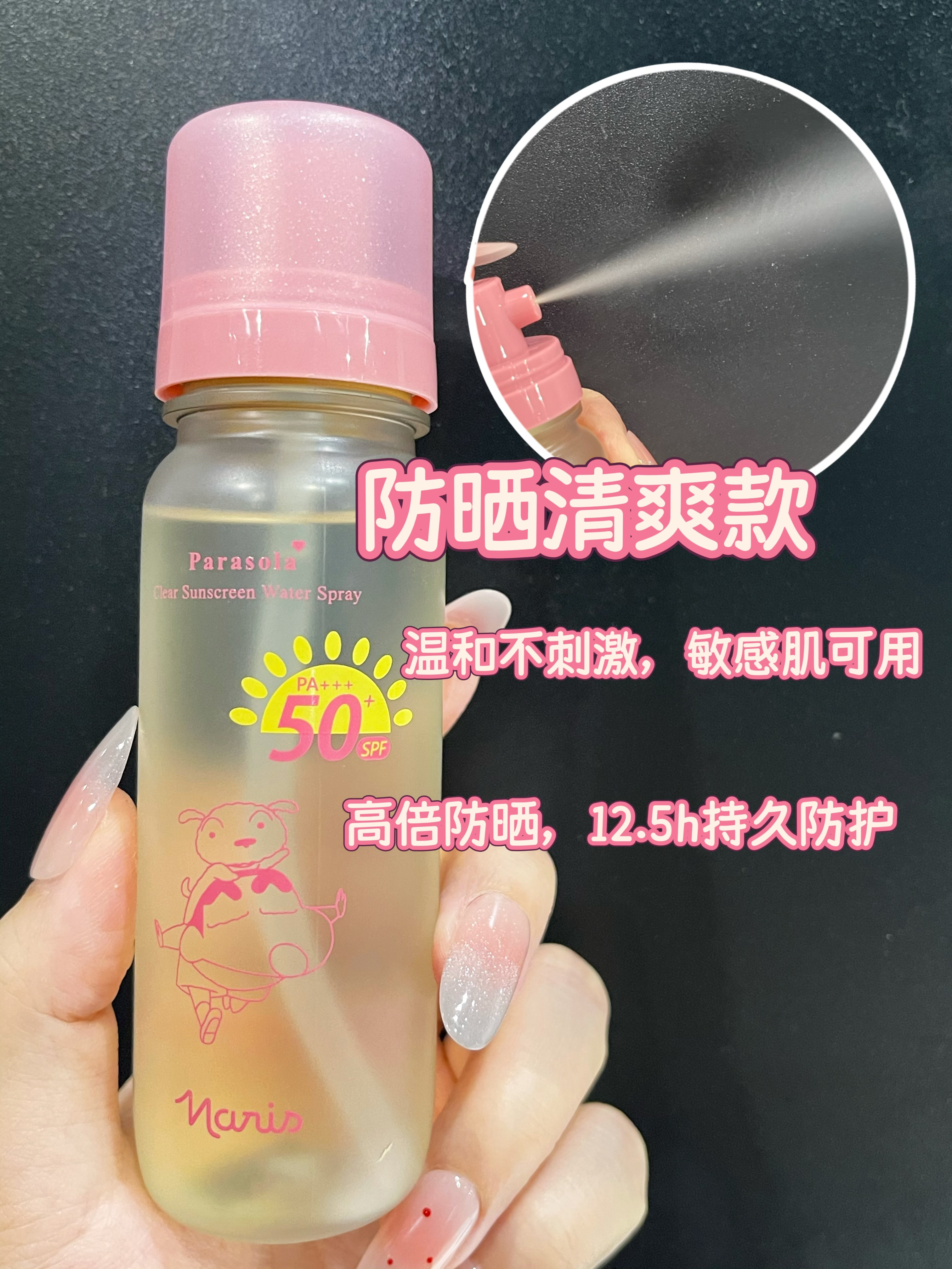 想要实用又携带方便的防晒,推荐大家入手这个萌趣可爱又好用的——Naris娜丽丝 x 蜡笔小新联名款防晒水喷雾。
