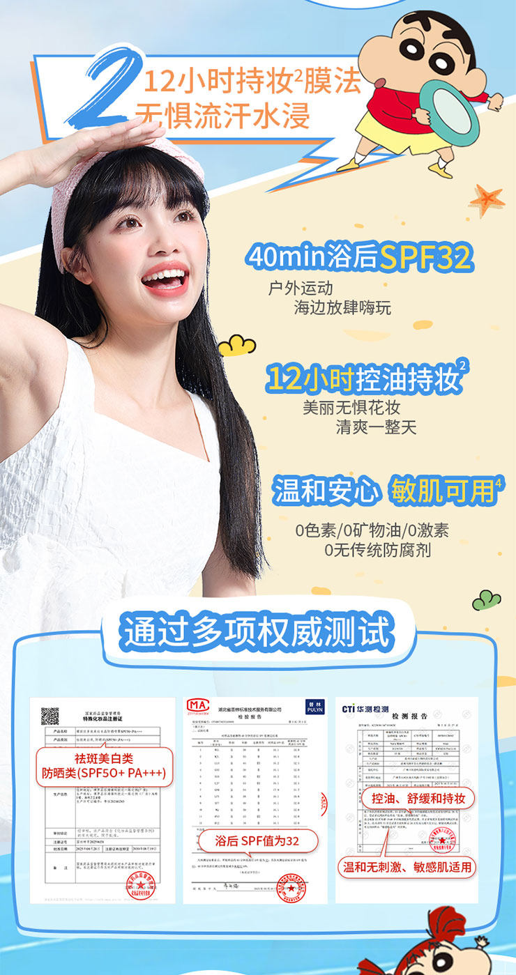 SPF50+PA+++,全波段高倍防晒系数,12.5小时持久防护。浴后防晒值SPF32,抗水耐汗烈日无惧脱膜。