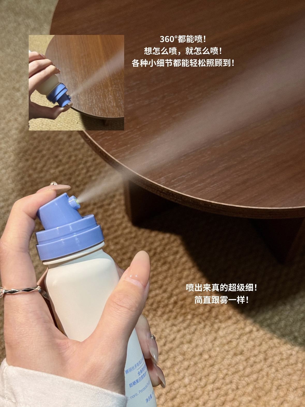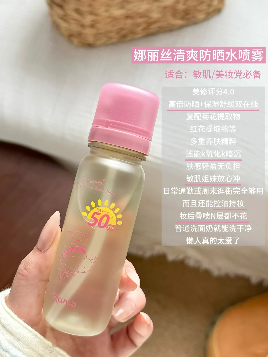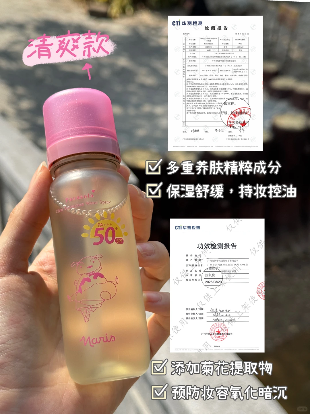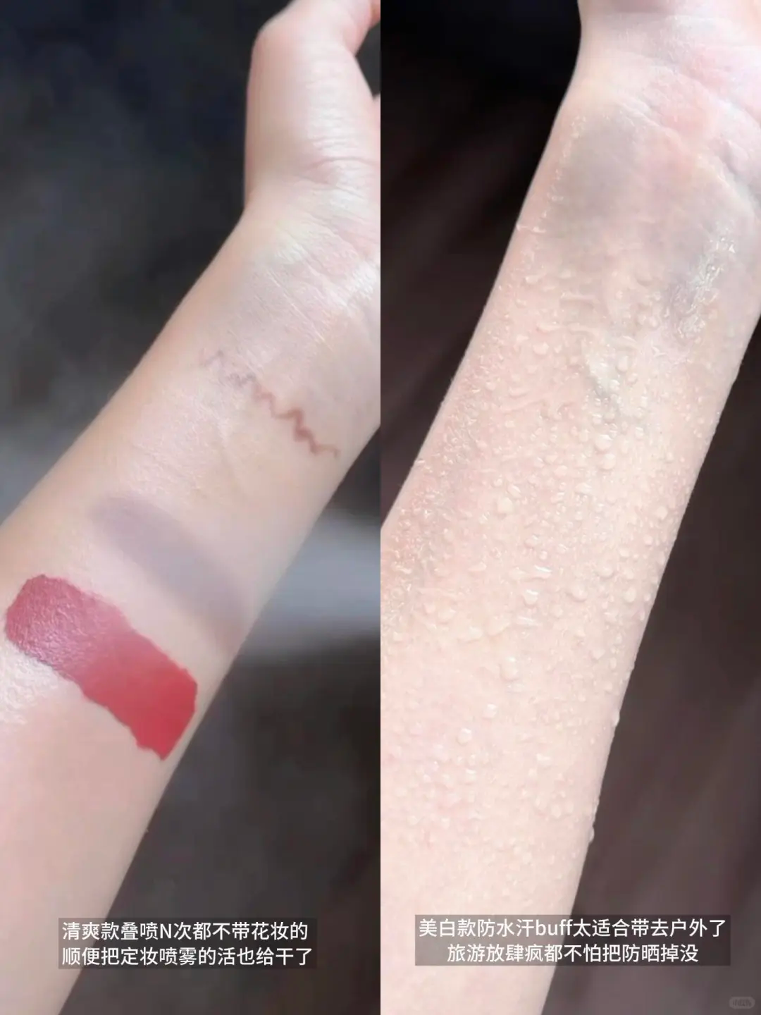 喷出来是清爽的凉感,肤感非常nice,而且像有时候化完妆想补喷防晒,用它就很合适!