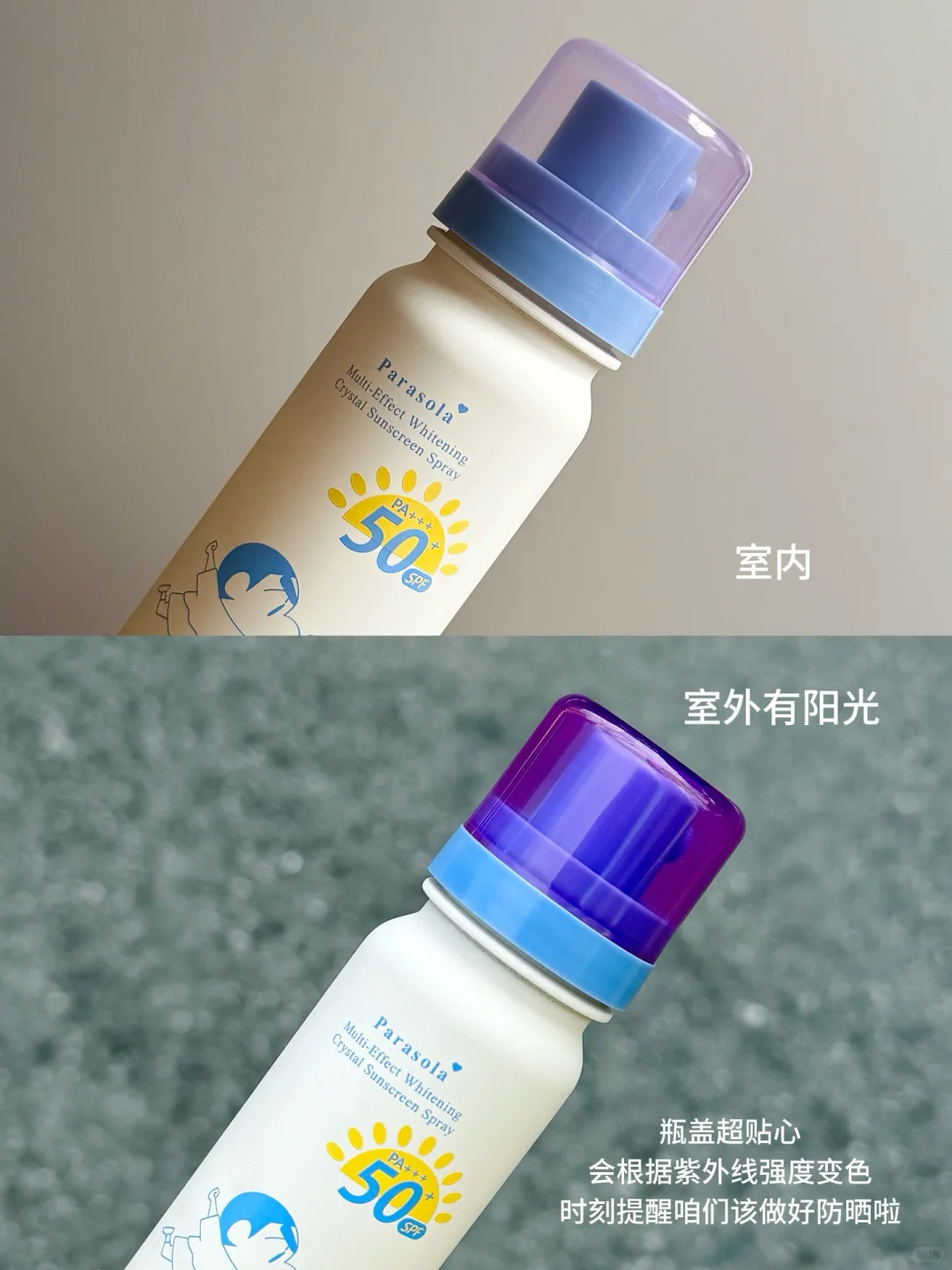 盖子颜色越深,紫外线越强,户外补喷不用猜,看瓶盖即刻行动。
