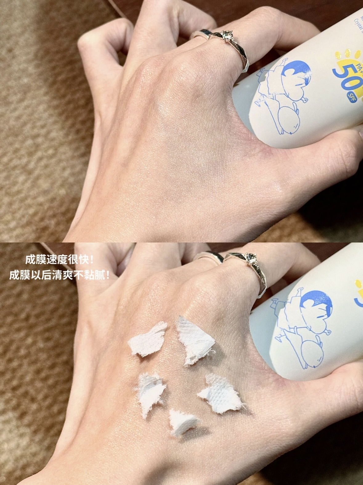 接触皮肤后很快成膜,不闷、不油、不黏,一点负担感都没有。