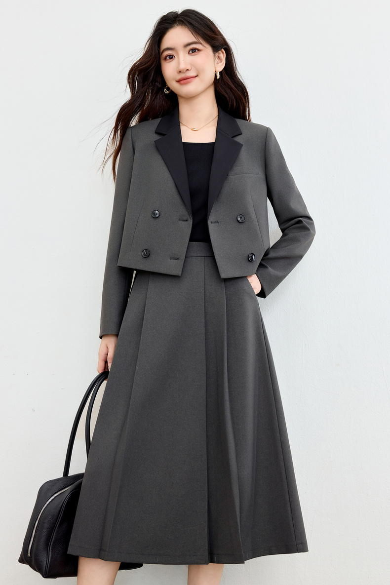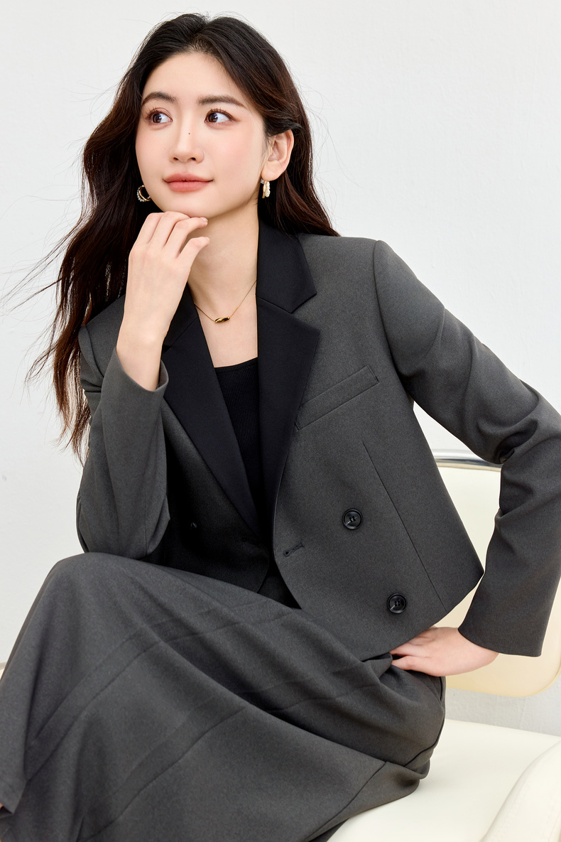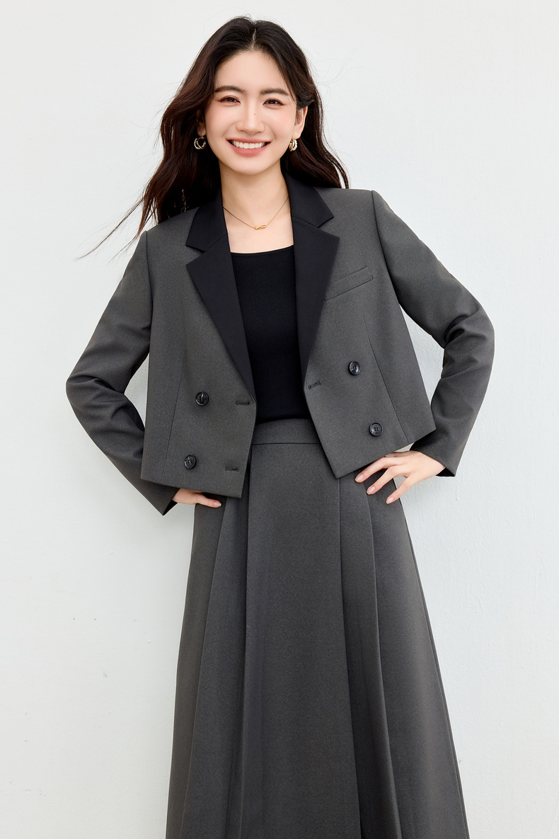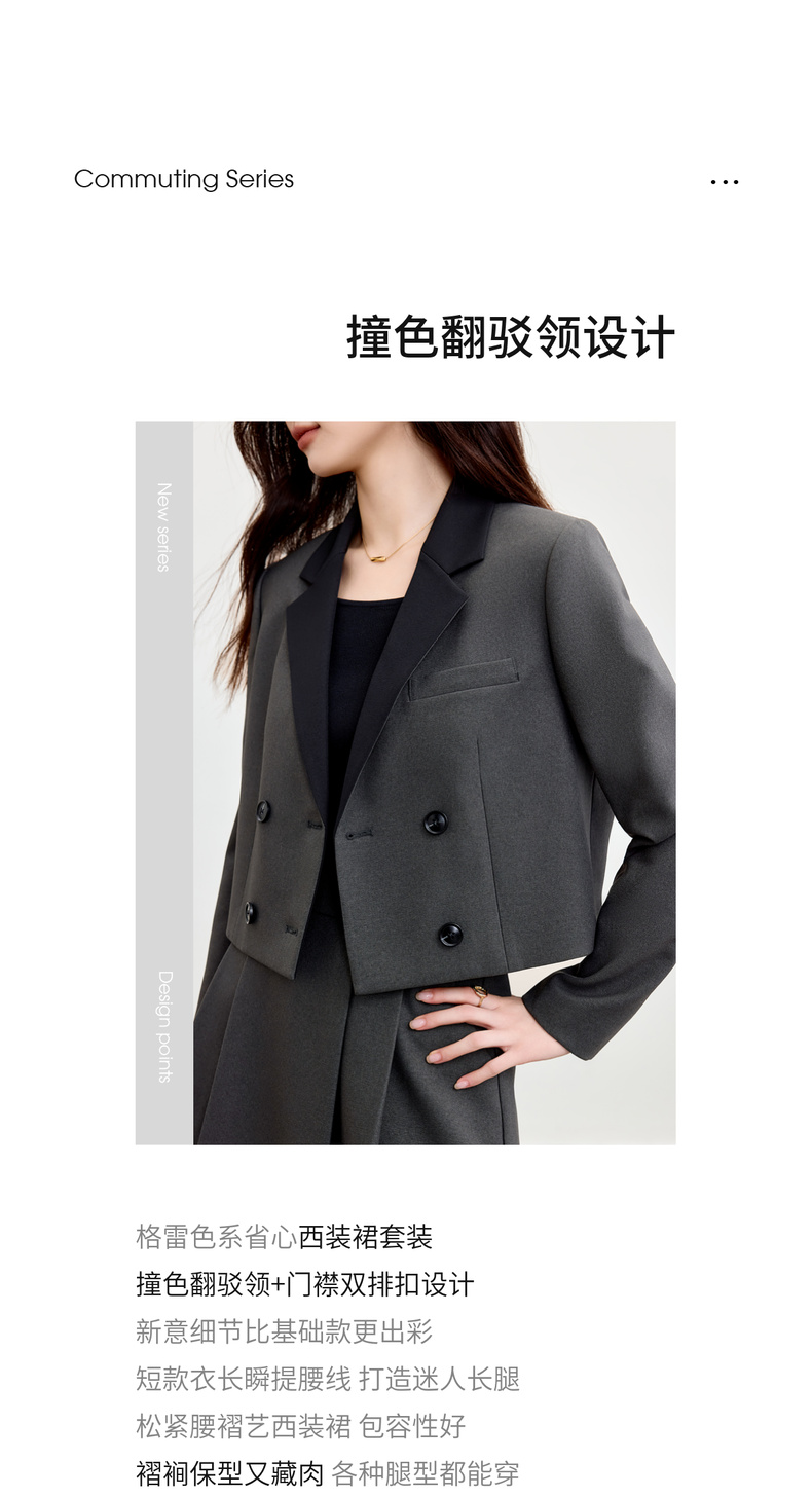 【内购】【免搭配套装】智性撞色翻驳领双排扣垫肩短西服&松紧腰西装半裙-153ZA2515