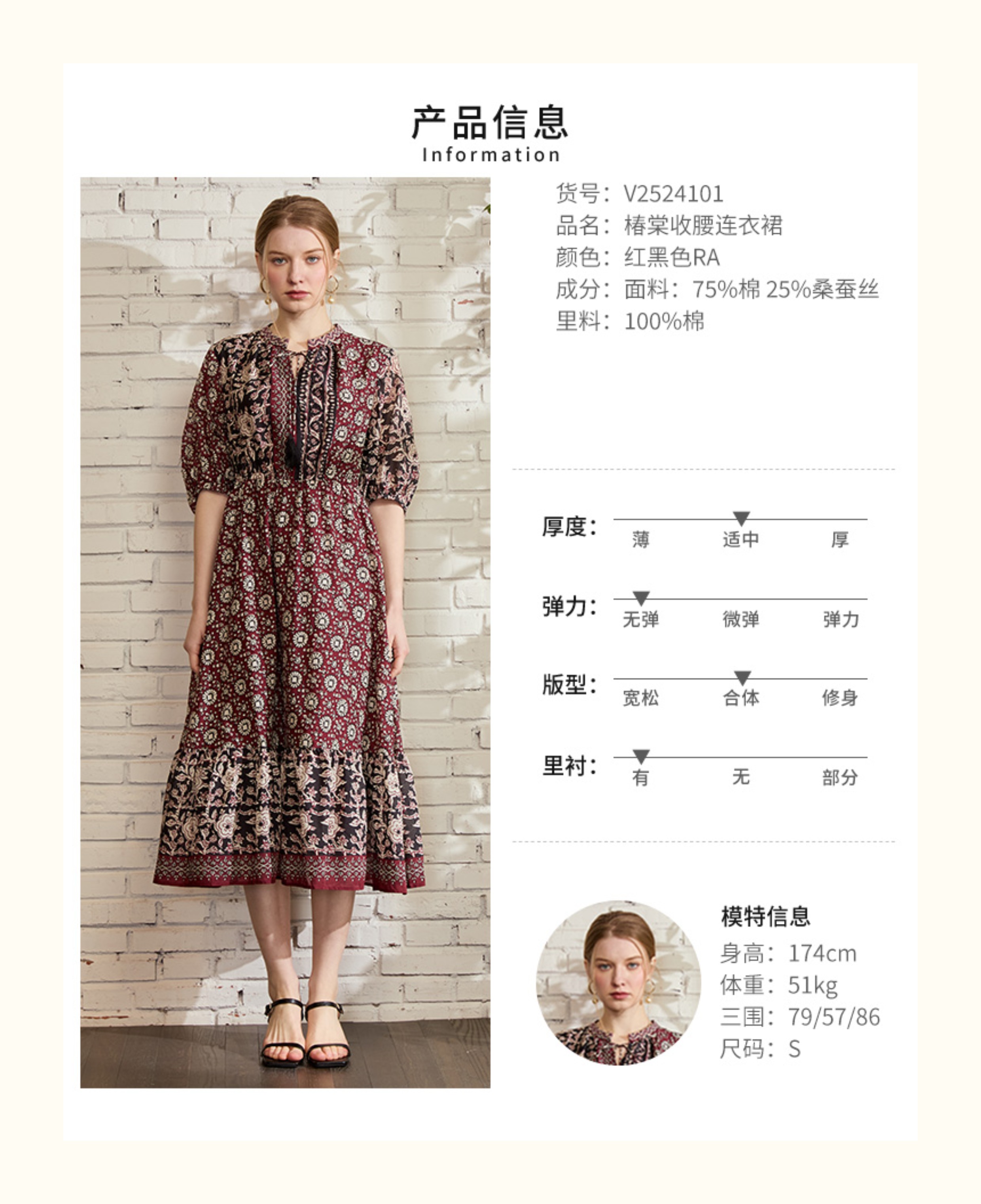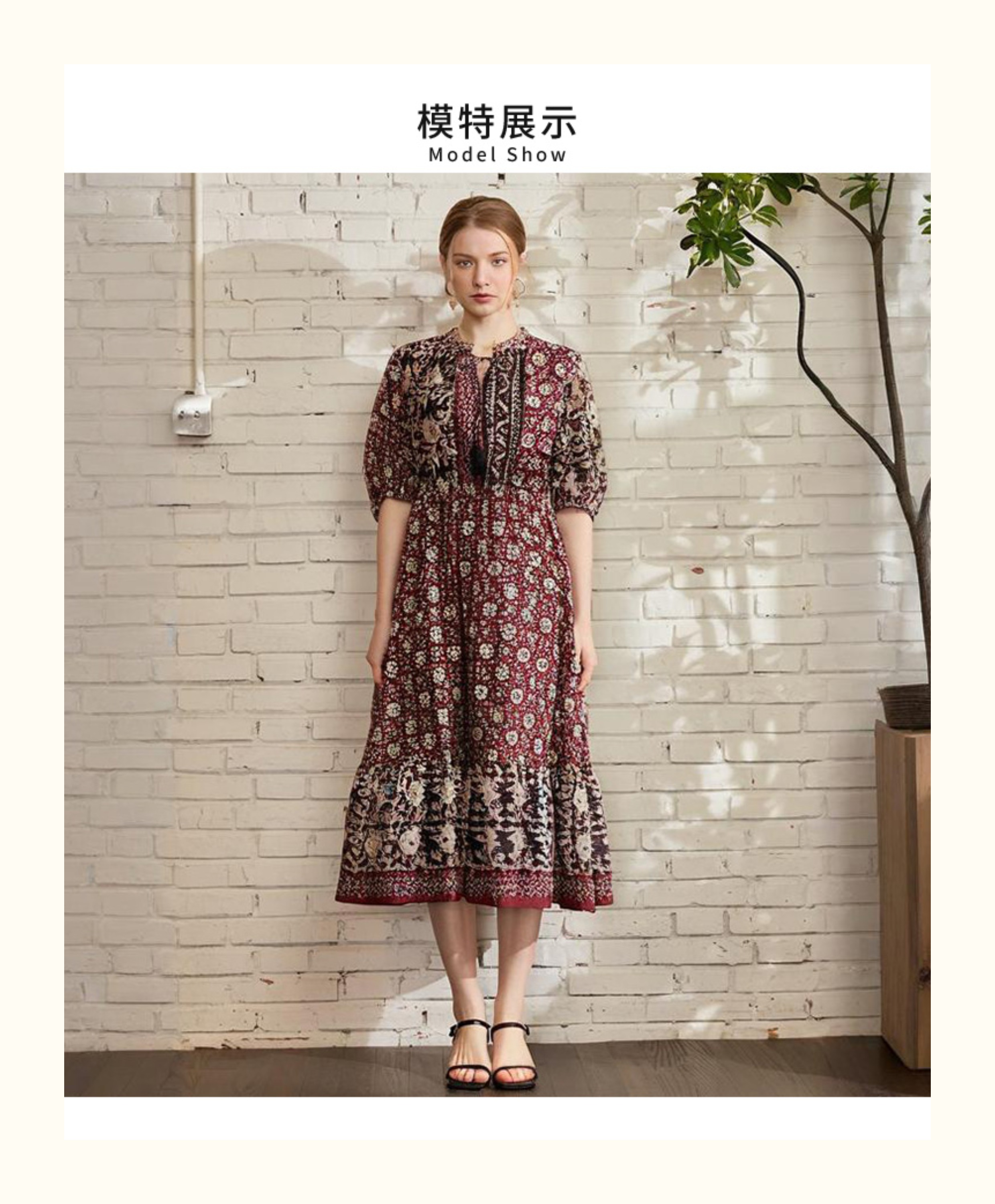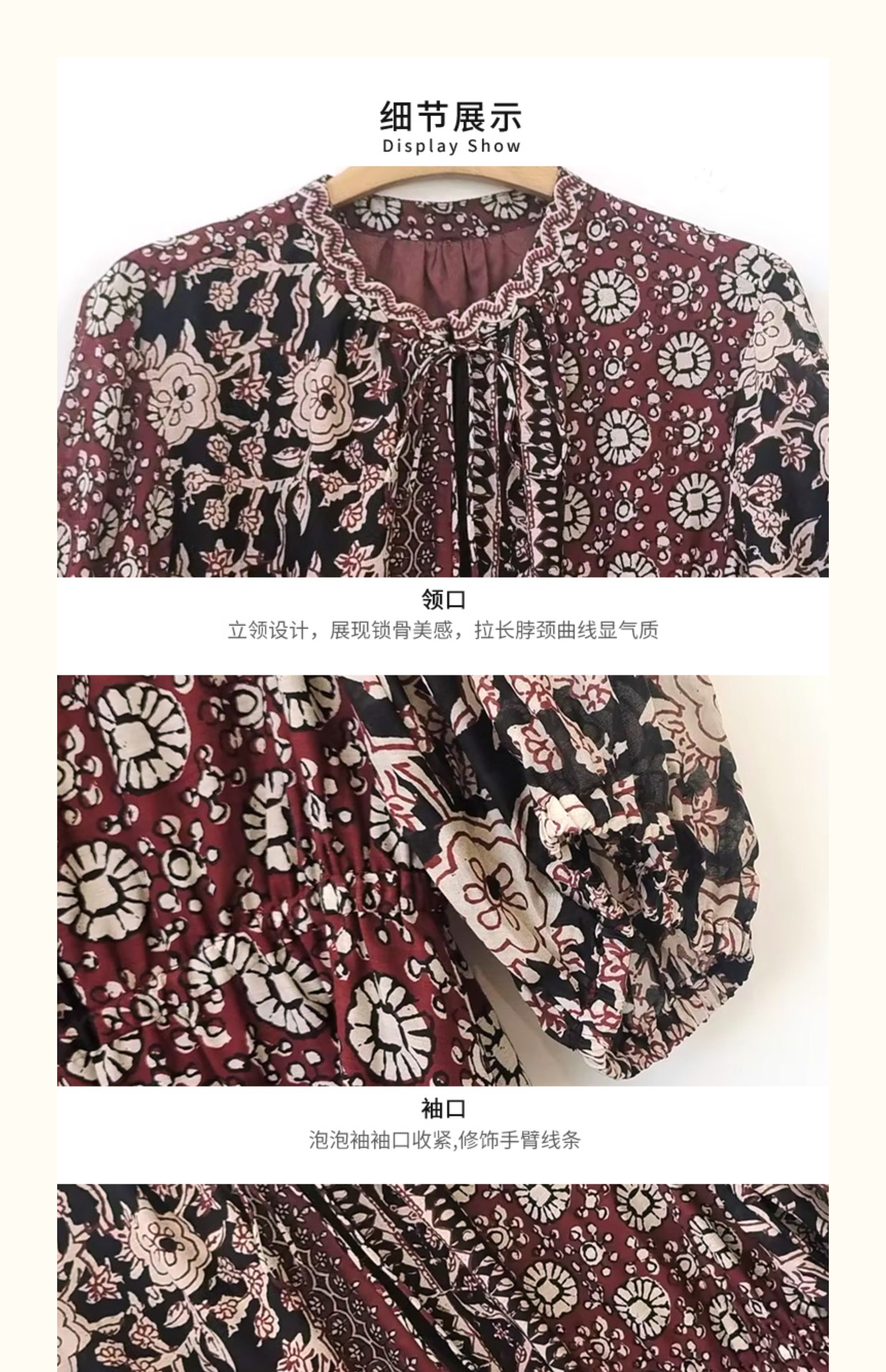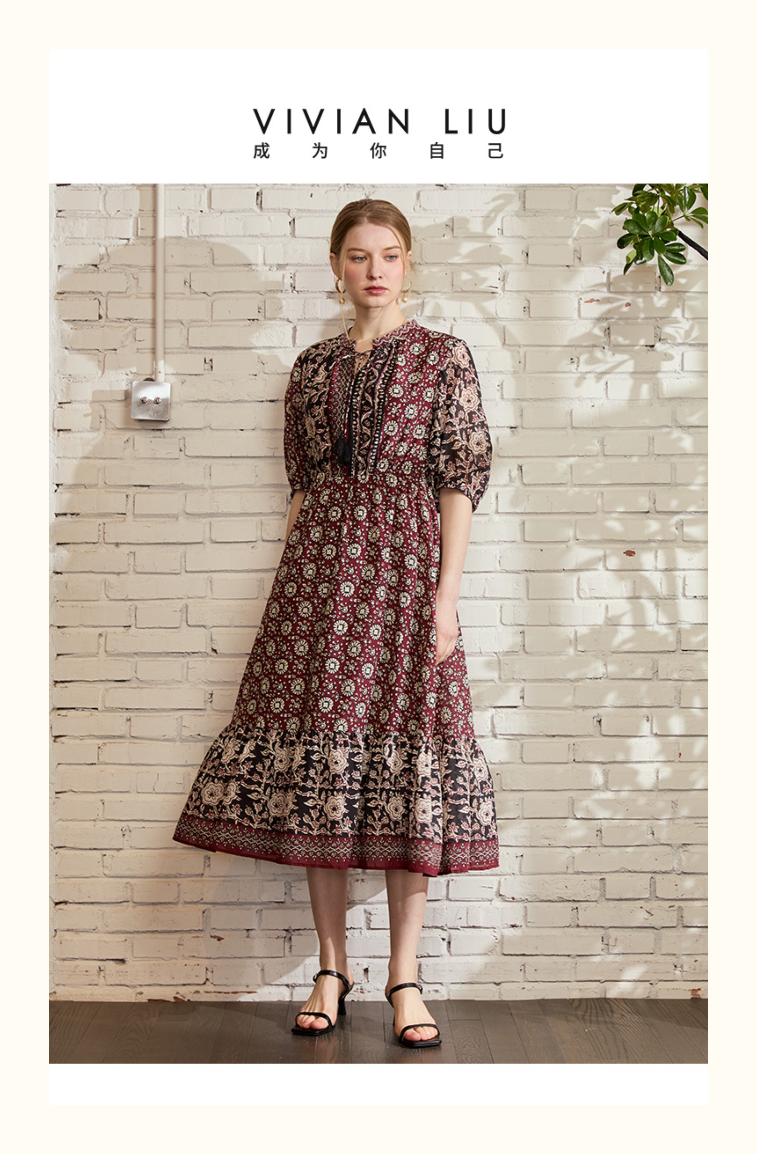 VIVIAN LIU V2524101 春季新款复古立领泡泡袖A字裙摆收腰连衣裙