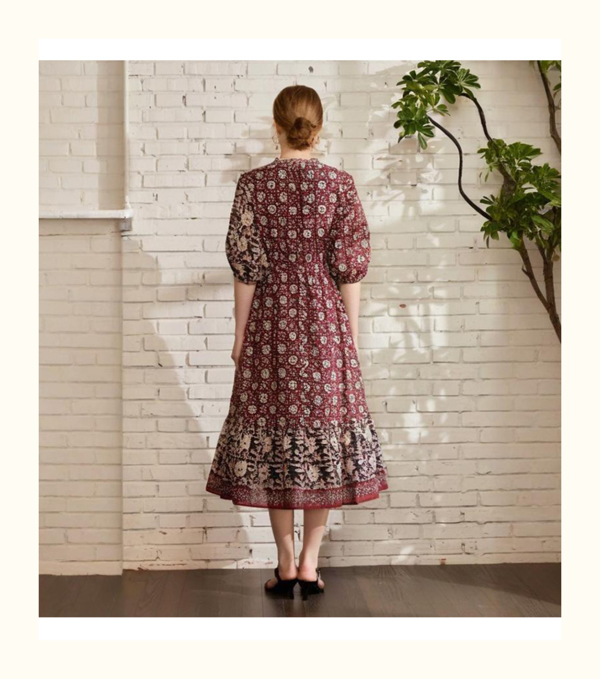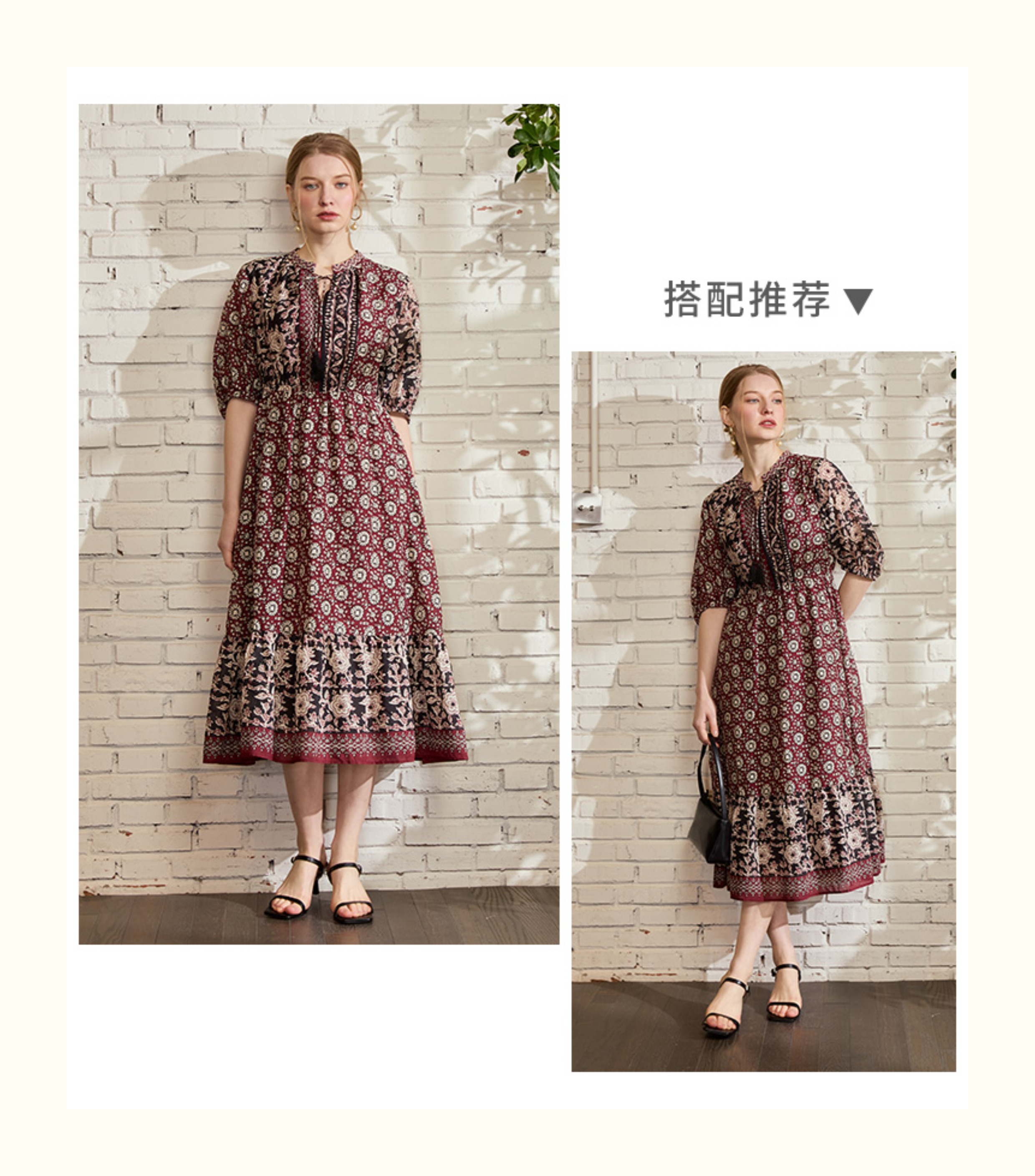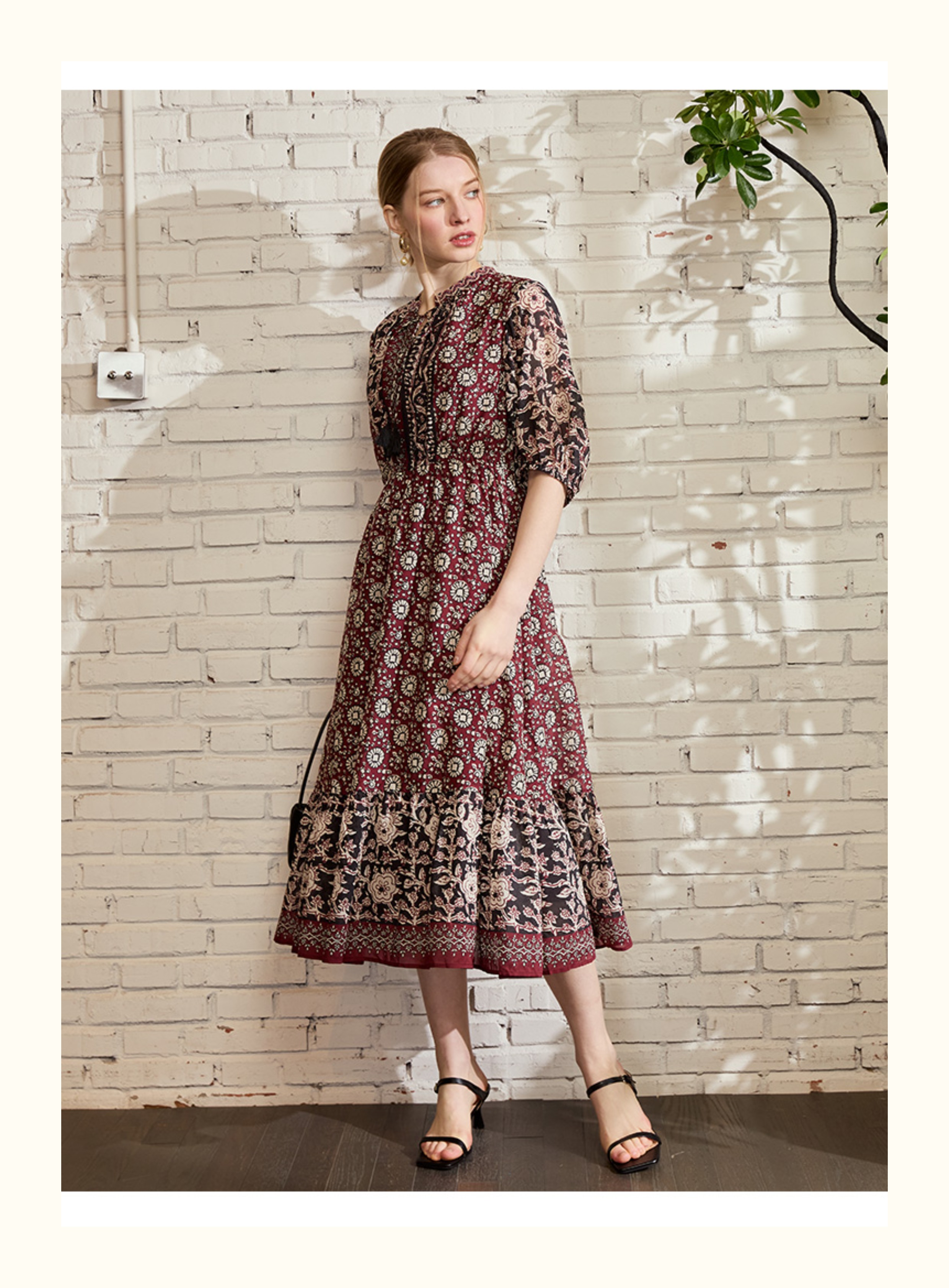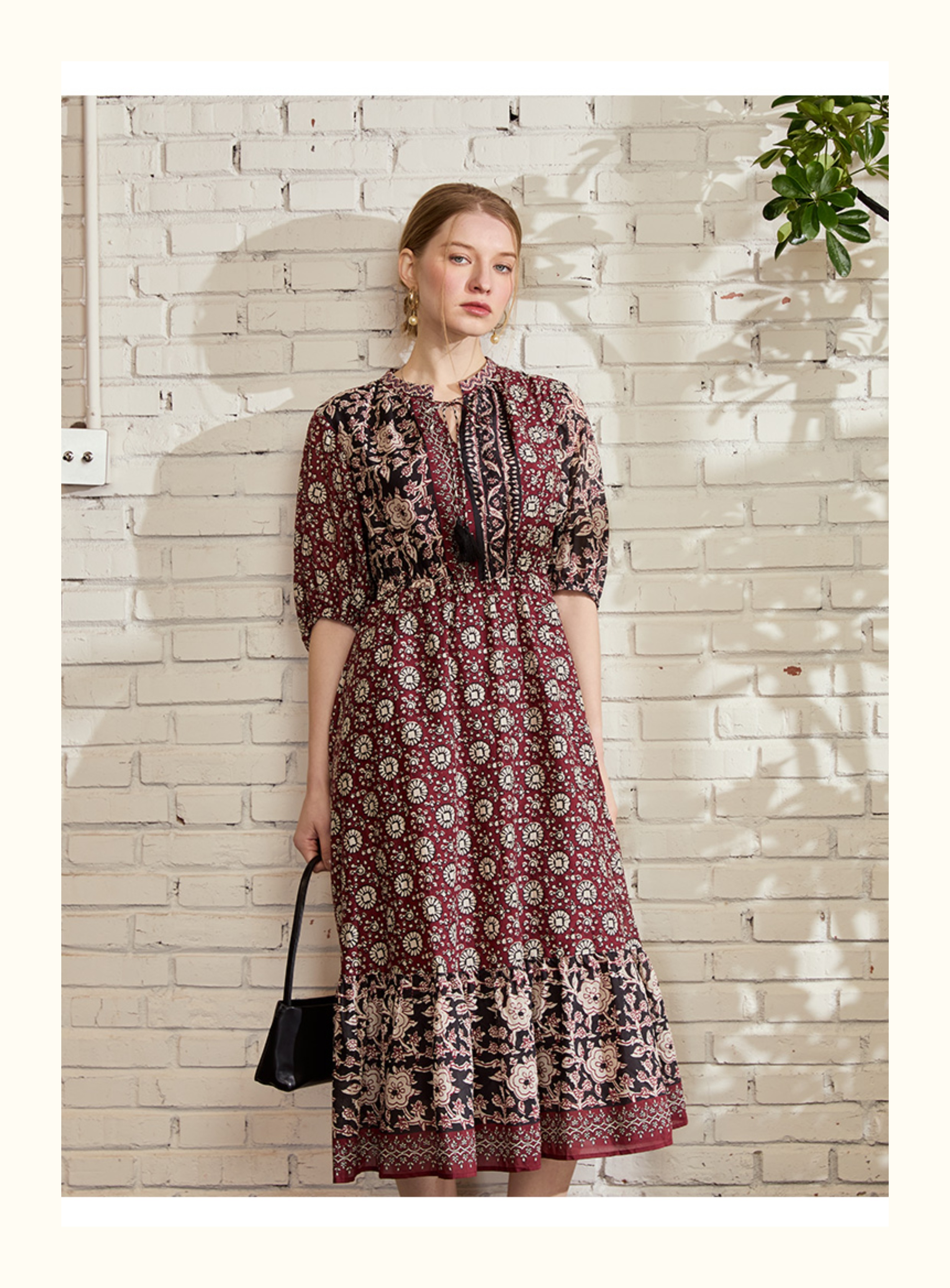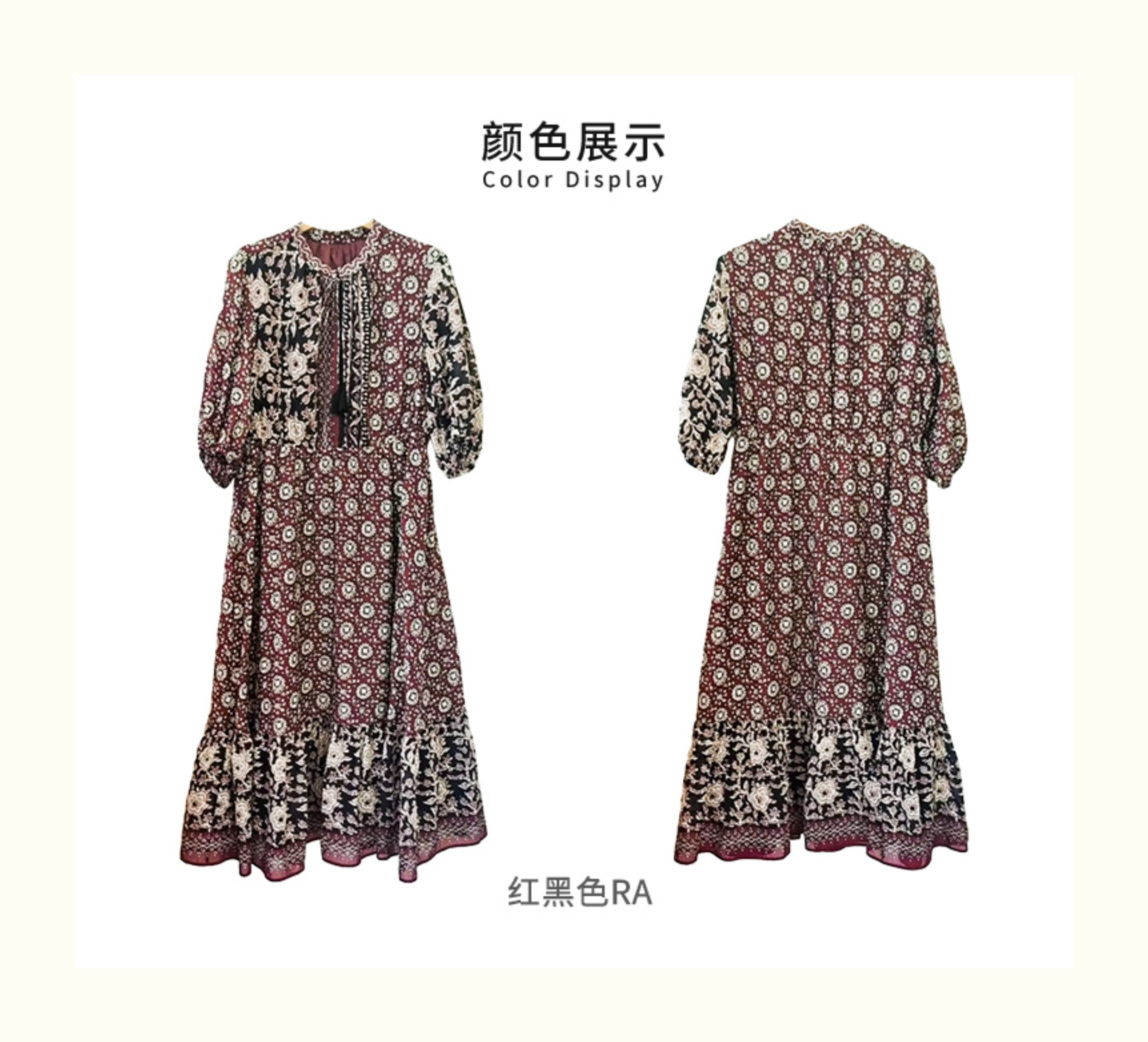 VIVIAN LIU V2524101 春季新款复古立领泡泡袖A字裙摆收腰连衣裙
