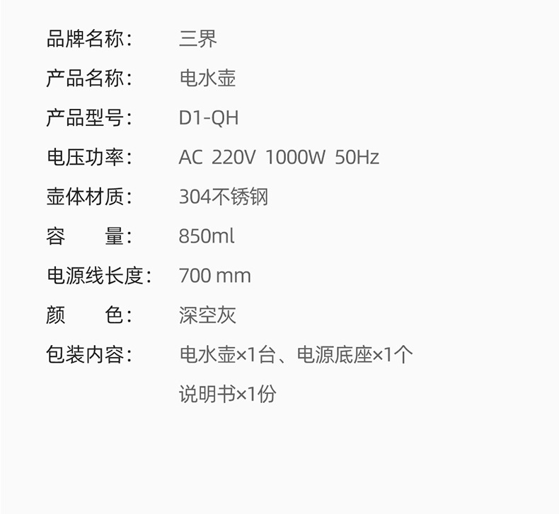 三界茶具电热水壶D1-QH/850ml