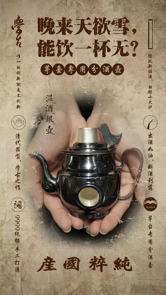 茅台专用分酒壶,清代器形,火锅造型,红红火火之意,999纯银手工打制,可榄碳提温,一壶二两,文气雅致 。