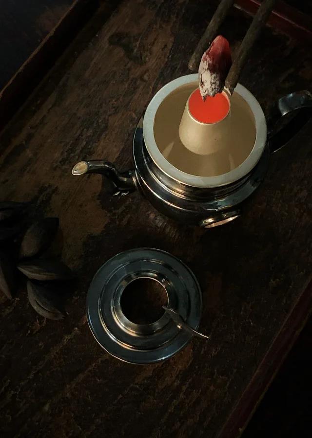 「学古」茅台分酒器,器型来源:清代铜火锅型分酒壶,二两容量,北方寒冷可投榄碳提温,999纯银手工打制。红红火火的火锅壶!“我们于日用必需的东西以外,必须还有一点无用的游戏与享乐,生活才觉得有意思。我们看夕阳,看秋河,看花,听雨,闻香,喝不求解渴的酒,吃不求饱的点心,都是生活上必要的——虽然是无用的装点,而且是愈精炼愈好。”这就是——“中国式雅致生活”。