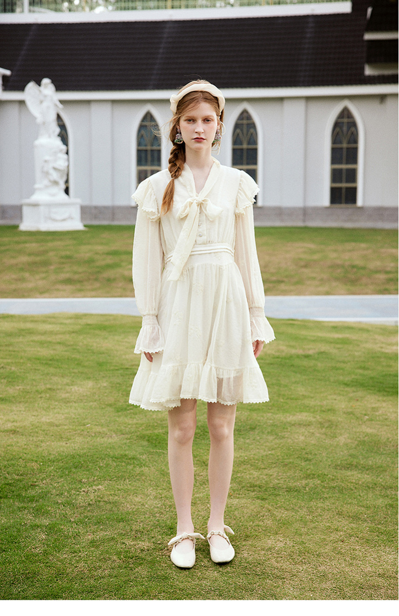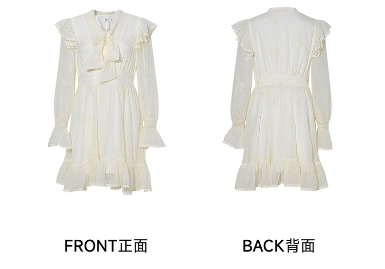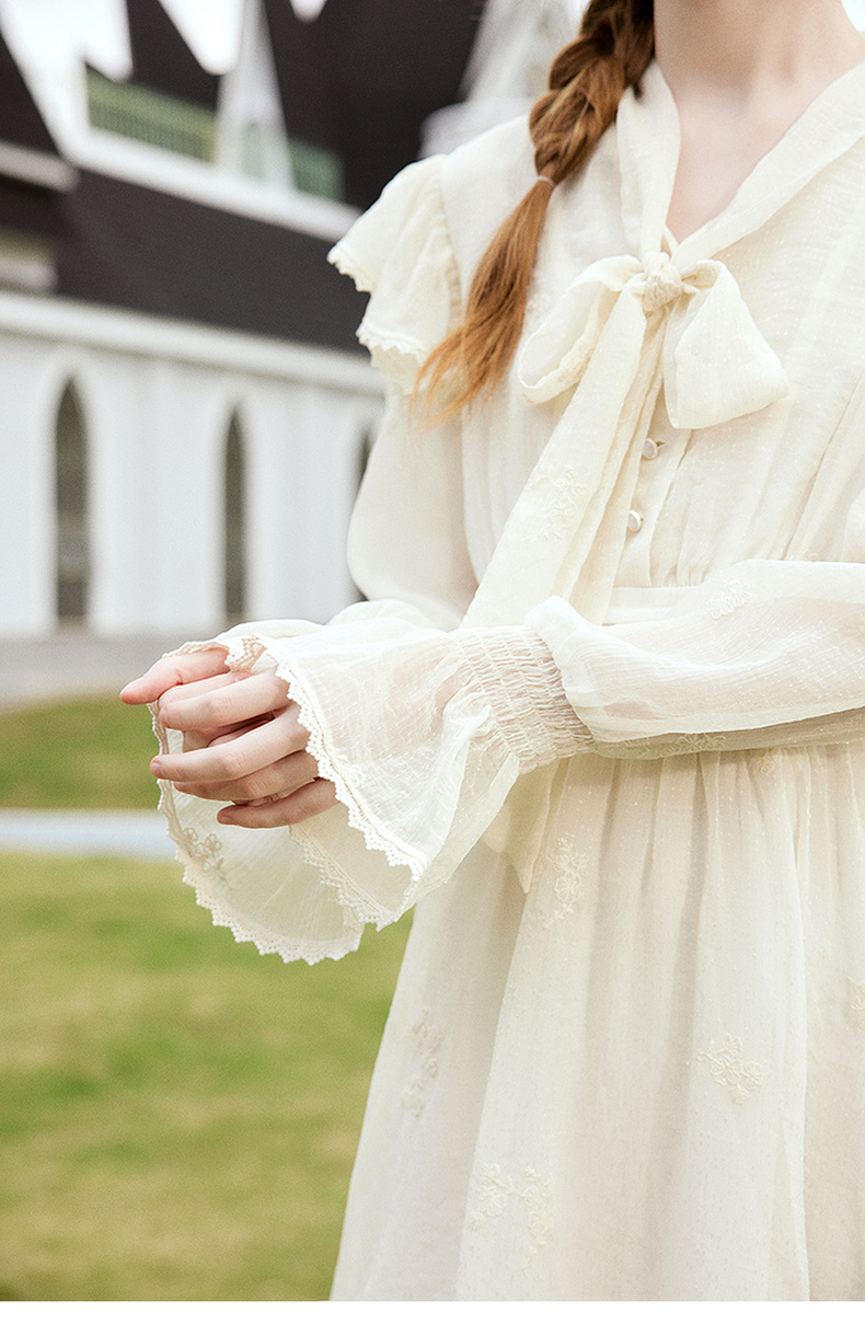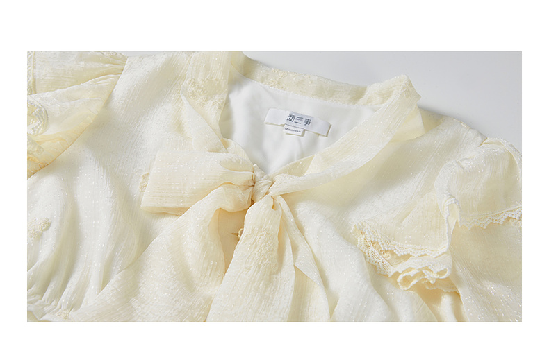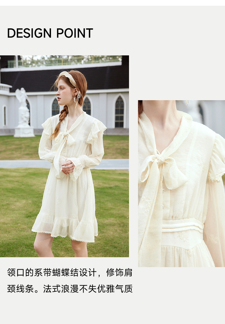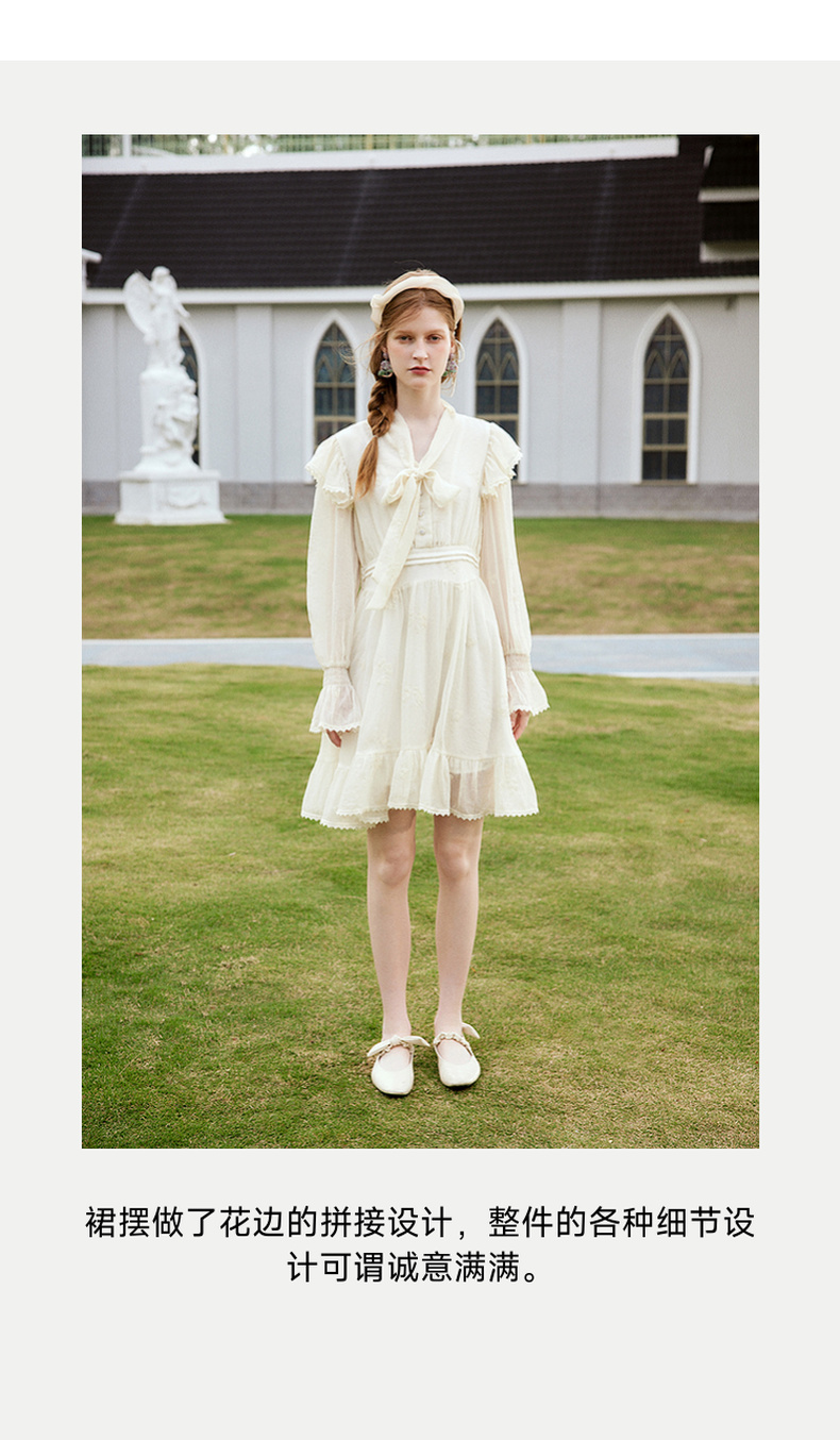 两三事月光岛绮旅2024夏季新款甜美绑带领荷叶边立体花纹连衣裙